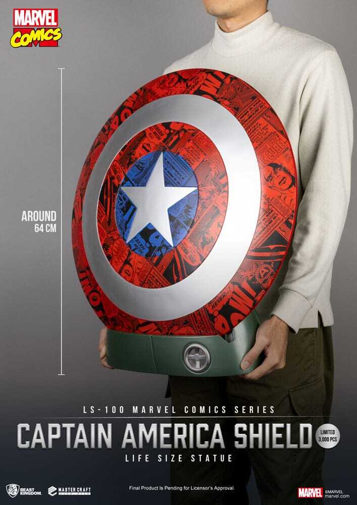 Aus hochwertigem PVC gefertigt und mit lebendiger Lackierung versehen, stellt es den Heldenmut und das Vermächtnis von Captain America getreu dar und ist damit eine beeindruckende Ergänzung für jede Ausstellung.