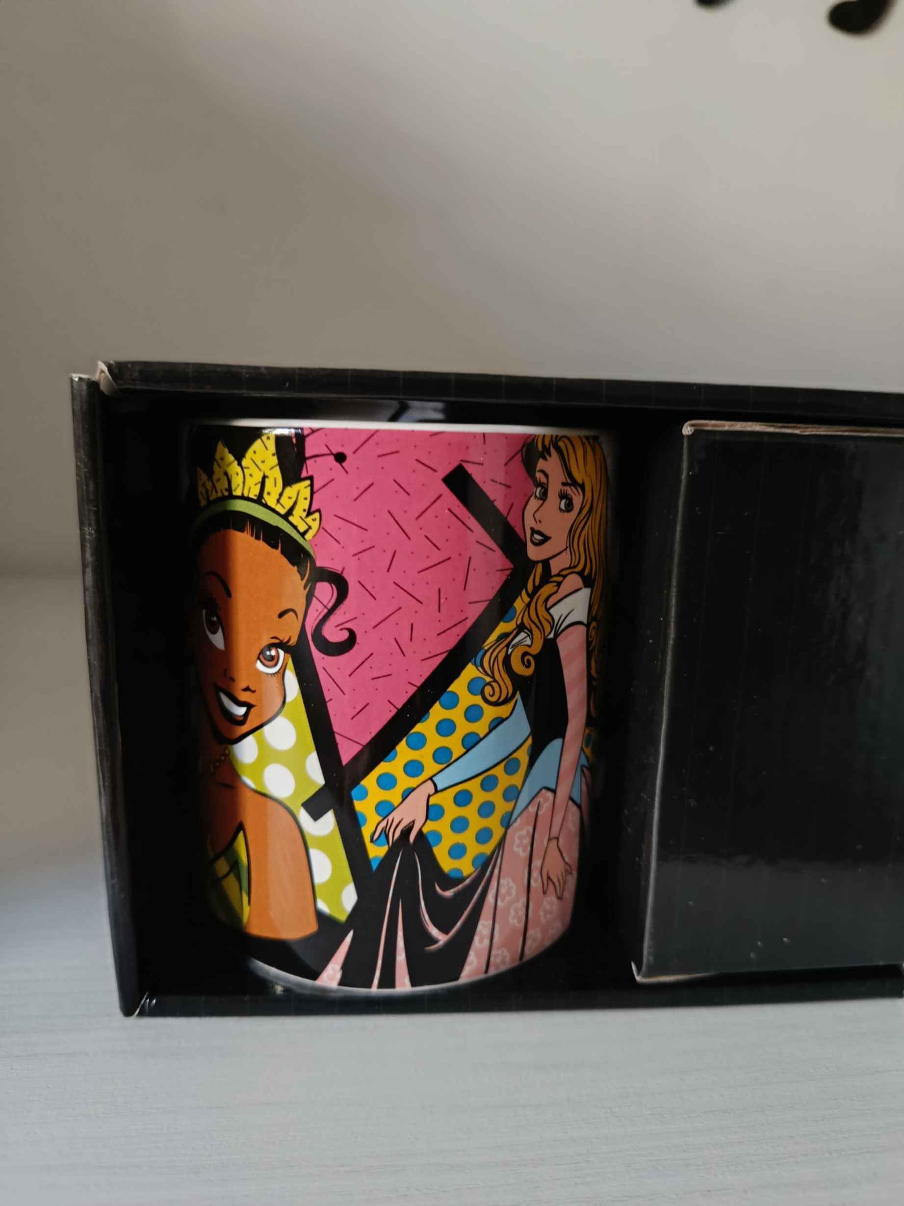 Die Prinzessinnen- Tasse von Disney Britto ist ein auffälliger Haushaltsgegenstand, der die ikonischen Designs der Disney-Figuren mit dem auffälligen Kunststil von Romero Britto kombiniert. Mit Ariel, Tiana, Aschenputtel und Aurora vor einem Hintergrund aus kräftigen Mustern und Farben ist diese Münze das perfekte Geschenk sowohl für Disney-Liebhaber als auch für Fans von Romero Brittos ikonischem Werk. Der herzförmige Griff und die Signatur am Innenrand machen dieses Stück zu einem wirklich einzigartigen Gegenstand, der für jedes Zuhause geeignet ist.