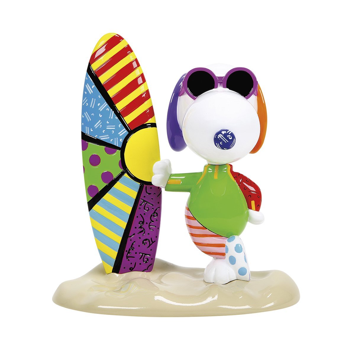 Romero Britto trifft auf die Peanuts in dieser fröhlichen Kollektion, die Kunst und Lebensfreude feiert. Joe Cool surft am South Beach in einem von Britto gestalteten Neoprenanzug neben einem von Britto inspirierten Surfbrett.