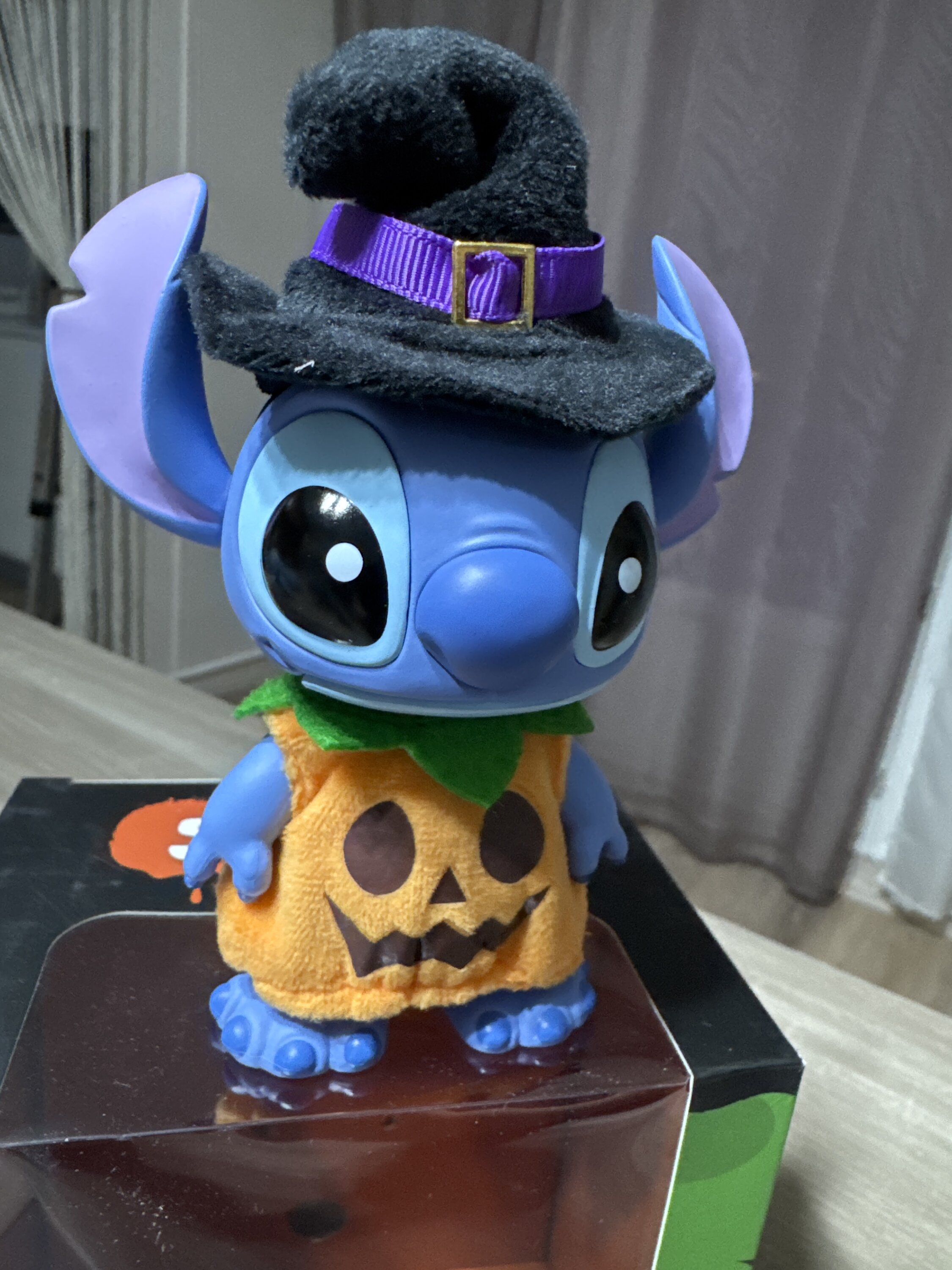 Die Stitch-Halloween-Kollektion ist echt cool. Diese Figur ist als Kürbis verkleidet und erinnert mich ein bisschen an „Uhrwerk Orange“!