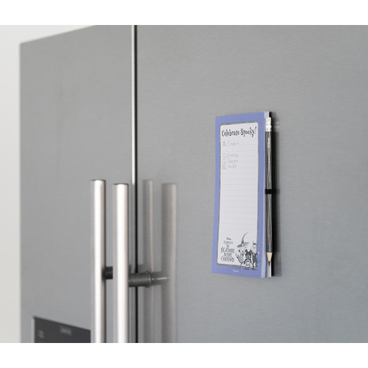 Es hat zwei große Magnete auf der Rückseite, sodass es sicher bleibt, wo immer Sie es hinlegen. Es enthält 65 heraustrennbare Seiten und einen passenden Bleistift.
