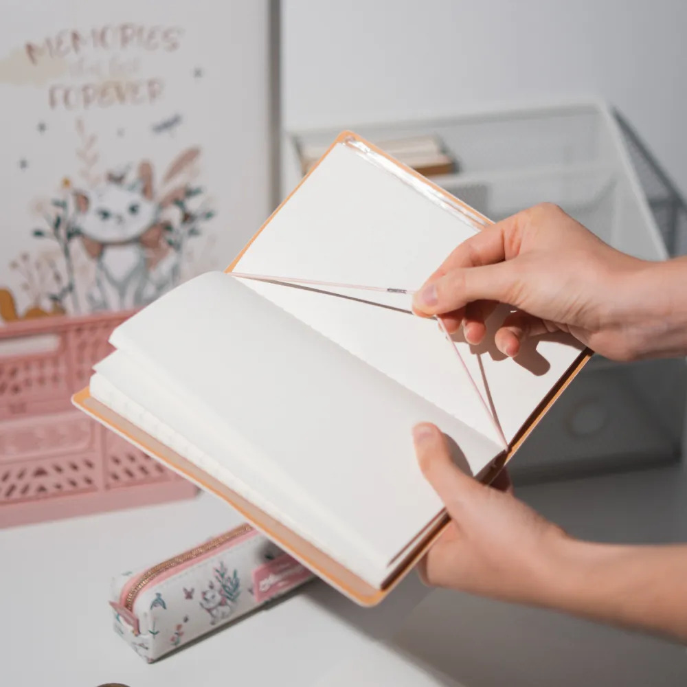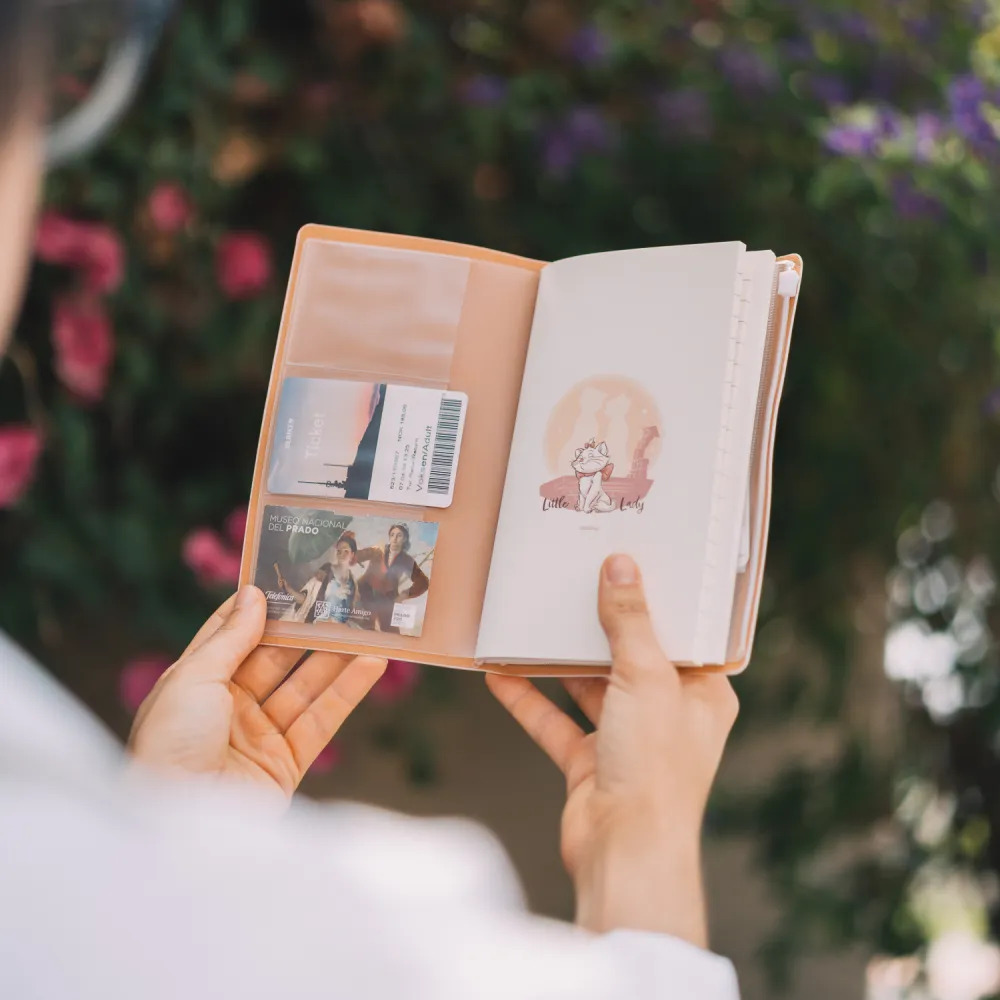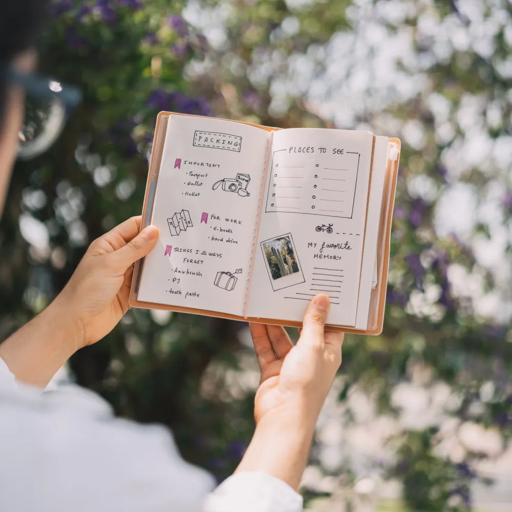 Reisetagebuch mit weichem Polyurethan-Einband. Enthält ein Kartenfach, zwei Notizbücher mit je 80 Blatt (160 Seiten) in zwei verschiedenen Papiersorten (liniert und kugelgeschrieben) sowie eine Innentasche auf der Rückseite. Mit Gummibandverschluss und Polyurethan-Druckknopf.