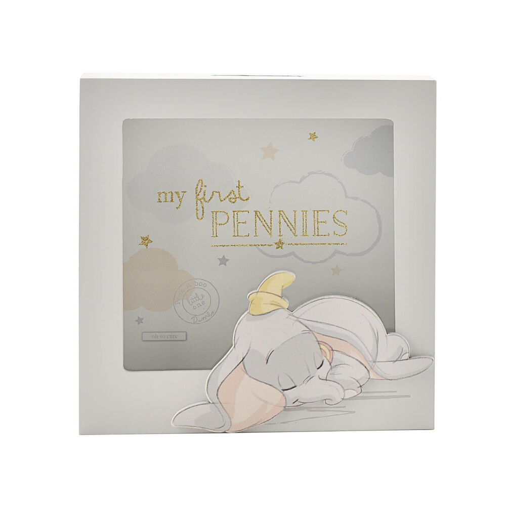 Diese wunderschöne Spardose hilft Eltern, für den kleinen Schatz ihres neuen Familienmitglieds zu sparen. Die hölzerne Spardose mit Fenster ist grau lackiert und mit einer niedlichen Buntstiftzeichnung eines schlafenden Dumbo verziert. Oben befindet sich ein Münzeinwurf. Auf der abnehmbaren Rückwand steht in goldenen Glitzerbuchstaben „Meine ersten Pennys“ vor einem Hintergrund aus pastellfarbenen Wolken und Sternen.
