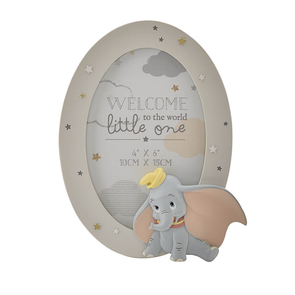 Dieser bezaubernde Rahmen aus der Kollektion „Magical Beginnings“ ist ein wertvolles Erinnerungsstück zur Geburt eines Kindes. Mit seiner sanften grauen Oberfläche und der einzigartigen ovalen Öffnung ist dieser handbemalte, freistehende Rahmen aus Kunstharz ein Blickfang in jedem Raum. Er zeigt eine markante 3D-Darstellung von Dumbo sowie funkelnde Sterne rund um den Rahmen.