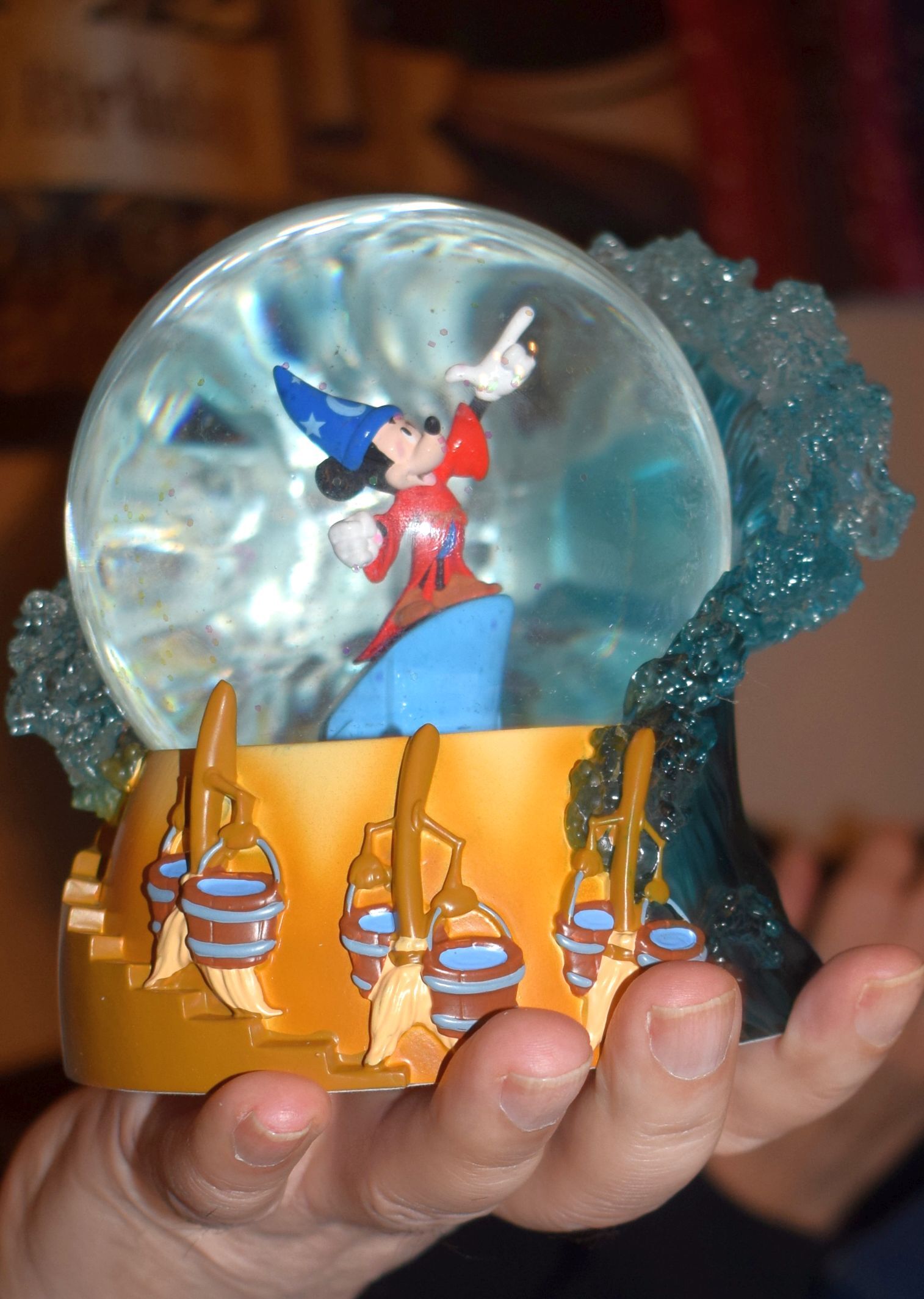 Feiern Sie den 85. Jahrestag von Walt Disneys Zeichentrick-Meisterwerk Fantasia mit dieser 100 mm großen Wasserkugel, die den Zauberlehrling Mickey Maus zeigt, der mit seinen magischen Besen und tosenden Wellen aus klarem Harz über das Wasser gebietet.