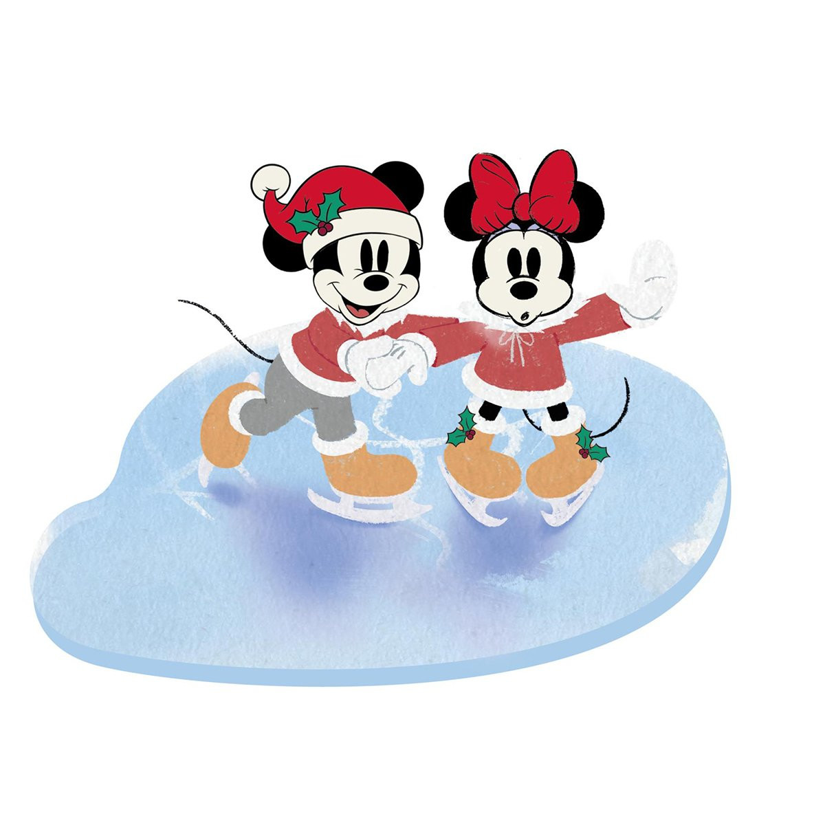 Mickey Maus und Minnie Maus feiern die Feiertage in dieser festlichen Weihnachtsszene. Mickey hält Minnie fest, während sie über den Teich gleitet.