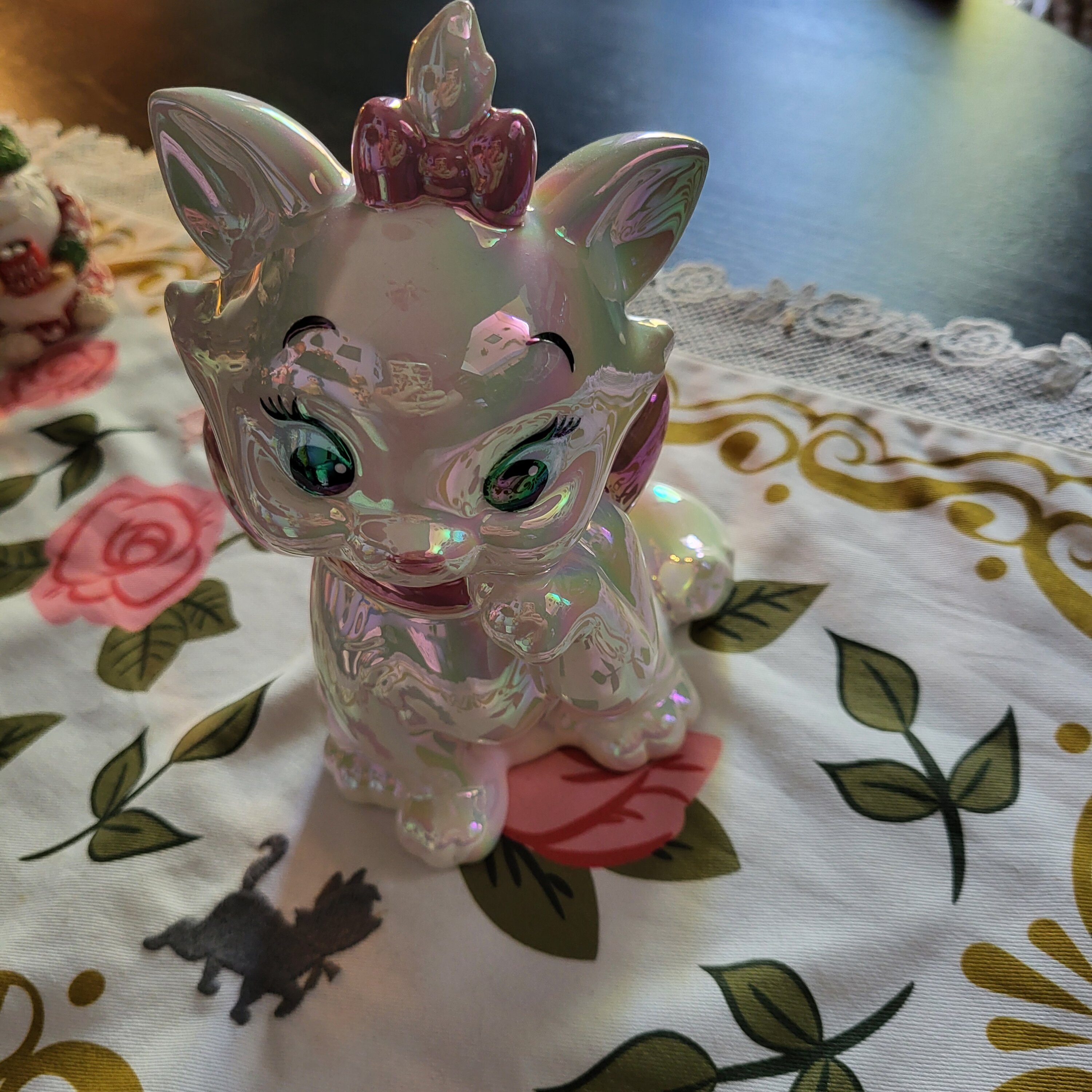 Marie, das süße Kätzchen aus Disneys Zeichentrickklassiker „Die Aristocats“ , ist in dieser geformten und handgemalt Spardose aus Keramik abgebildet. Ein spezielles Galvanisierungsverfahren verleiht Marie einen einzigartigen und sehr ansprechenden schillernden Glanz.
