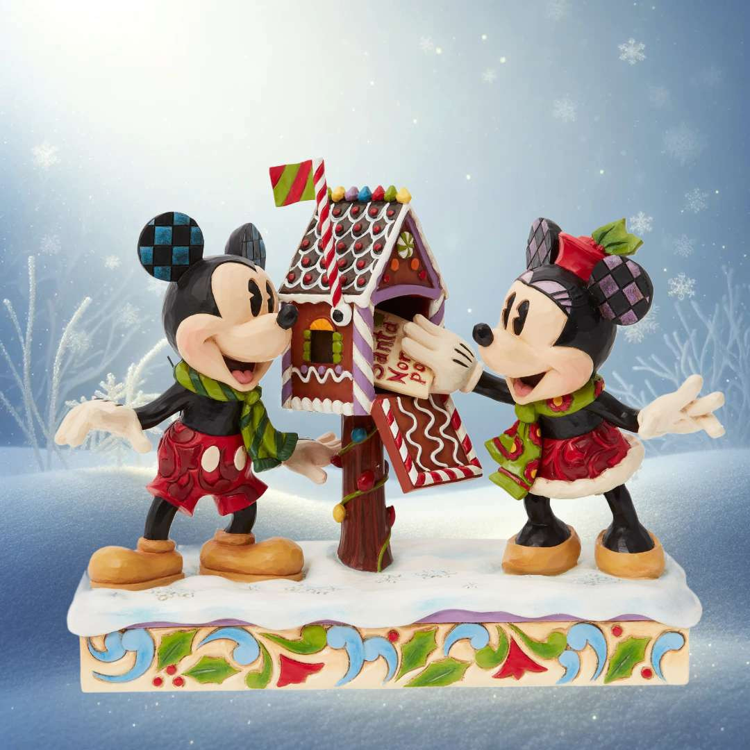 Mickey und Minnie Mouse kommen mit Disney Traditions von Jim Shore in Weihnachtsstimmung. Eine wunderschöne festliche Figur mit dem ikonischen Paar, das seinen Weihnachtsbrief an den Weihnachtsmann verschickt. Handgeschnitzt und bemalt.