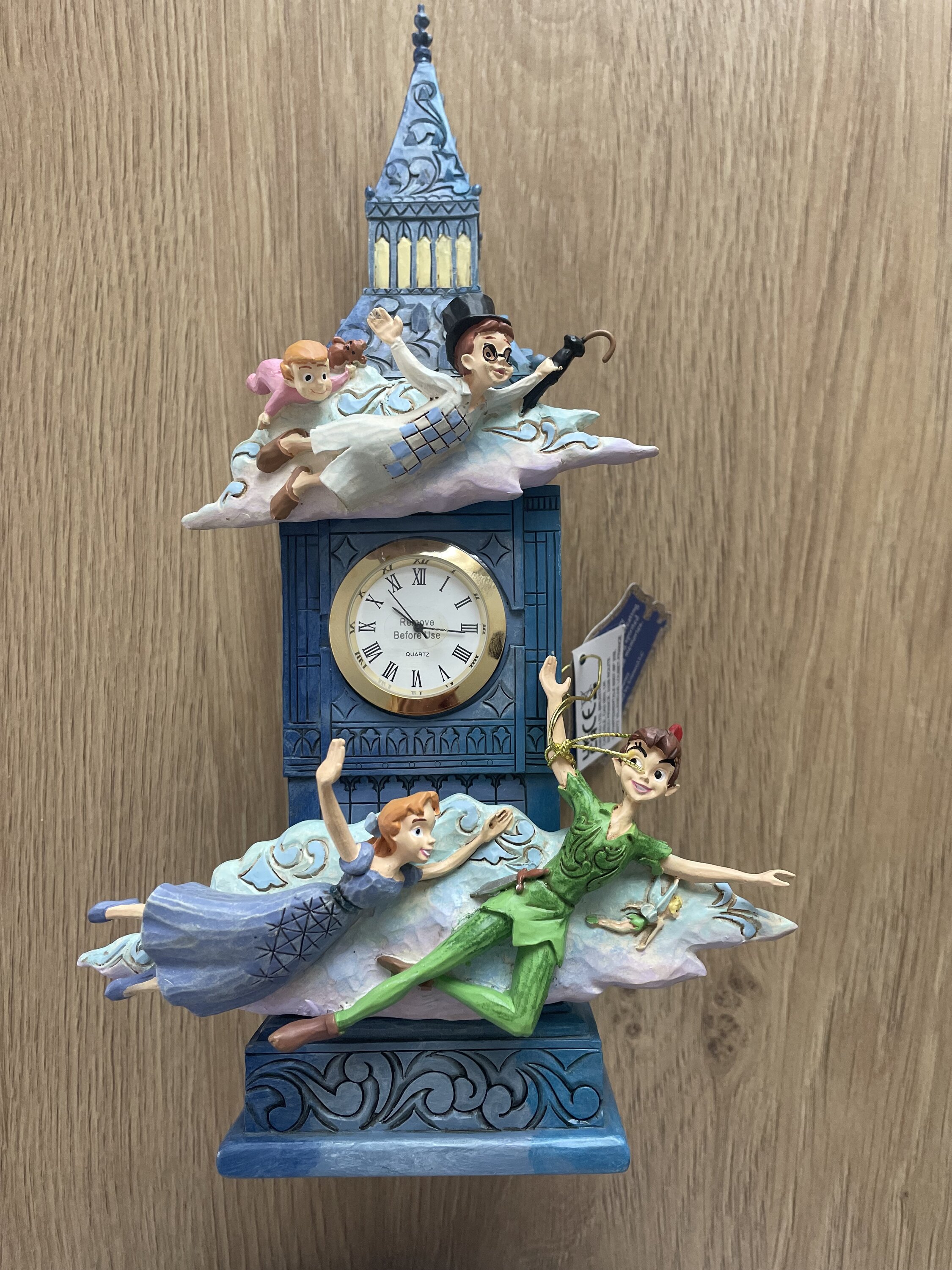 Diese unglaubliche Uhrenkreation von Jim Shore verfügt über ein funktionales Zifferblatt in Form einer Mini- Big Ben -Uhr. Peter Pan, Tinkerbell, Wendy, John und Michael fliegen mit der Kraft froh Gedanken und Feenstaub durch den Himmel in der Nähe des Turms.