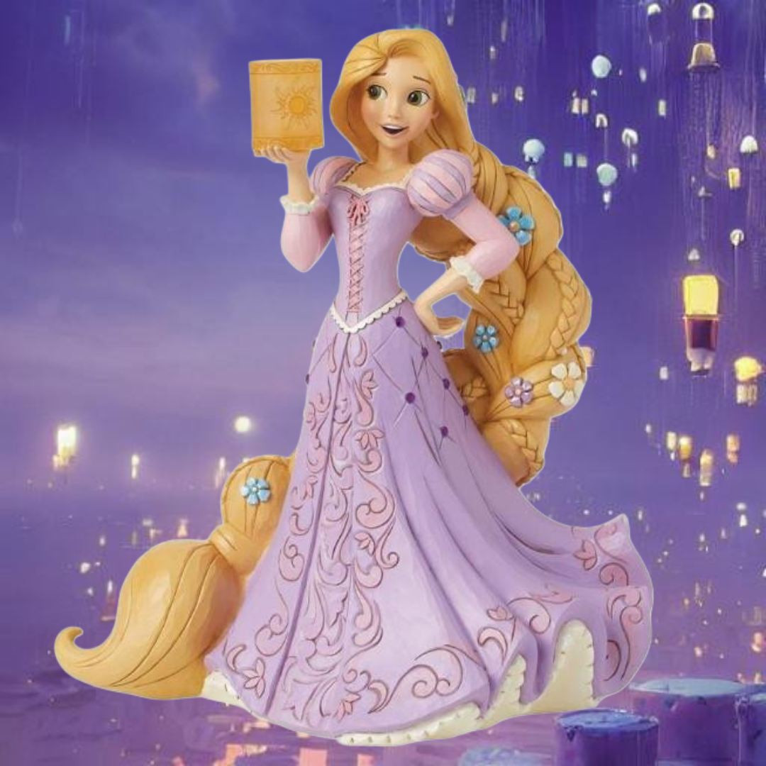 Als 8. in der Reihe „Enchanted Princess“ zeigt dieses Werk von Jim Shore Rapunzel in einem Moment der Verzauberung. Geschmückt mit einem fließenden rosa Kleid und zarten Blumen hält sie eine Papierlaterne und strahlt einen sanften Schein der Hoffnung und des Staunens aus.