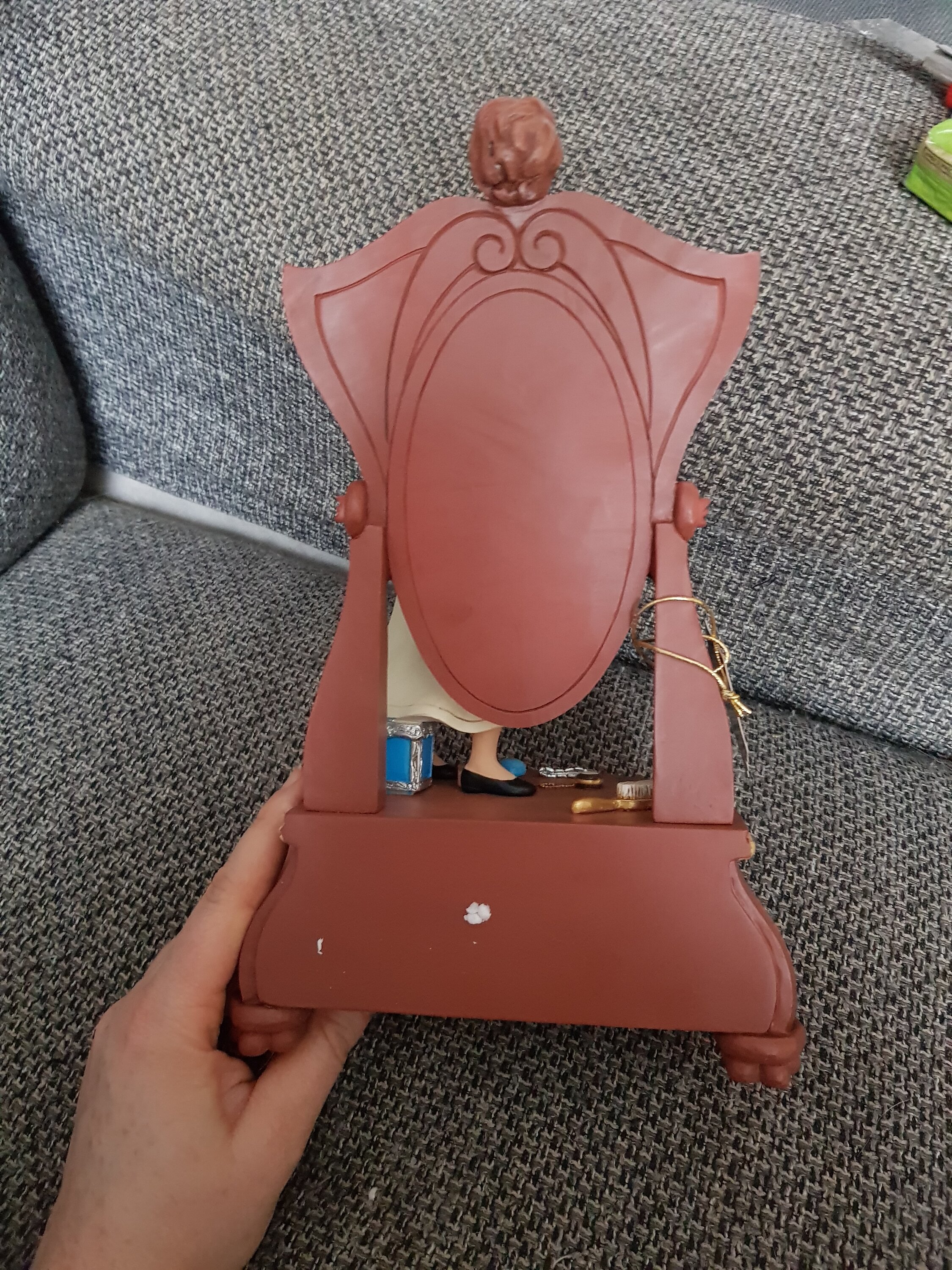 Hier ist die einzige Darstellung, die ich von Ursula in ihrer menschlichen Form, auch bekannt als Vanessa, finde... Die Details sind großartig, auf der Kommode mit dem Pinsel der Schmuck, wirklich sehr fein... Das Spiegelbild von Vanessa im Spiegel zeigt ein Bild von Ursula, die auf dem Spiegel klebt...genau wie im Cartoon!