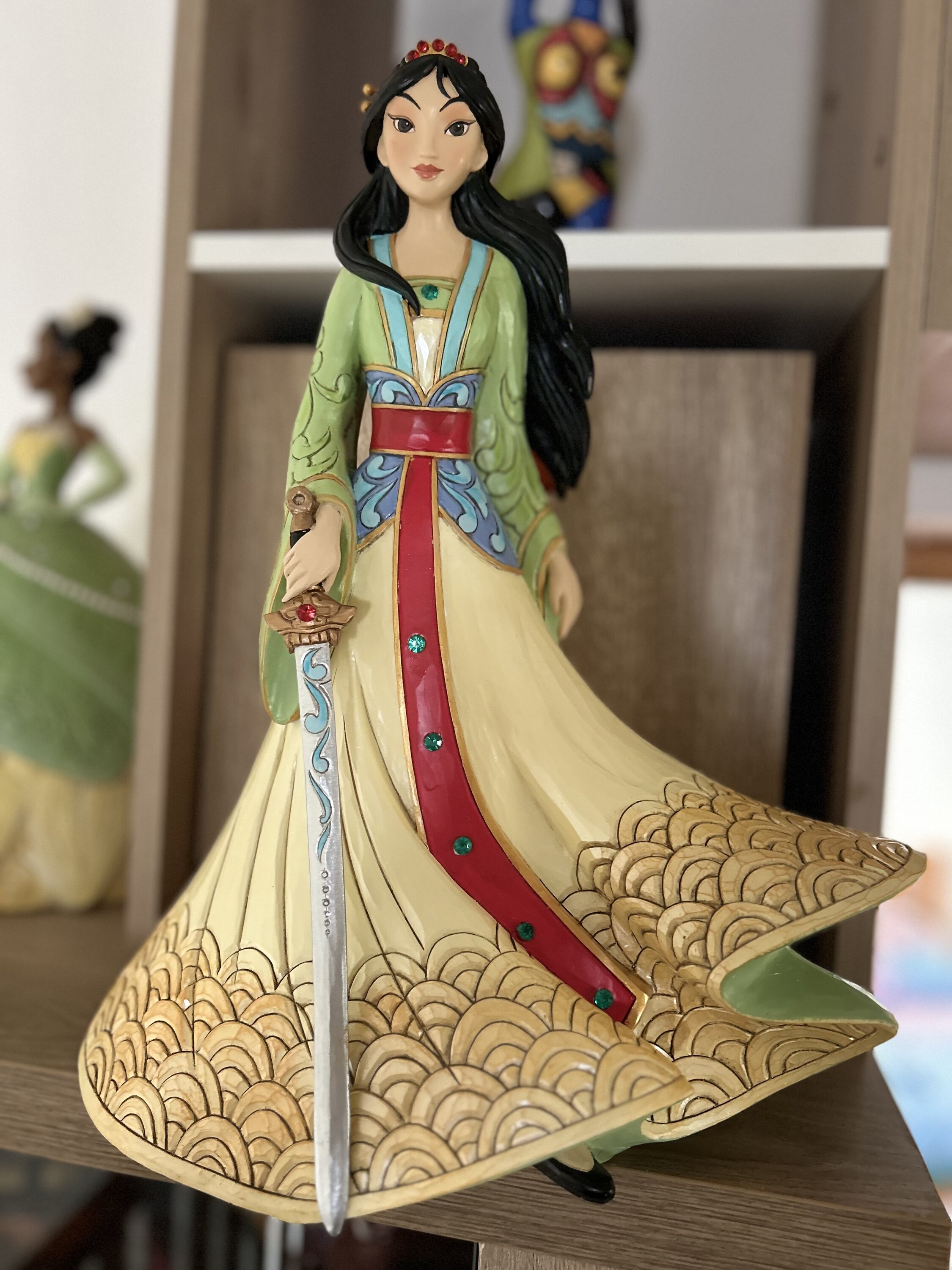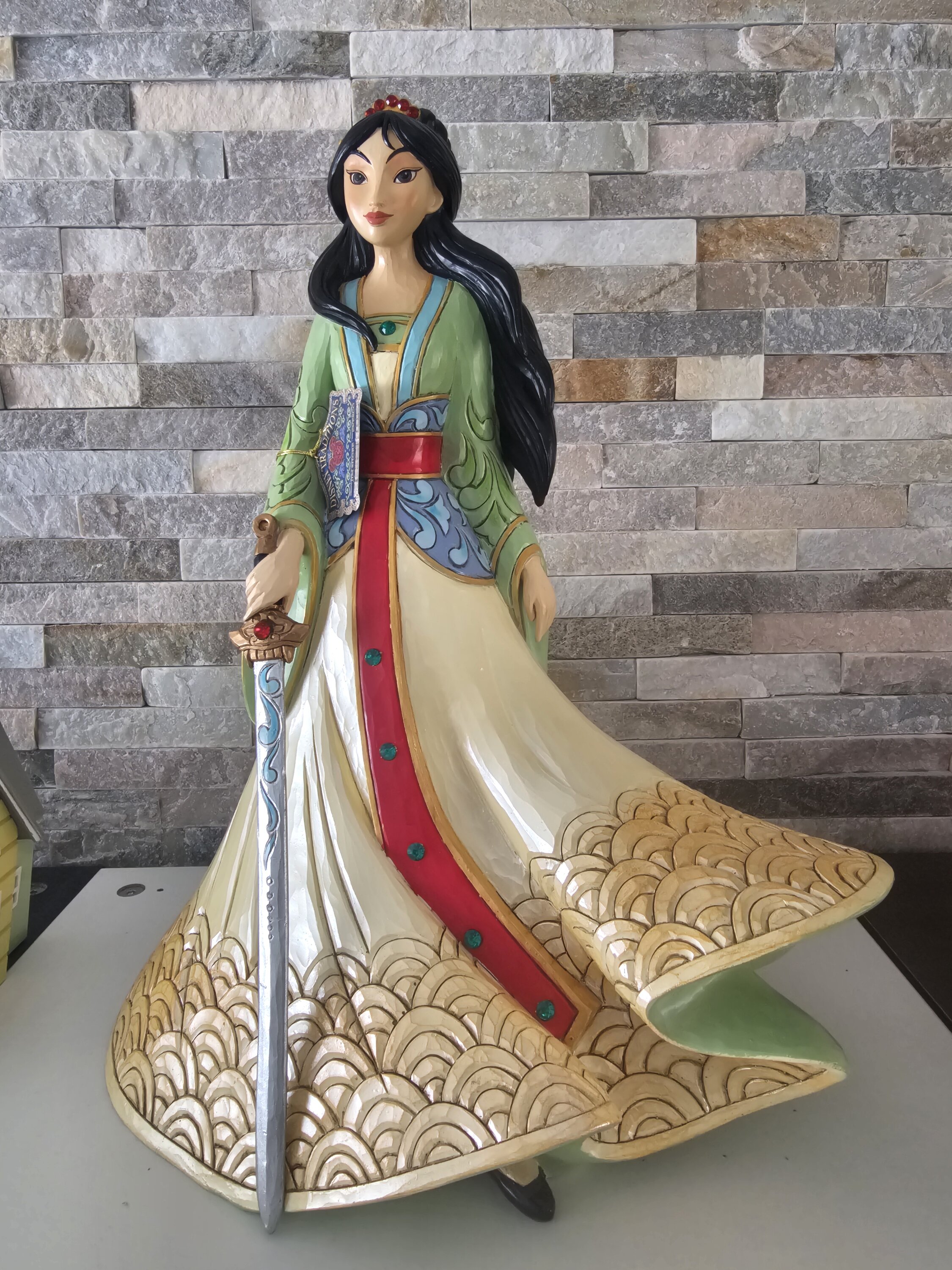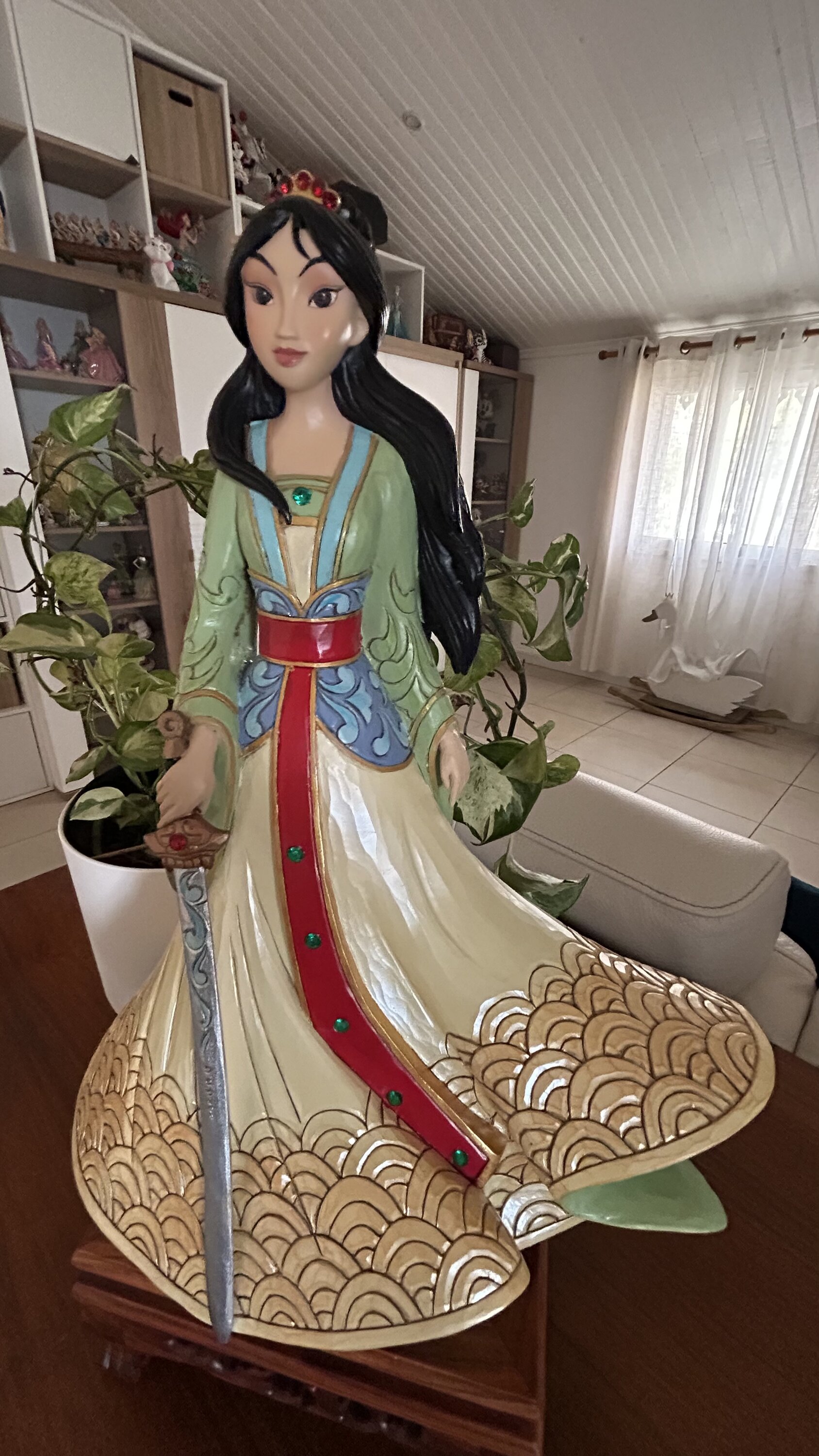 Cette figurine est grande est belle. Avec sa robe, ses cheveux aux vents et son épée, Mulan est magnifique.