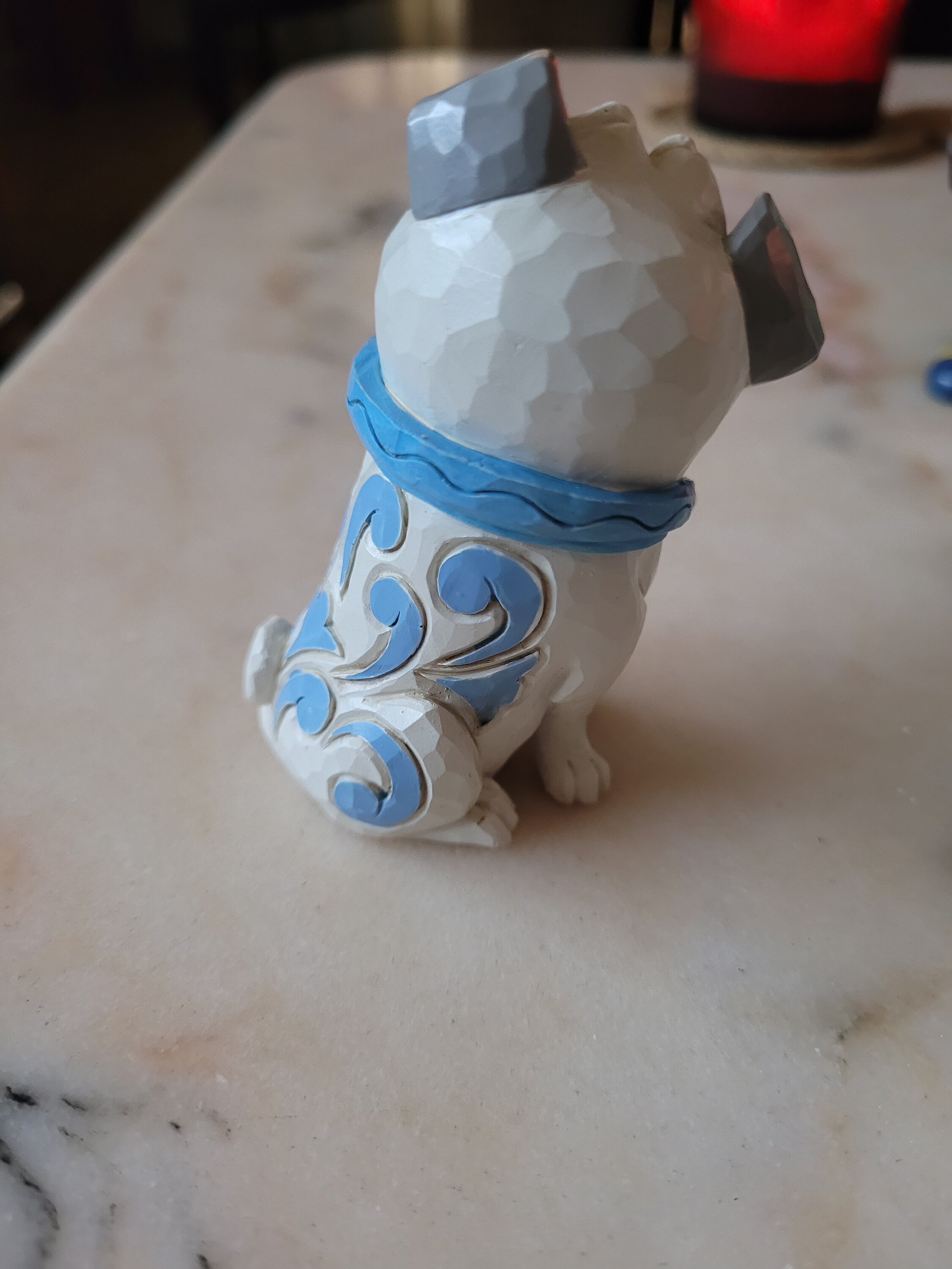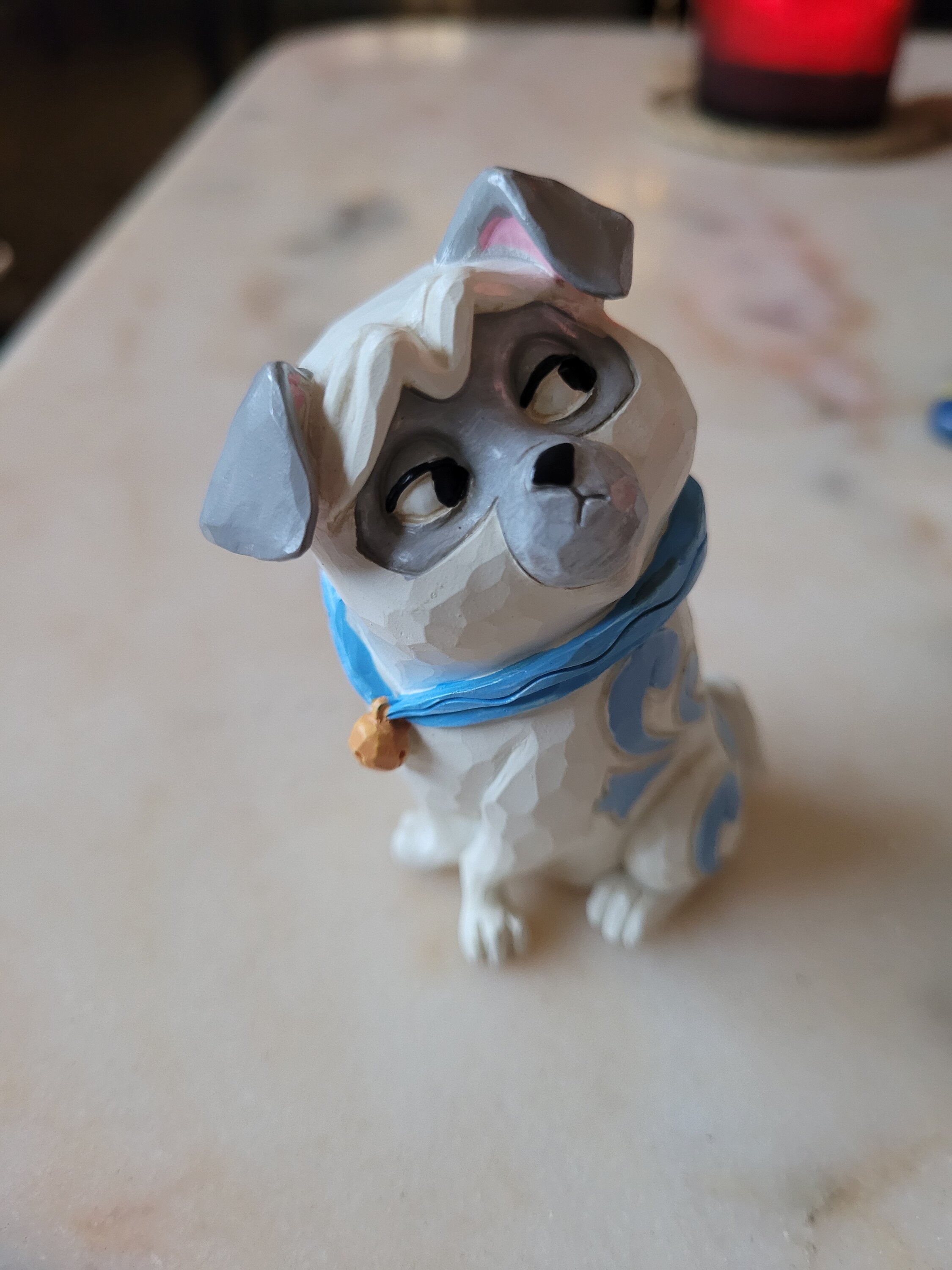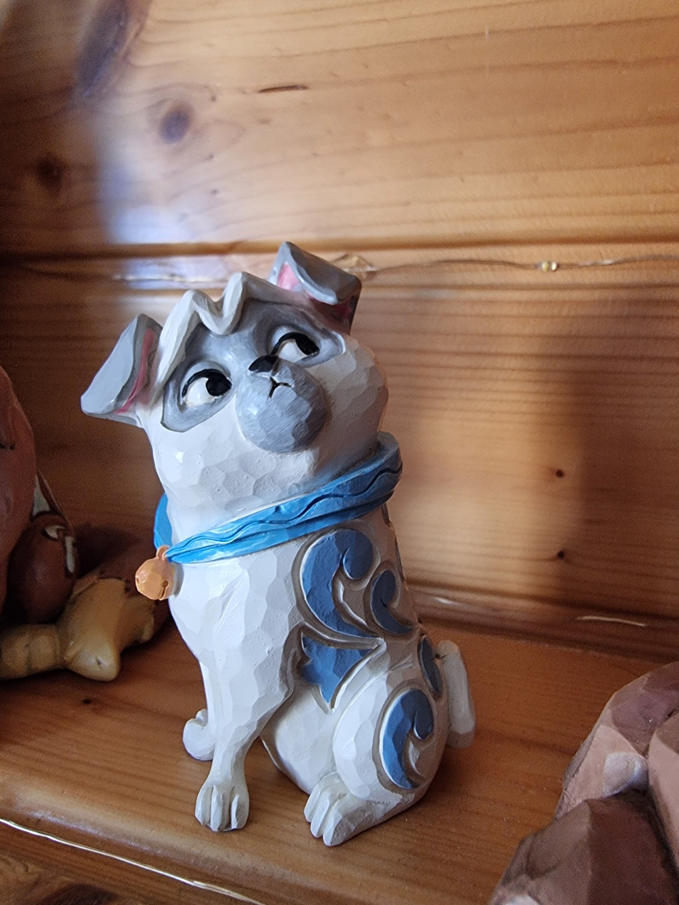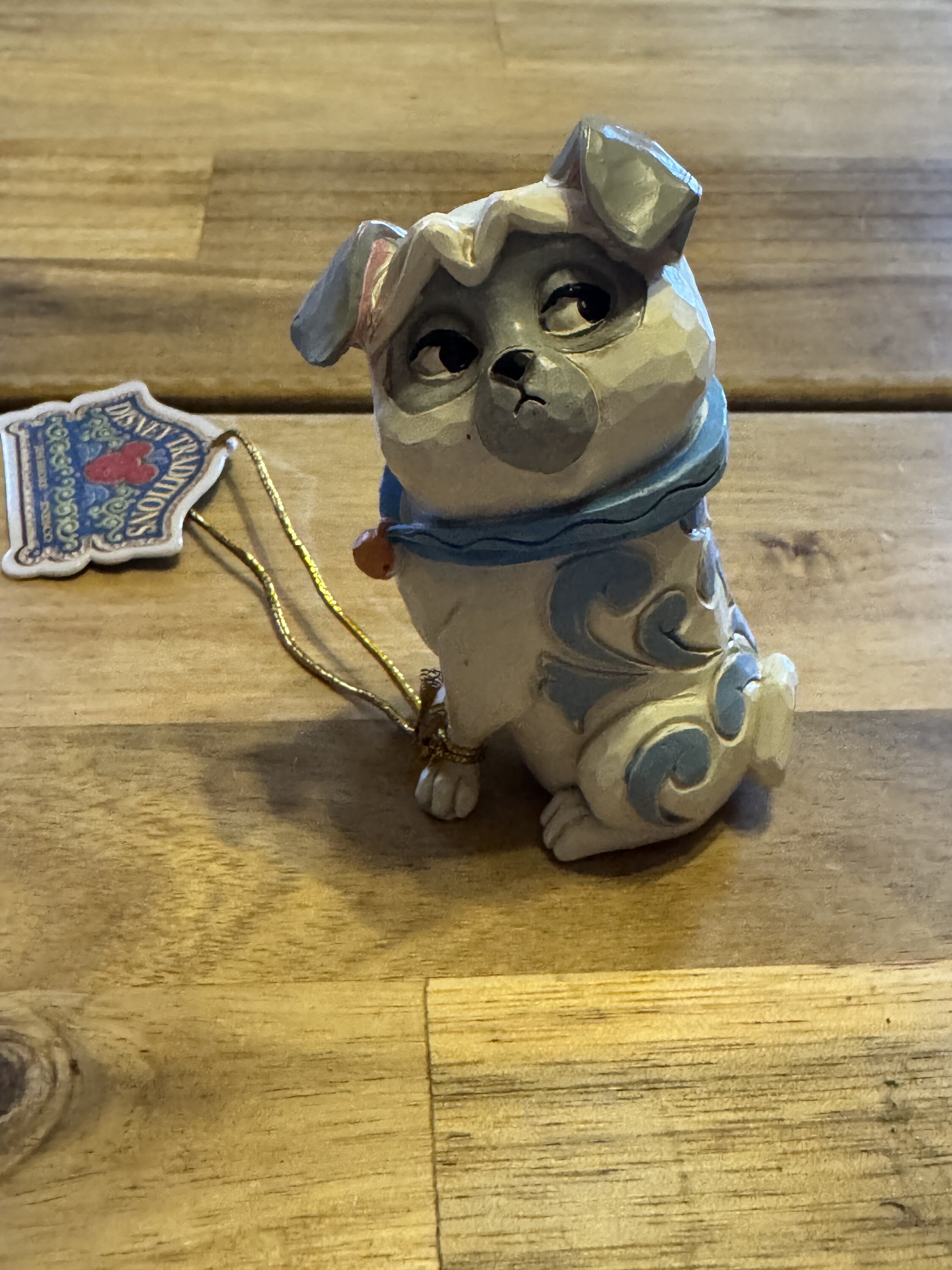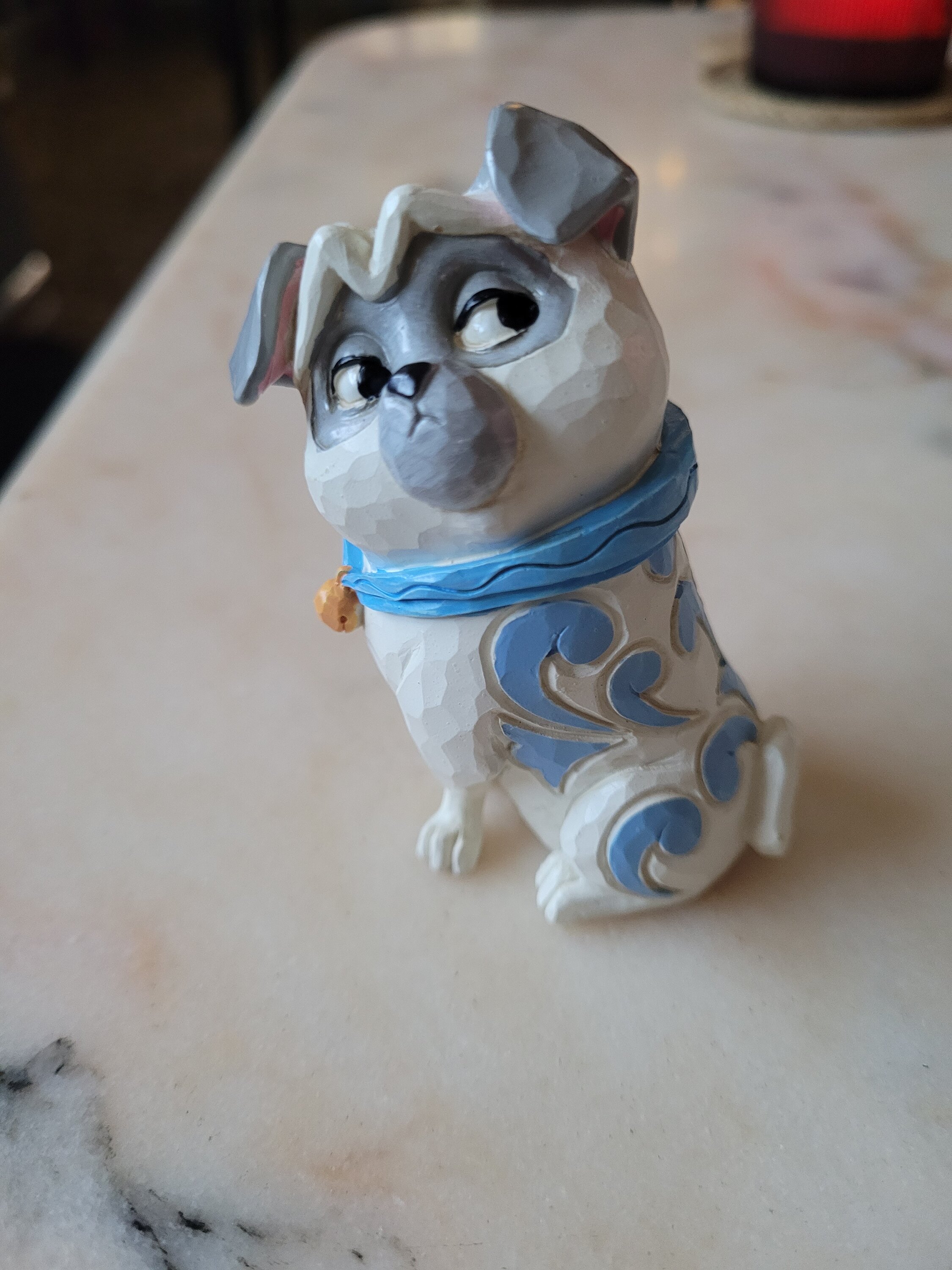Feiern Sie den 30. Jahrestag von Pocahontas mit dieser bezaubernden Jim Shore büste von Percy, Ratcliffes verwöhntem Mops. Er hat einen frechen Gesichtsausdruck, trägt ein blaues Halsband mit einer Glocke und zeigt das aufwendige Rosemaling des Künstlers.