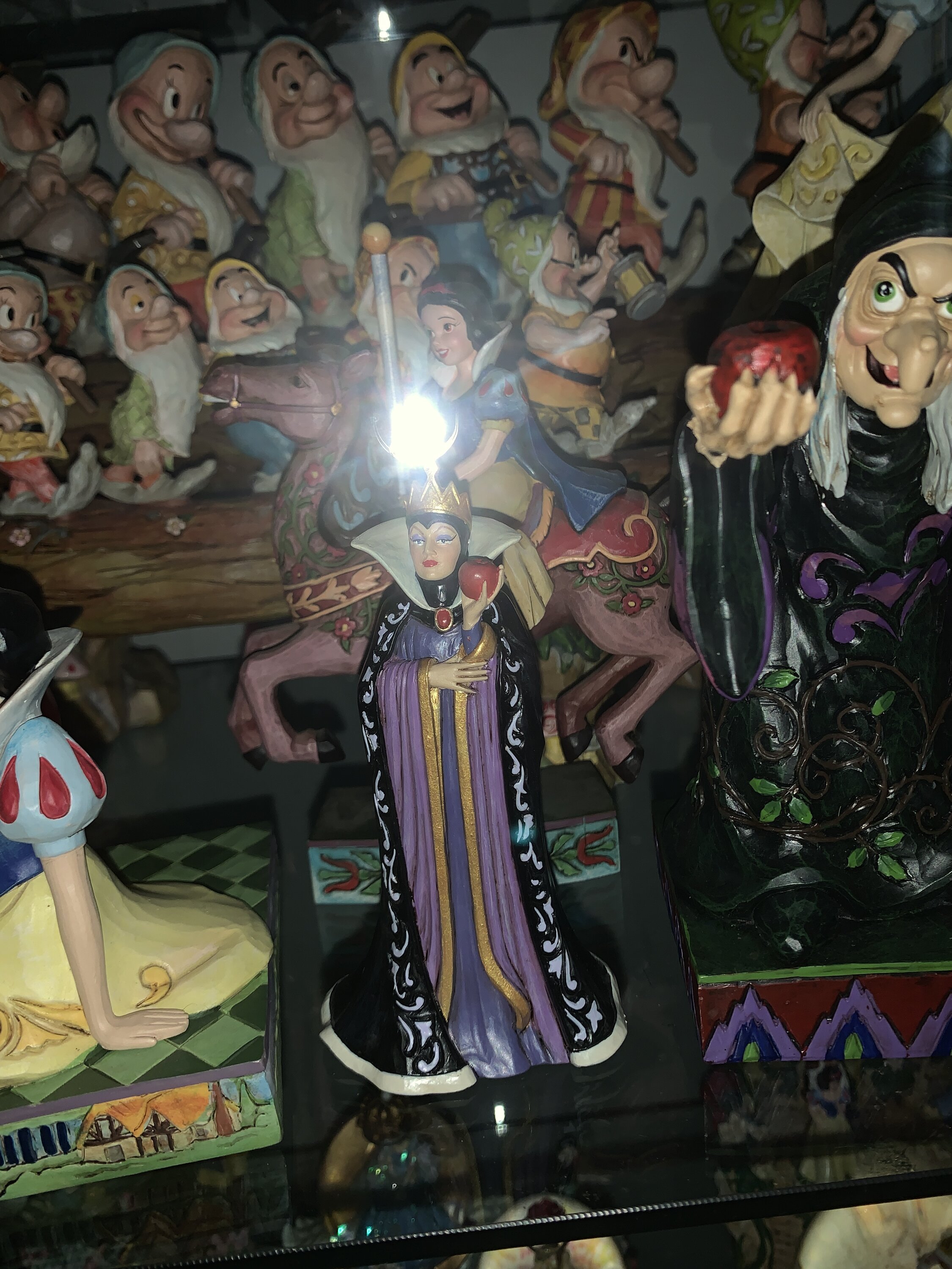 Die Königin Grimhilde trägt ein beeindruckendes schwarz-violettes Kleid, das mit Jim Shores charakteristischen Rosemaling- und Quiltmustern verziert ist. Sie hält einen vergifteten Apfel in der Hand, der für Schneewittchen bestimmt ist, und ihr eifersüchtiges Herz treibt ihre dunklen Absichten an, während sie ihren nächsten Schritt plant.
