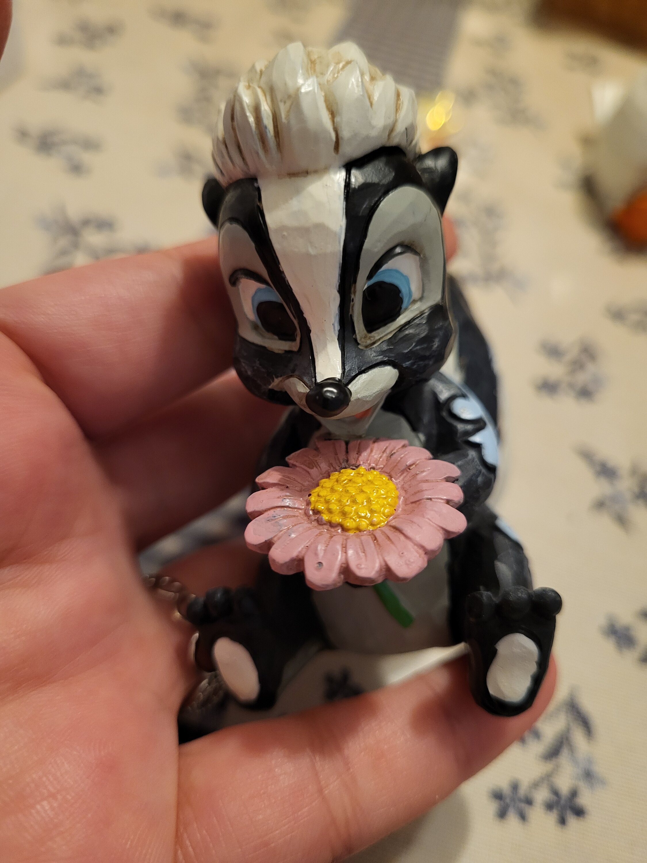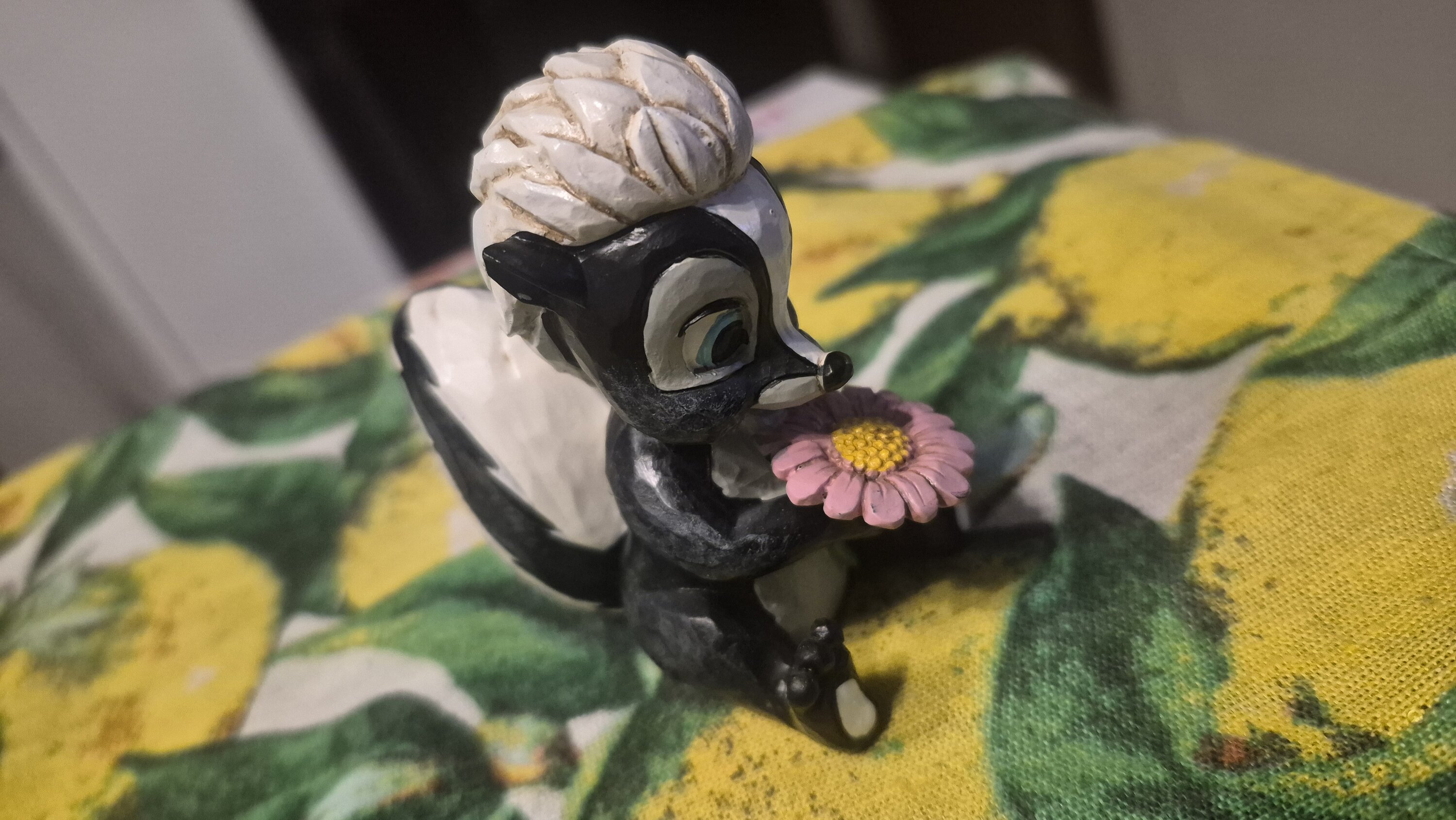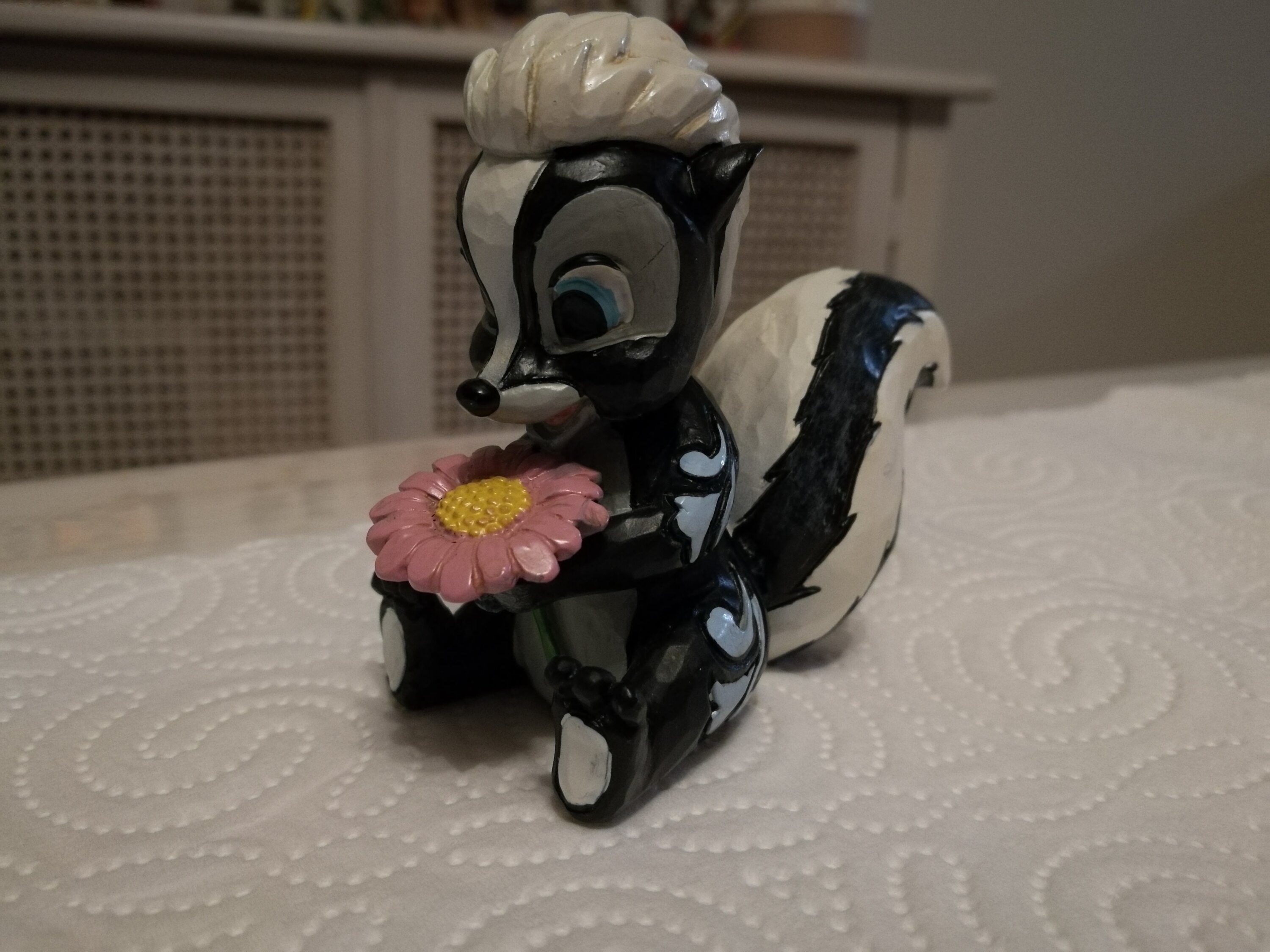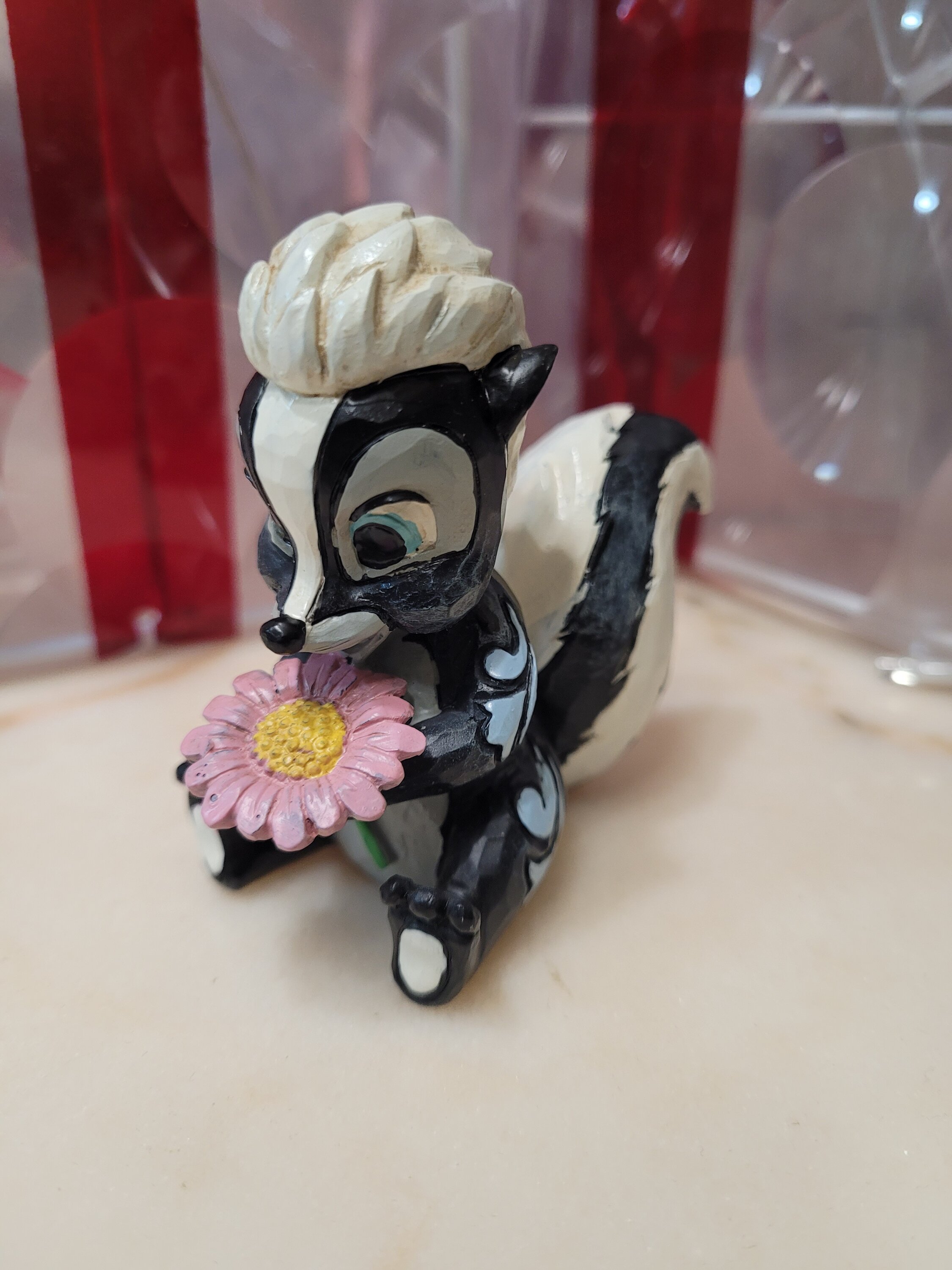 Diese süße Miniatur von Jim Shore zeigt Flower, das Stinktier aus Bambi, geschmückt mit einem auffälligen Rosemaling und einer Handvoll frischer Blumen in der Hand. Mit einem strahlenden Lächeln und kindlicher Liebe strahlt sie Süße und Charme aus.