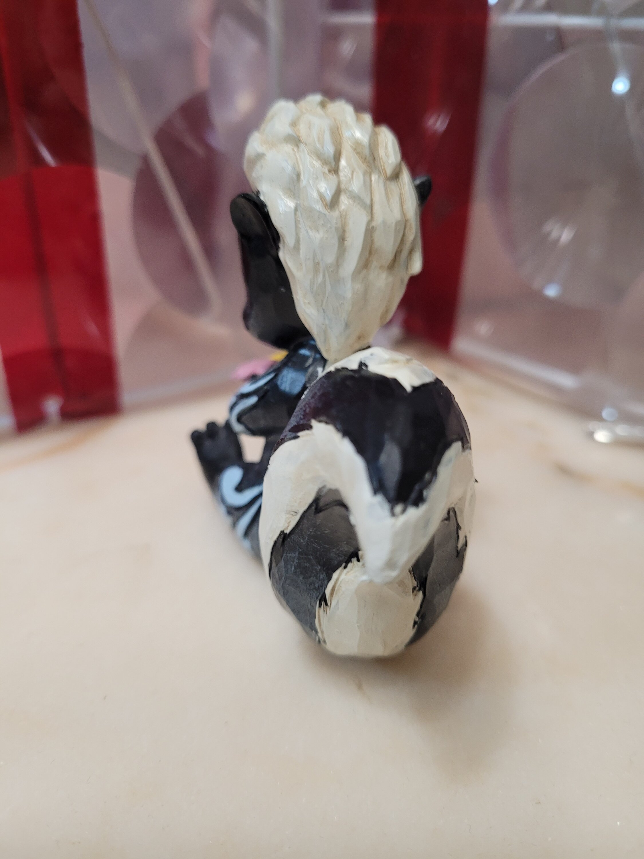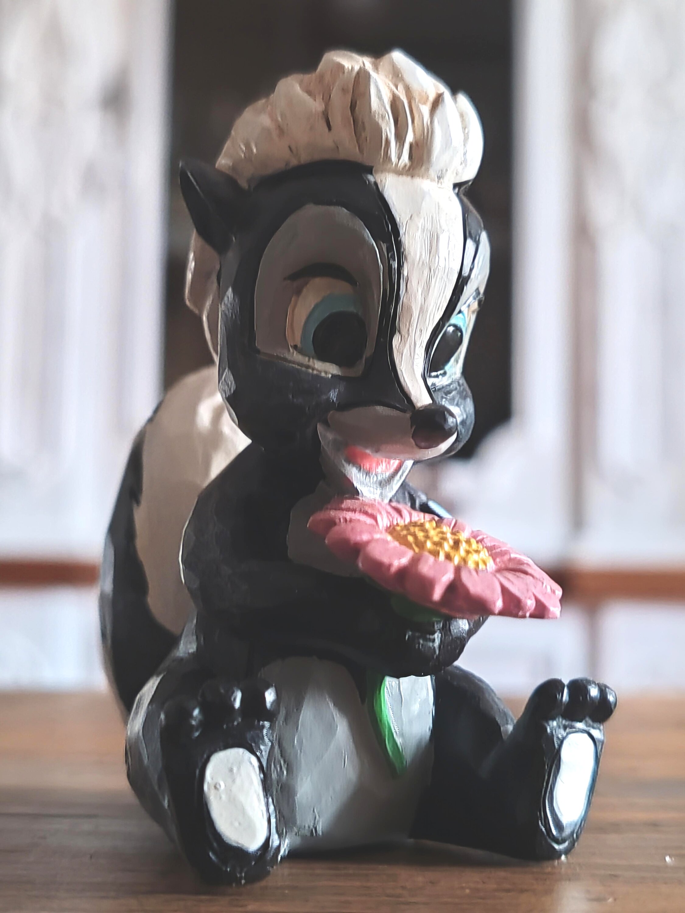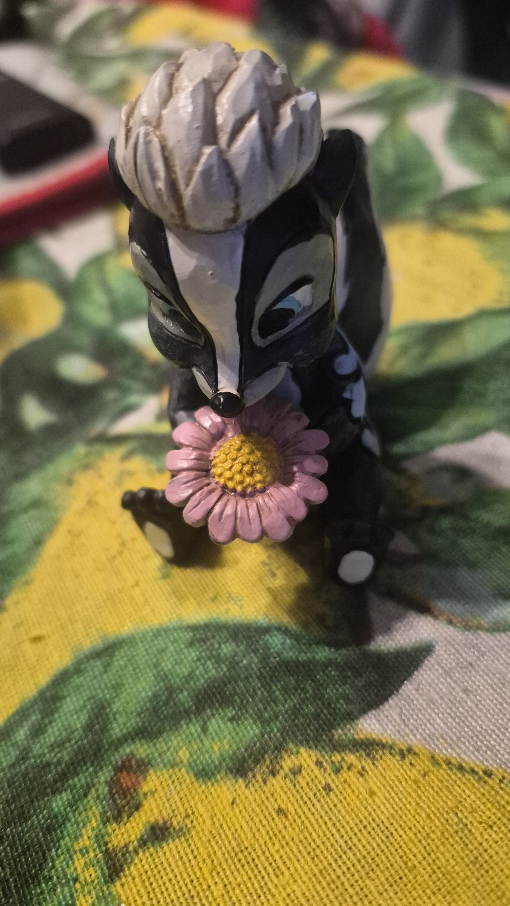 Diese süße Miniatur von Jim Shore zeigt Flower, das Stinktier aus Bambi, geschmückt mit einem auffälligen Rosemaling und einer Handvoll frischer Blumen in der Hand. Mit einem strahlenden Lächeln und kindlicher Liebe strahlt sie Süße und Charme aus.