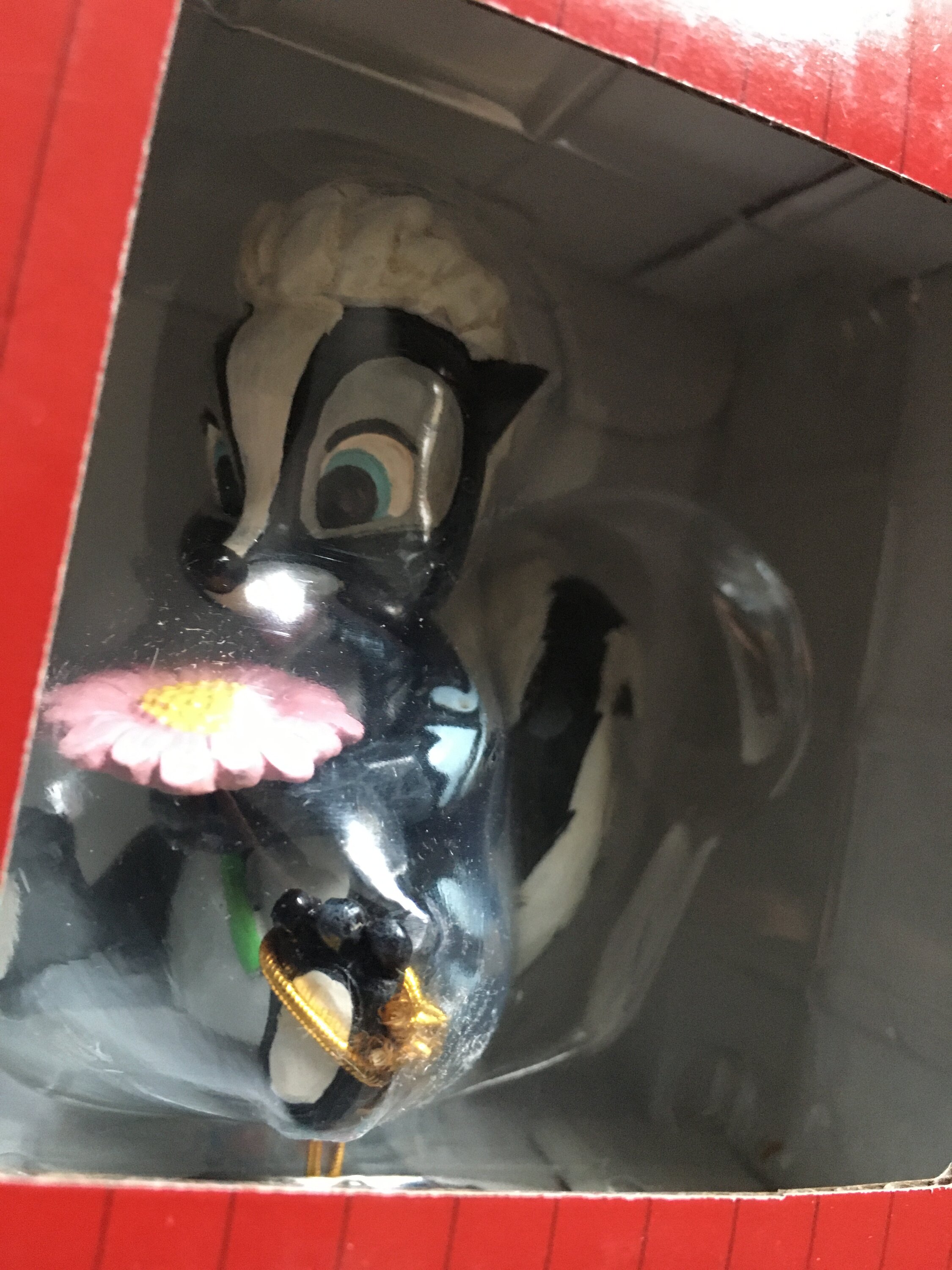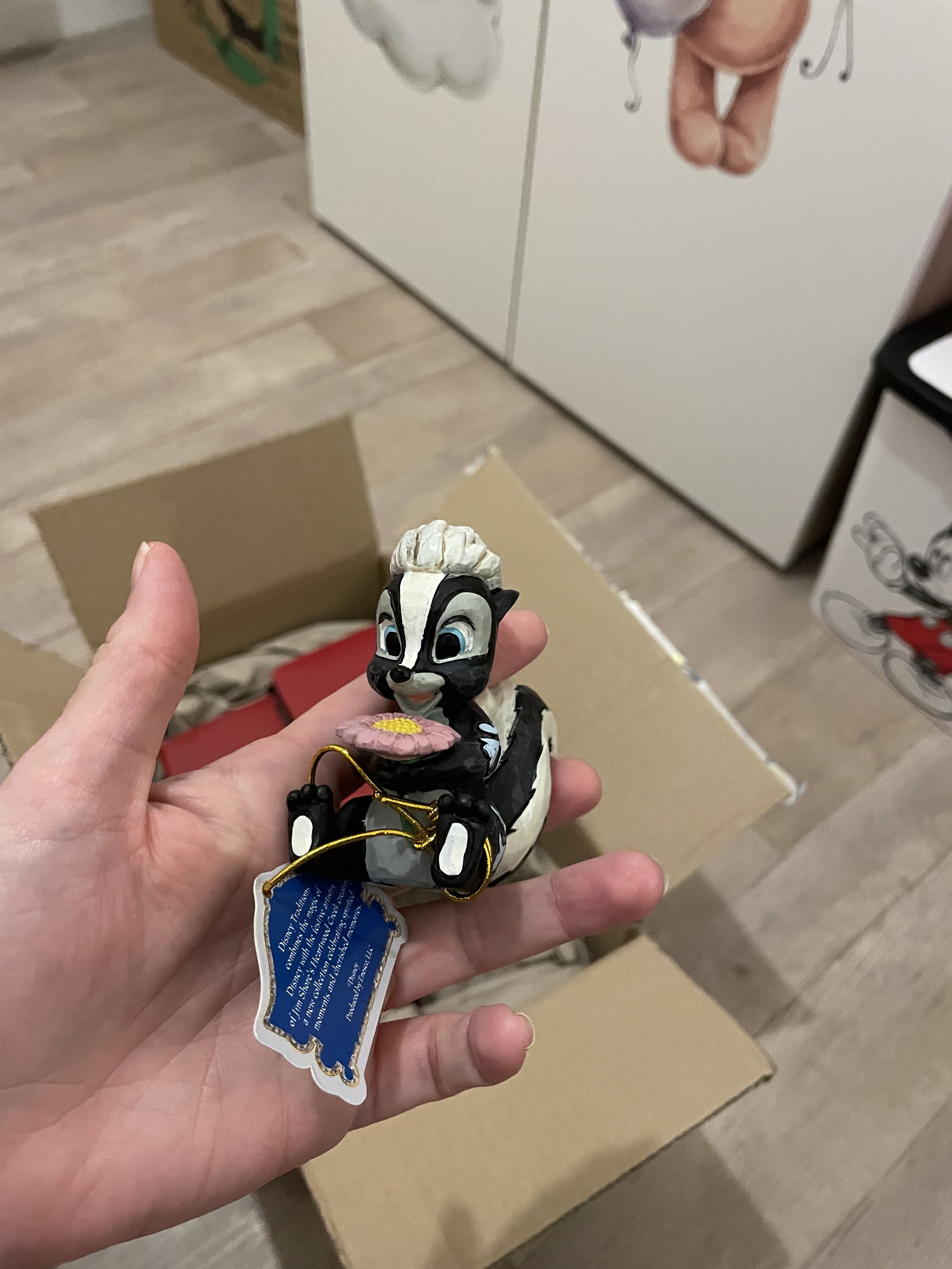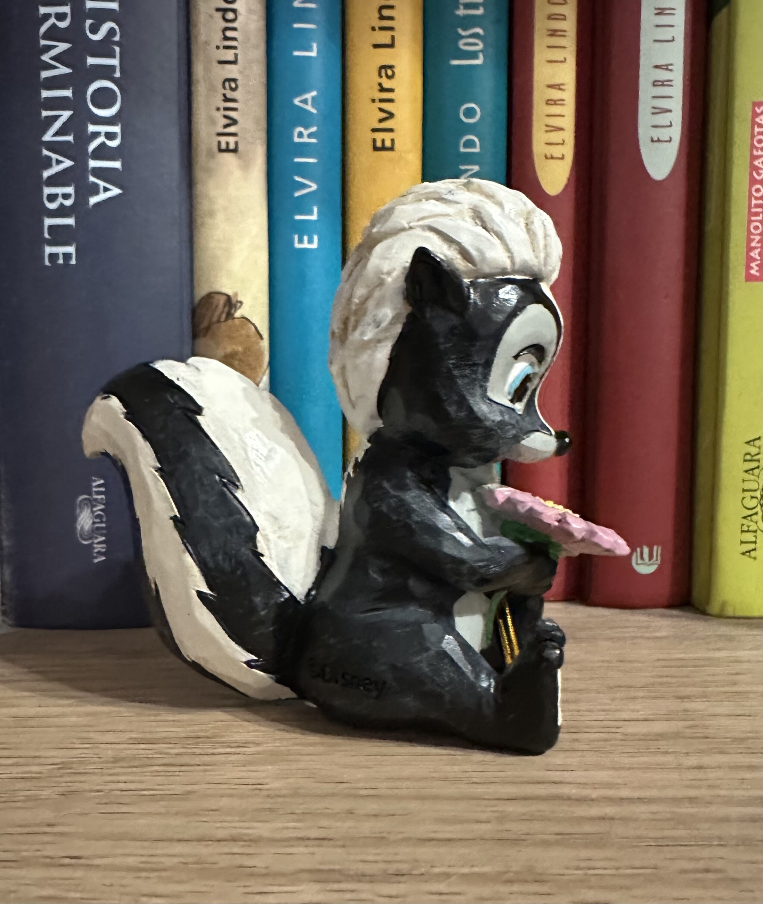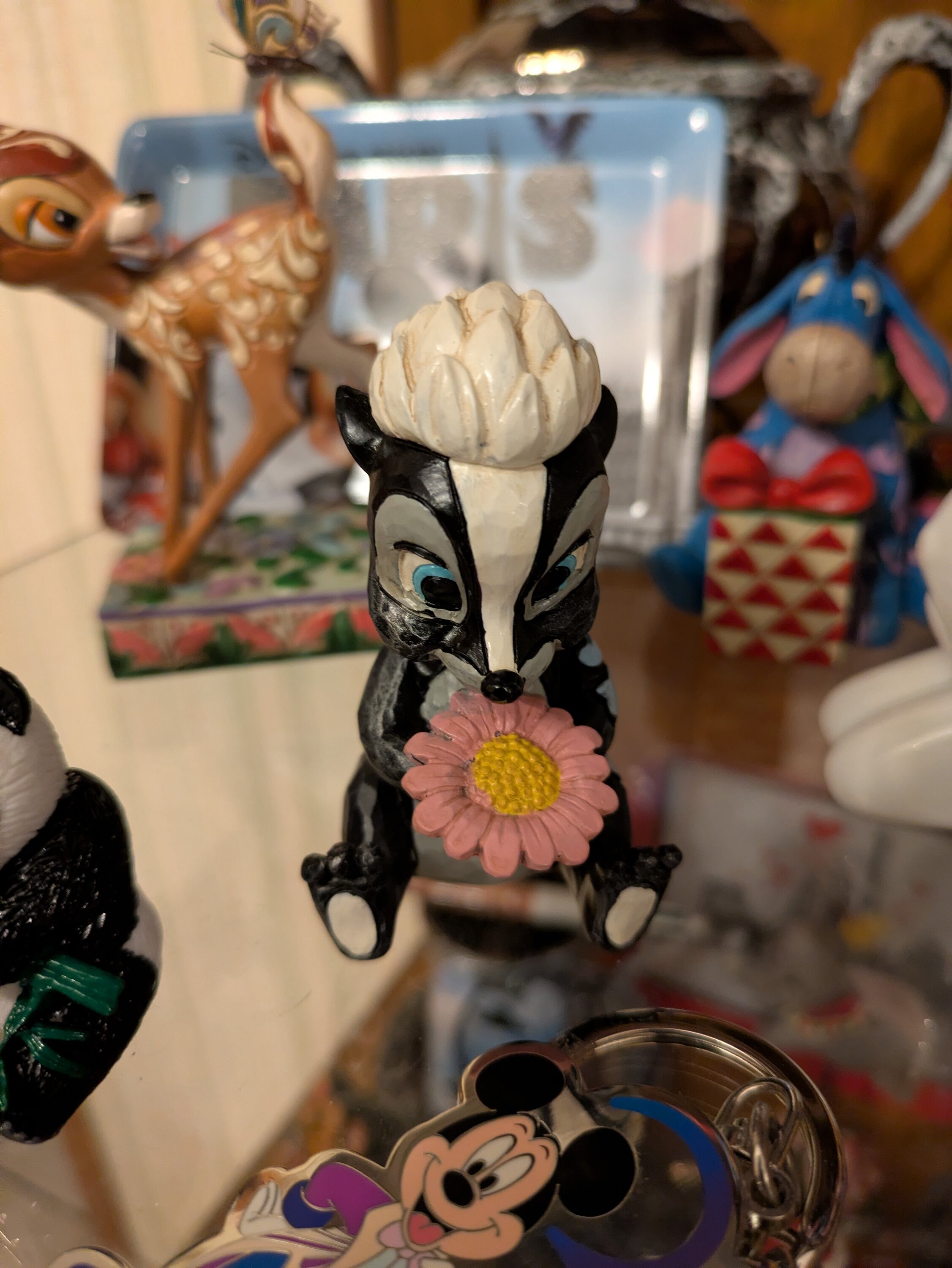 Diese süße Miniatur von Jim Shore zeigt Flower, das Stinktier aus Bambi, geschmückt mit einem auffälligen Rosemaling und einer Handvoll frischer Blumen in der Hand. Mit einem strahlenden Lächeln und kindlicher Liebe strahlt sie Süße und Charme aus.
