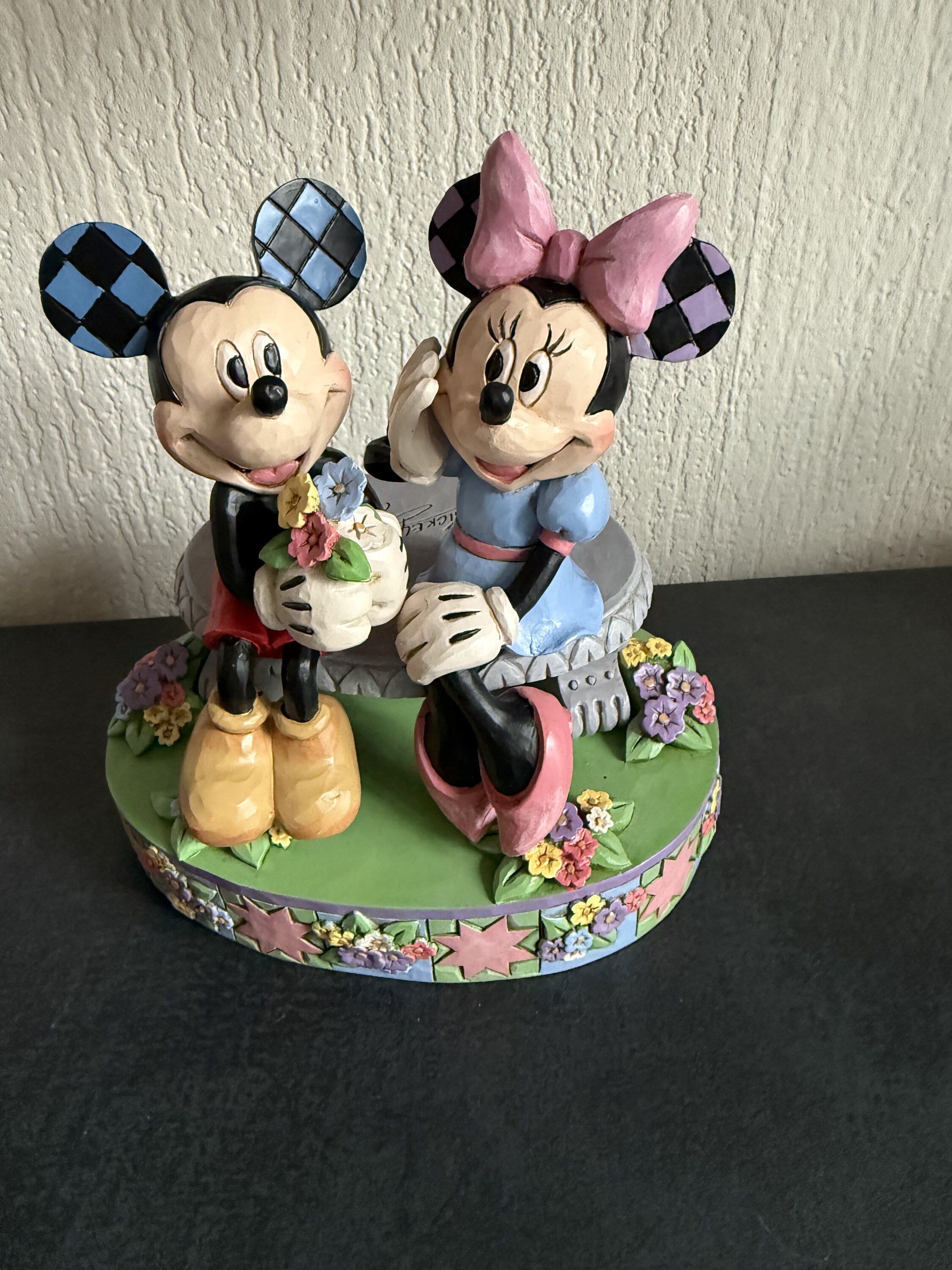 Mickey und Minnie verbringen einen süßen Moment auf einer Parkbank in dieser romantischen Szene mit Jim Shore . Umgeben von bunten Blumen und Jims Rosenmal- und Quiltmustern überreicht Mickey Minnie errötend einen frischen Blumenstrauß.