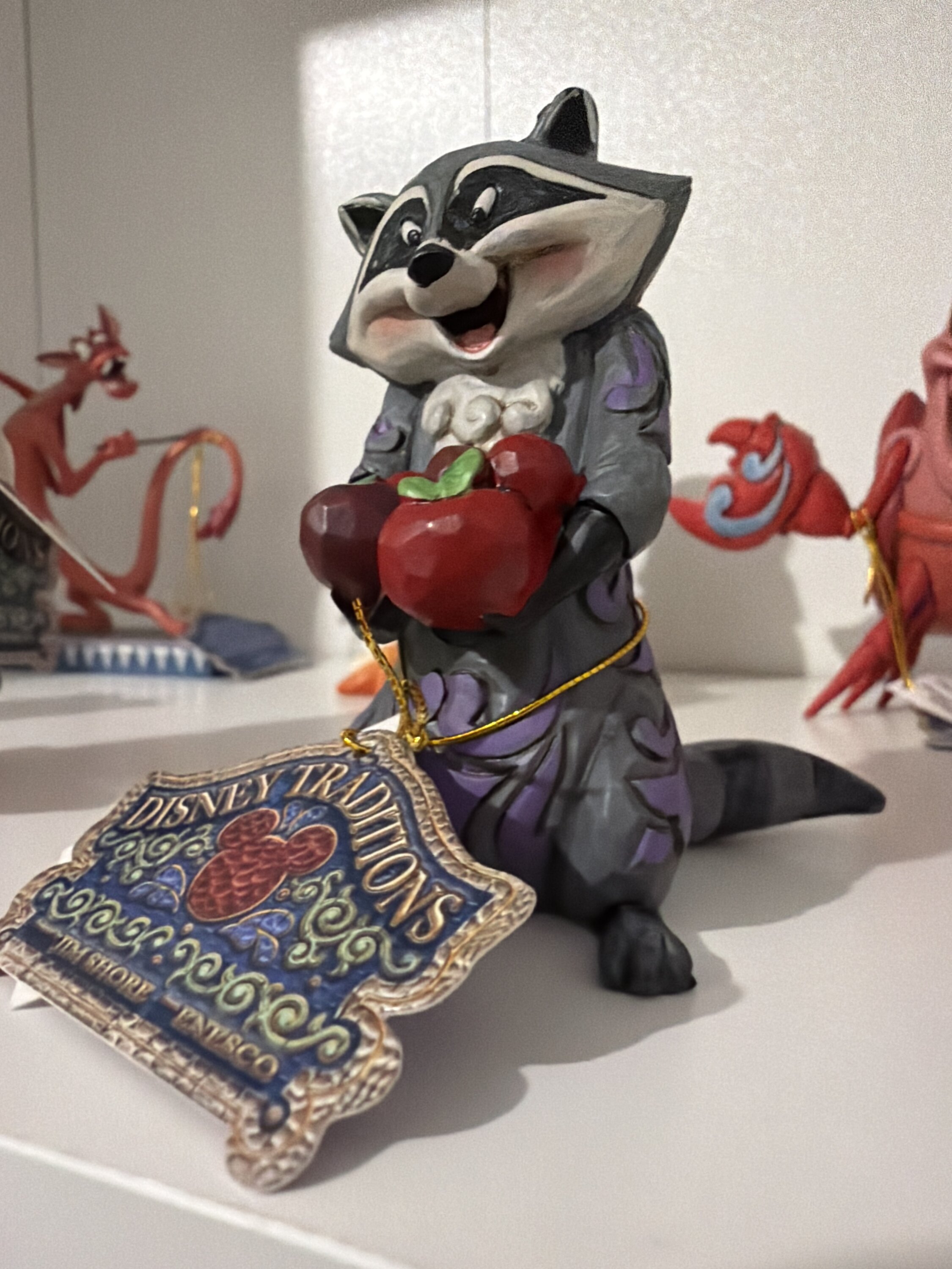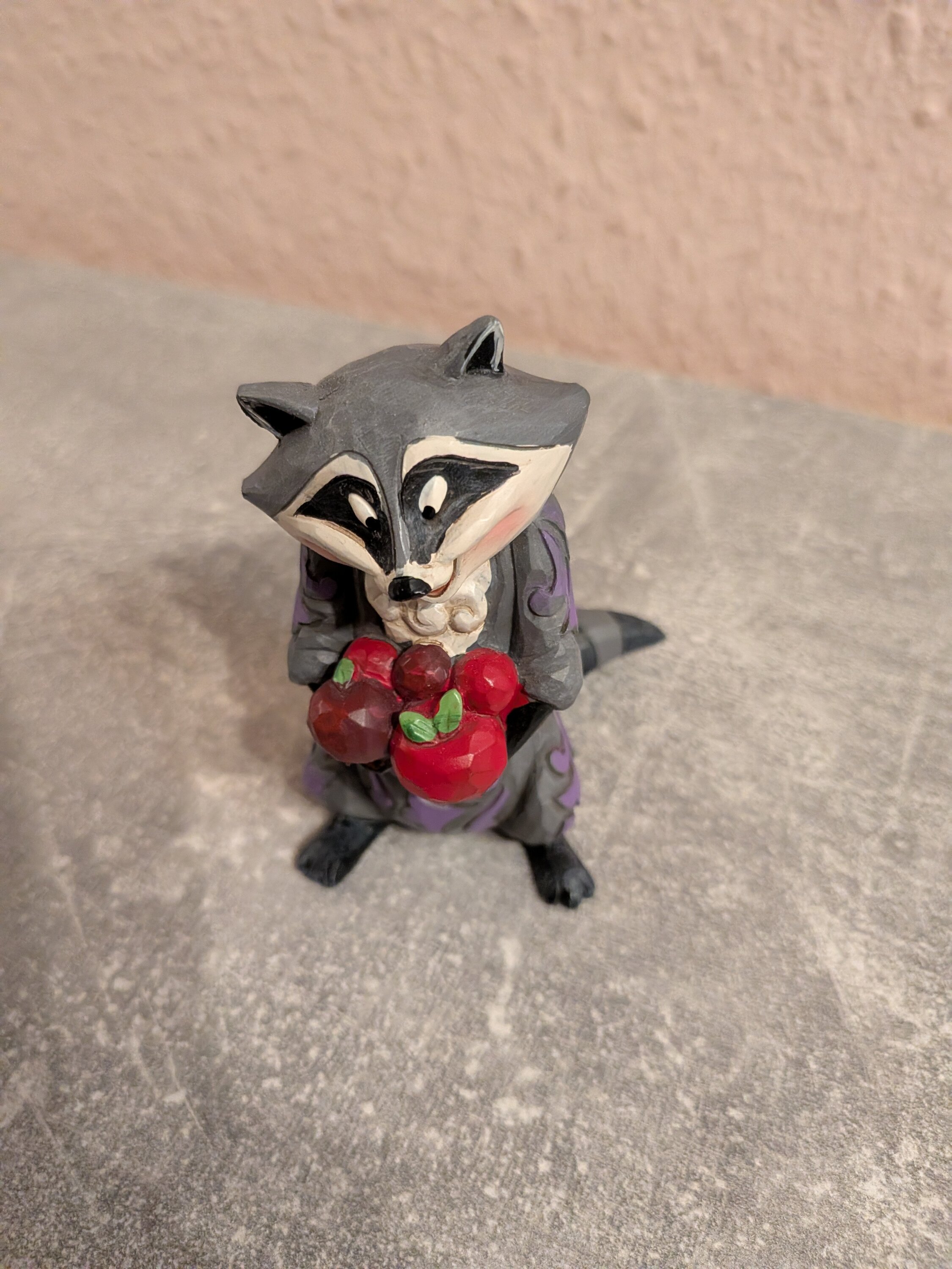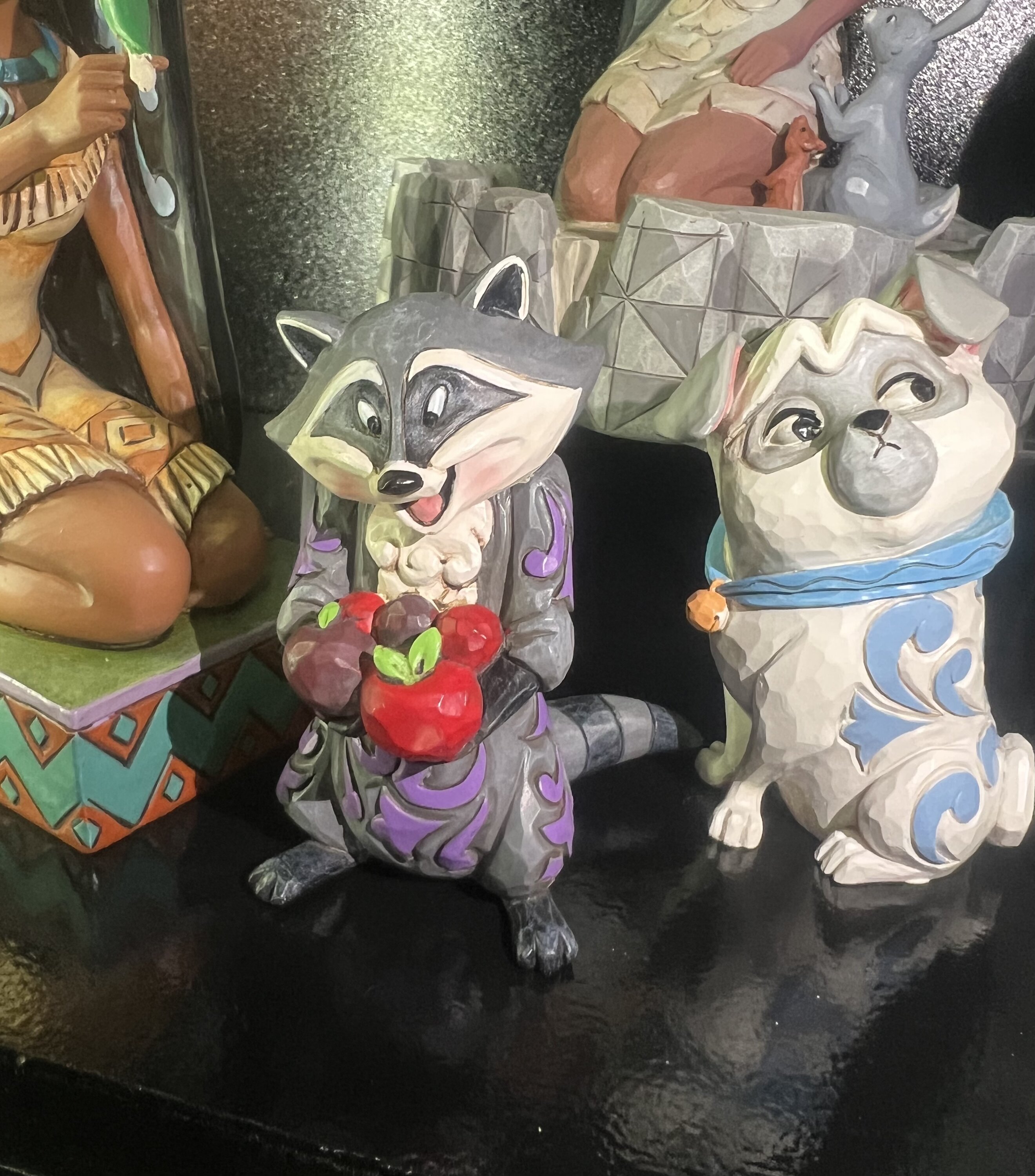 Meeko, der beliebte Waschbär aus Disneys Zeichentrickfilm Pocahontas aus dem Jahr 1995, liebt Essen, insbesondere John-Smith-Kekse. In dieser Miniatur von Jim Shore hat der findige Aasfresser Äpfel in Hülle und Fülle gefunden.