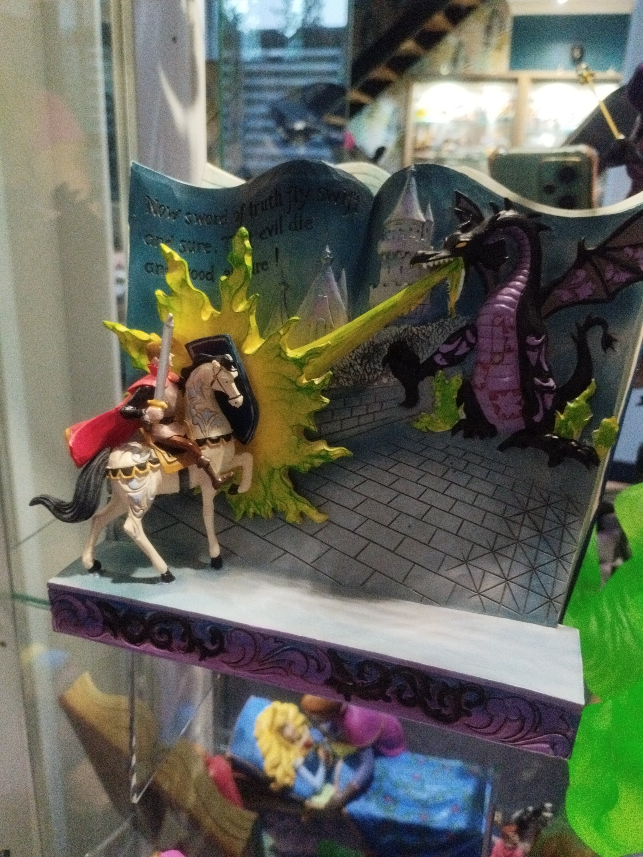 Fin da bambino (e ormai sono un vecchio) mi è sempre rimasto impresso il combattimento del principe Filippo contro Malefica, perché, ancor prima della maggior parte degli eroi e supereroi vari, già negli anni 50 e con solo spada e scudo egli si apprestava a combattere, senza alcun superpotere, contro nientepopodimeno che un drago. Sarebbero dovuti passare decenni ancora prima di rivedere uno scontro di fantasia epico di questa portata. Quindi questo soprammobile ha catturato subito la mia attenzione, quando l'ho visto. In realtà, purtroppo, il suddetto spezzone non è mai veramente stato riportato in nessuna maniera nel merchandise fino a questo momento, o almeno credo. È molto piccolo, circa 15 cm, ma non potevo non prenderlo ed è fatto piuttosto bene... non amo l'effetto legno ma in questo caso non mi dà fastidio e la scena ripropone bene l'epico scontro. Purtroppo mi è arrivato danneggiato ma non per colpa del venditore, in quanto, anche se ben imballato all'interno, è fragilissimo in alcuni punti come la spada... ma sono riuscito a ripararlo senza che si veda nulla, ma ho una certa esperienza in merito.