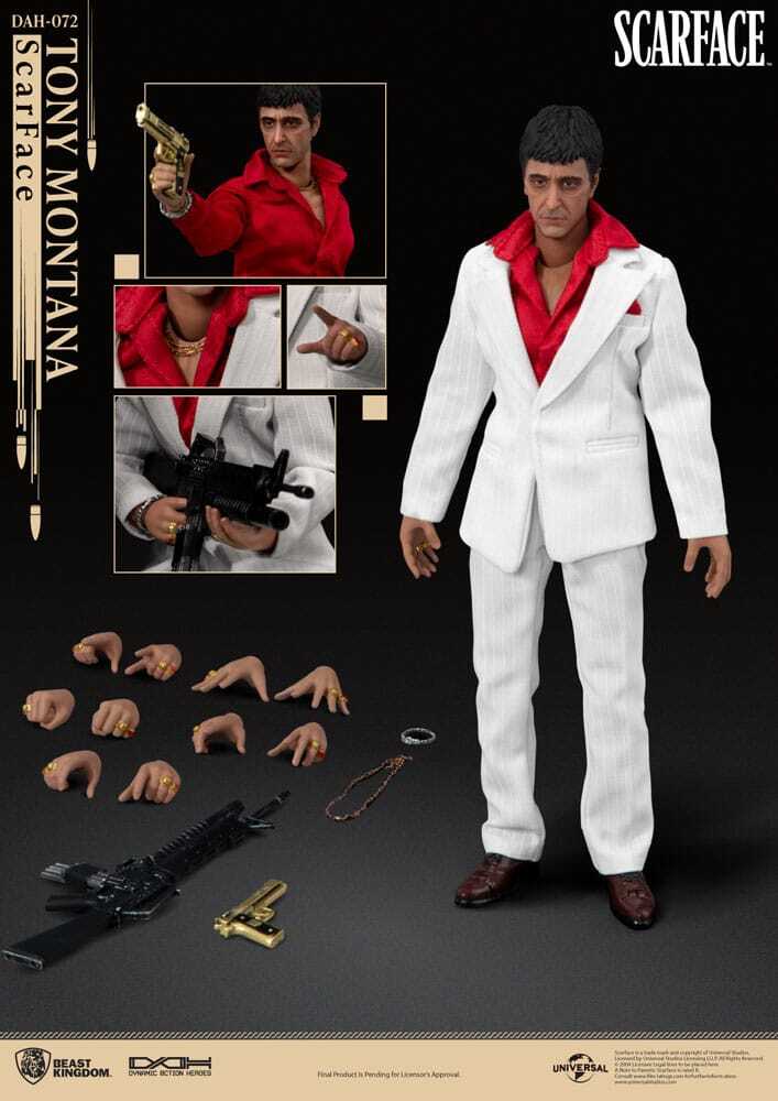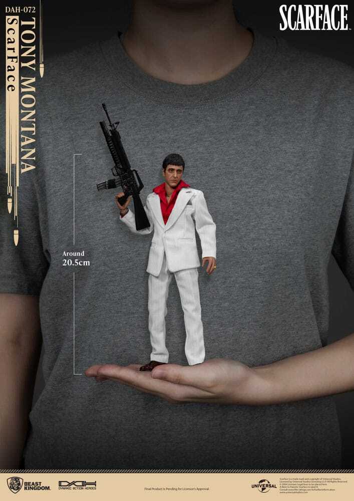Die sorgfältig geformte Figur zeigt Tony in seinem klassischen Anzug und fängt seine charakteristische Pose und seinen grimmigen Gesichtsausdruck perfekt ein. Die hochwertige Lackierung hebt jedes Detail hervor, von der Textur seiner Kleidung bis zu den lebensechten Gesichtszügen, und macht diese Figur zu einer wahren Hommage an den Kultfilmklassiker.