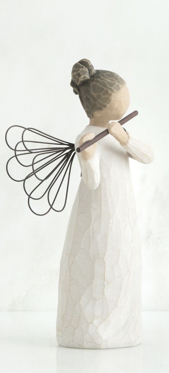 L’angelo è raffigurato mentre suona un flauto, gesto che sottolinea l’idea di armonia, ritmo e bellezza interiore. Le ali delicate in metallo e la postura raccolta creano un’atmosfera di pace e equilibrio che si integra perfettamente in qualsiasi ambiente domestico. Il flauto non rappresenta solo la musica, ma un equilibrio tra mente, cuore e spirito. Simboleggia serenità, connessione con se stessi e con gli altri, e un invito a vivere la vita con calma e ritmo.