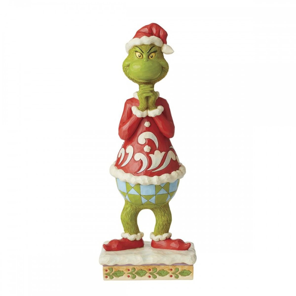 Grinch denkt mit unter dem Kinn verschränkten Händen über seine Pläne nach, Weihnachten zu stehlen. Jim Shore fängt die farbenfrohe Persönlichkeit des Grinch in dieser handgefertigten 20-Zoll-Statue ein und fügt ihm gleichzeitig sein eigenes unverwechselbares Folk-Art-Design hinzu.