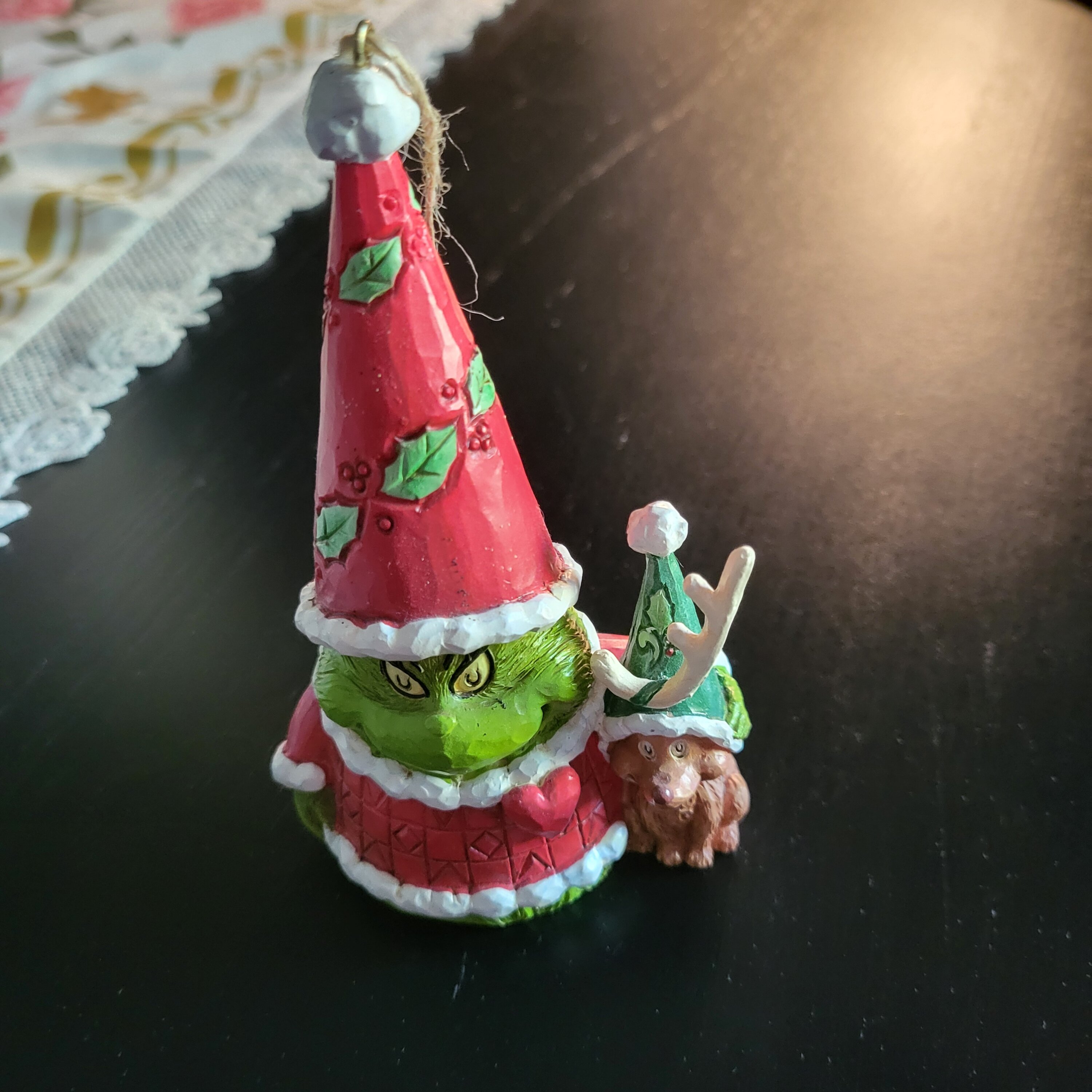 Adorable figurine à poser ou en suspention de taille moyenne je la recommande tout dans le détail avec le petit coeur en relief sur Grinch trop jolie et originale