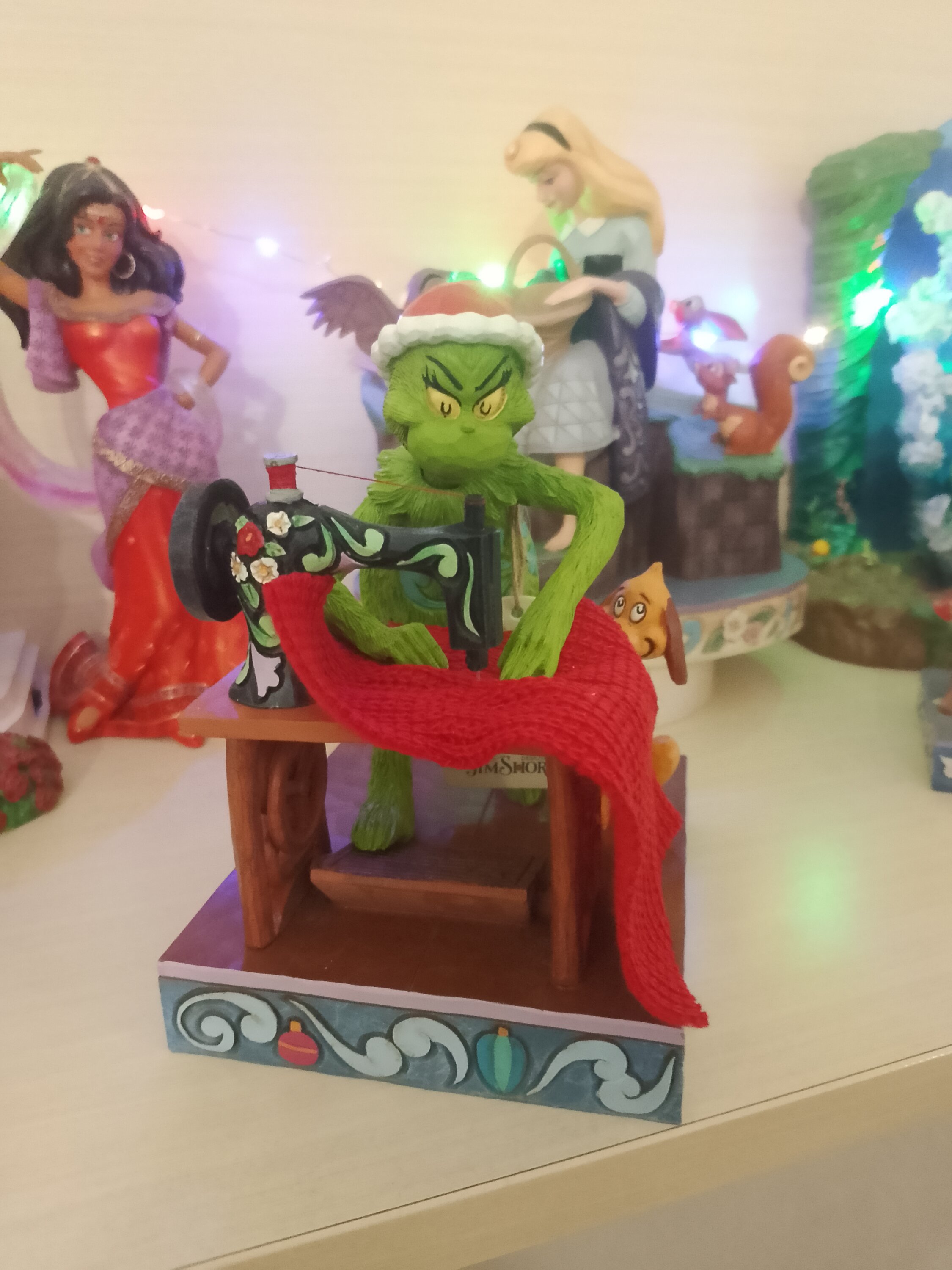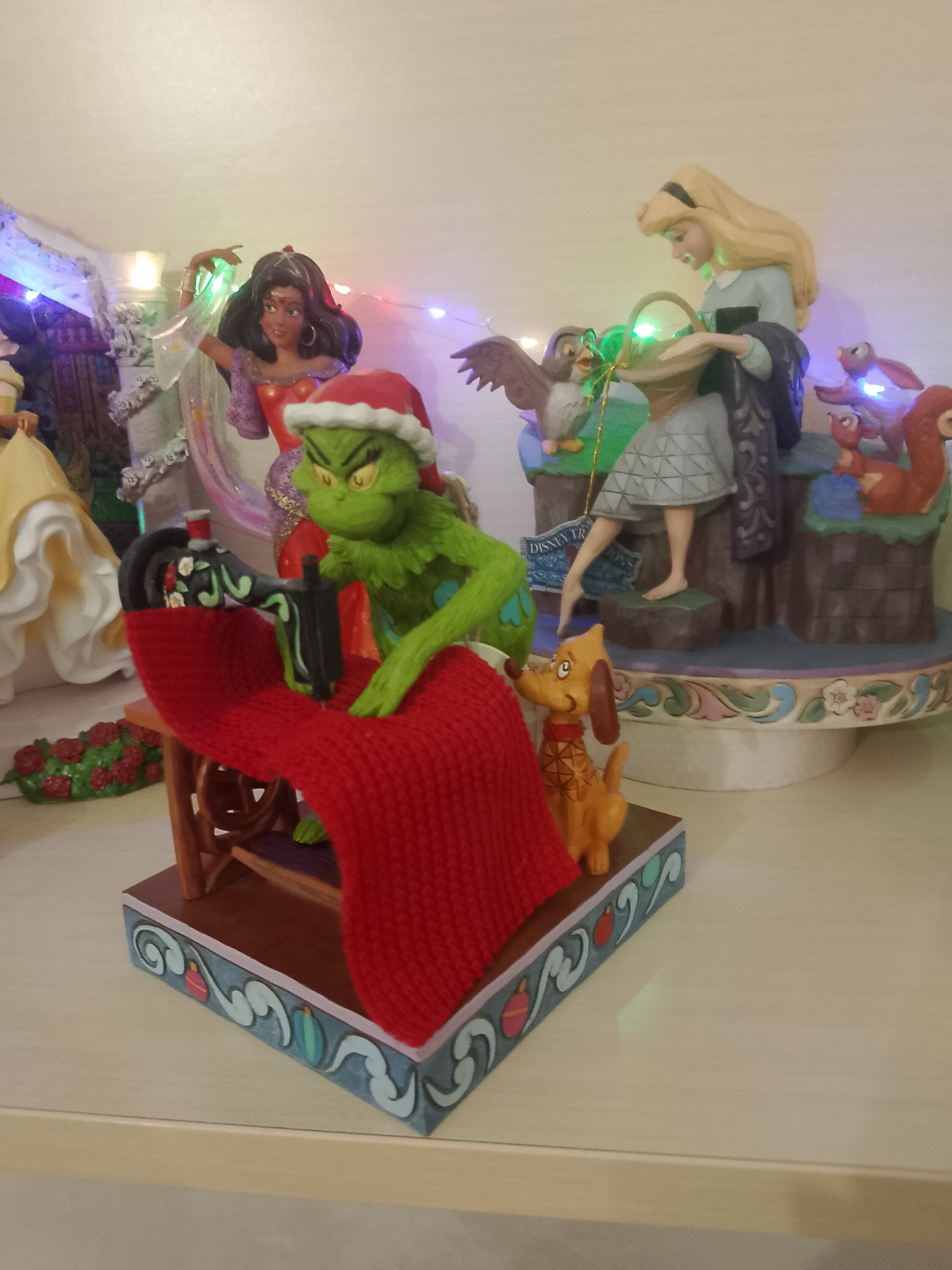 Bellissimo grich che cuce il suo costume da babbo natale con max accanto il suo amico a quattro zampe bellissimo nei dettagli sono felicissima di questo pezzo