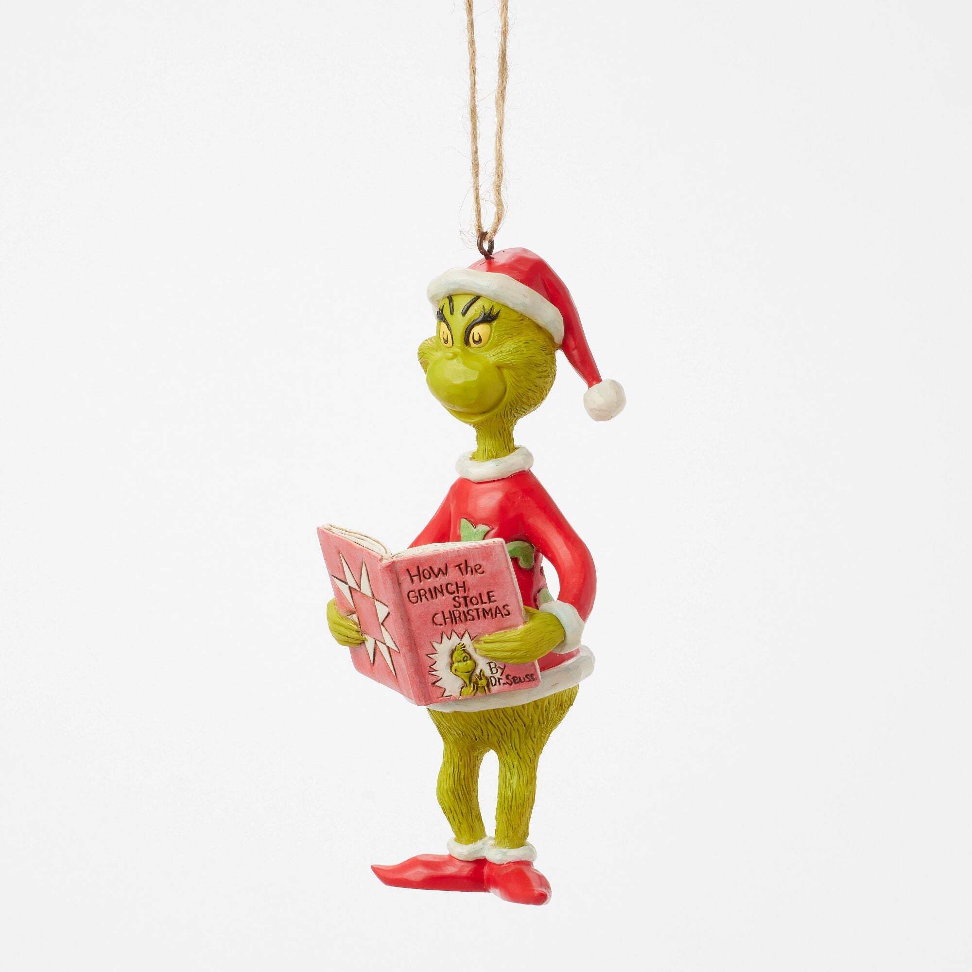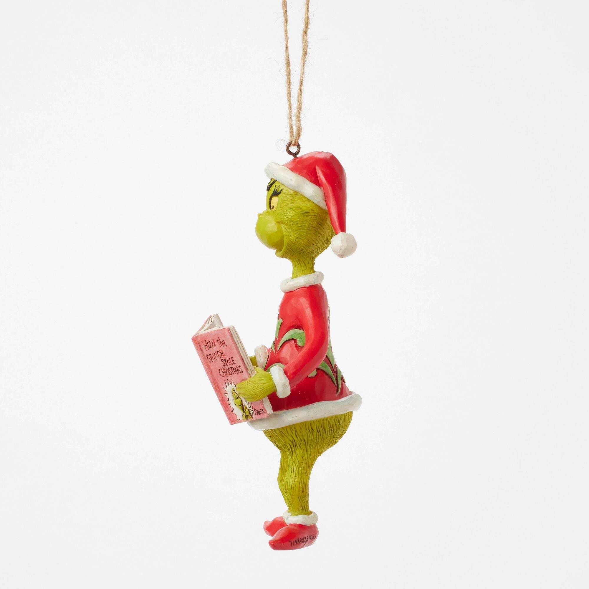 Der Grinch, in ein Weihnachten gekleidet, liest aufmerksam in einem Exemplar von Dr. Seuss' „Wie der Grinch Weihnachten gestohlen hat“. Dieses hängende Ornament von Jim Shore fängt diese bezaubernde Szene ein, während der Grinch in seine eigene Geschichte eintaucht. Entworfen vom preisgekrönten Künstler und Bildhauer Jim Shore für die Grinch-Kollektion. Diese Figuren sind kein Kinderspielzeug. Nur für Erwachsene bestimmt. Höhe: 13,5 cm
