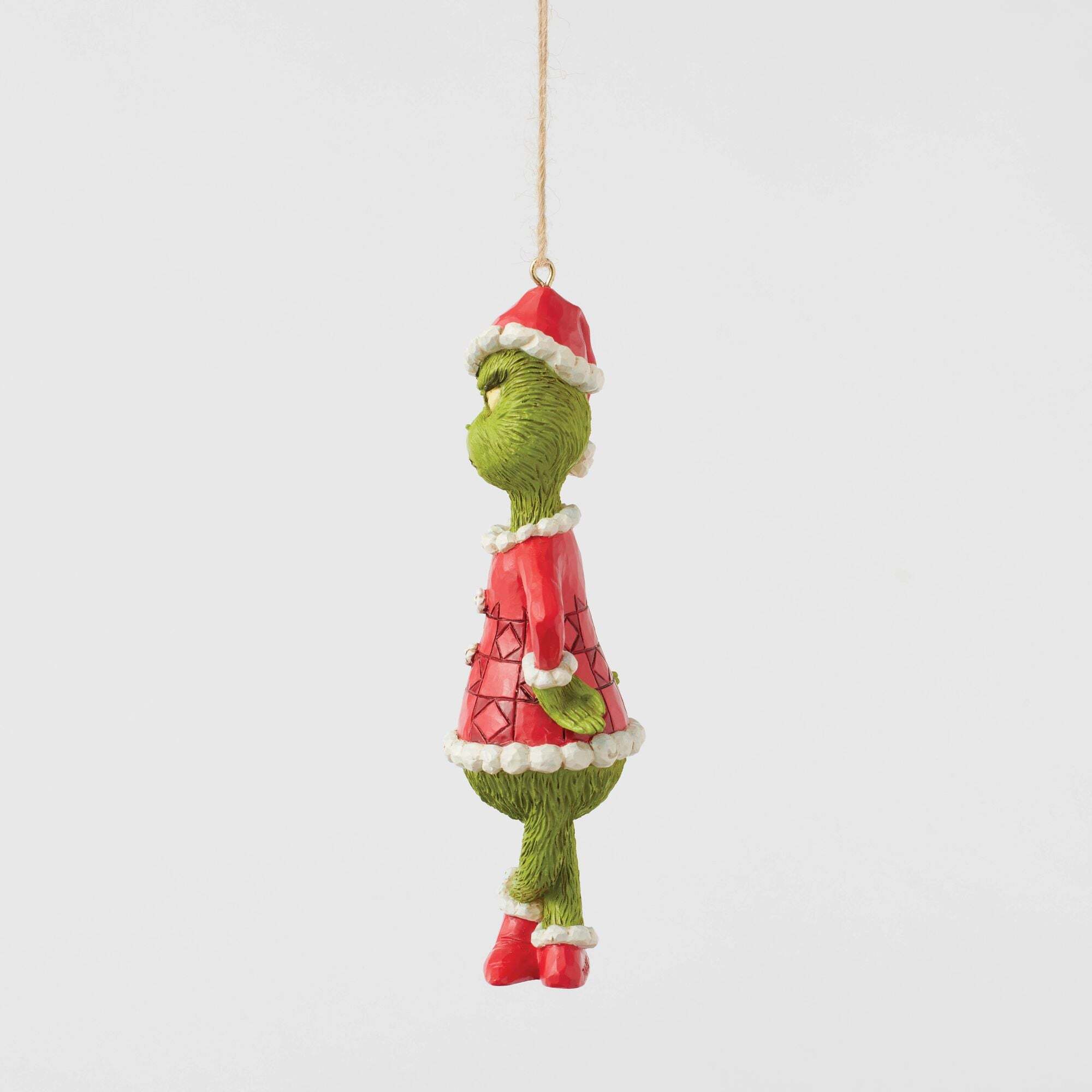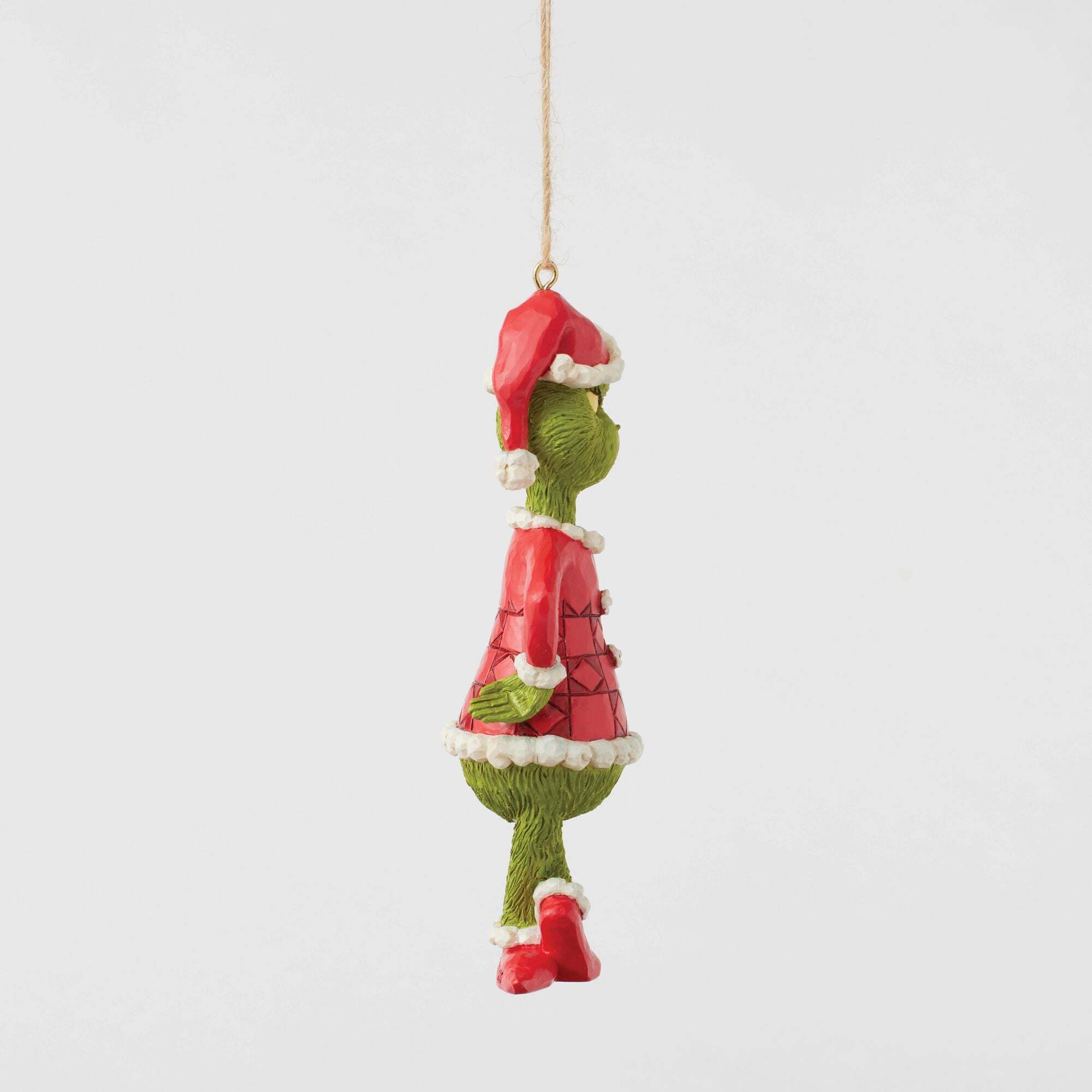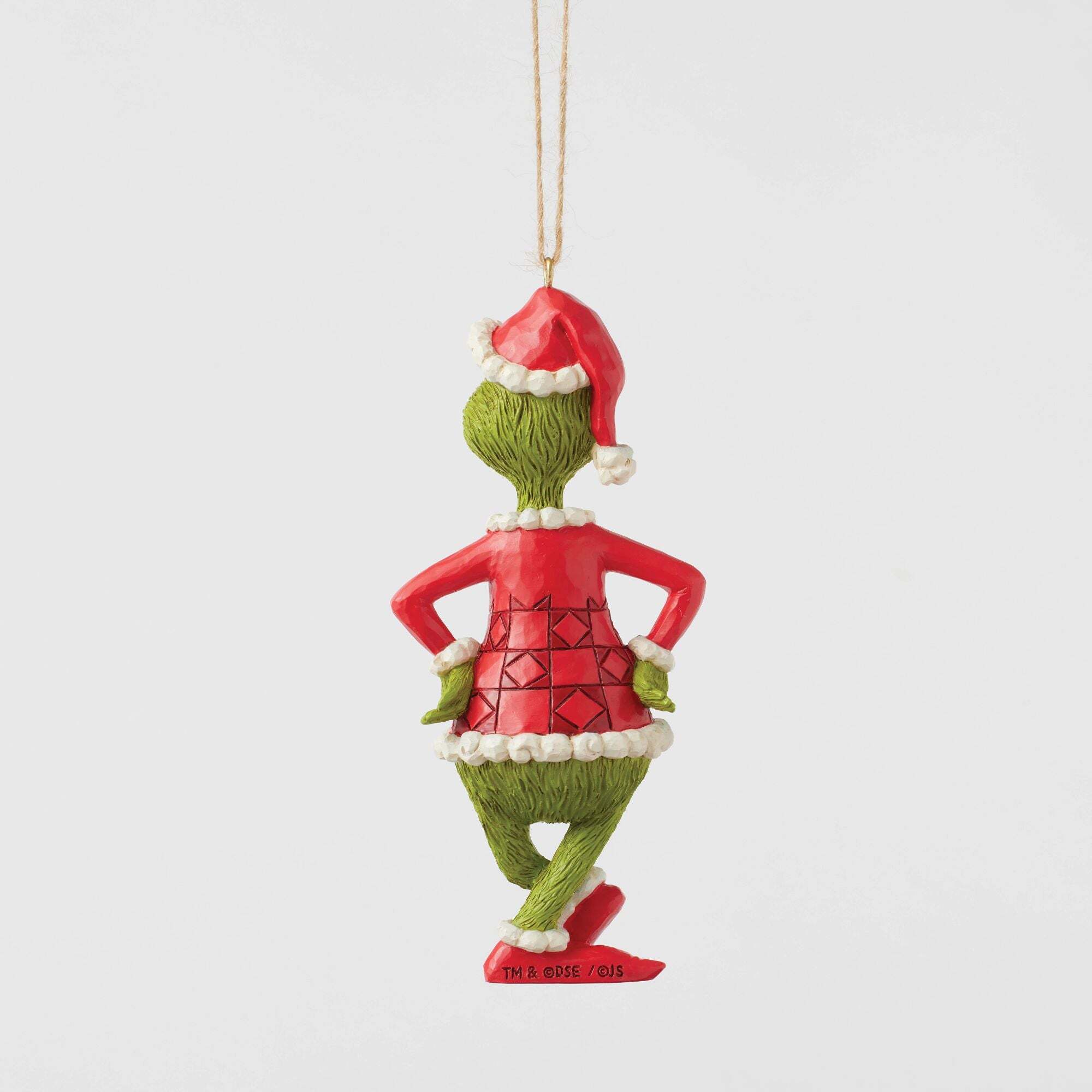 Der Grinch steht in schelmischer Pose mit überkreuzten Füßen und den Händen in den Hüften da und zeigt seinen typischen schelmischen Gesichtsausdruck. Diese Jim Shore Hängedekoration fängt seinen sturen Charme perfekt ein und verleiht Ihren Feierlichkeiten einen Hauch seiner mürrisch Whoville-Stimmung. Entworfen vom preisgekrönten Künstler und Bildhauer Jim Shore für die Grinch-Kollektion. Diese Figuren sind kein Kinderspielzeug. Nur für Erwachsene. Höhe: 13,5 cm