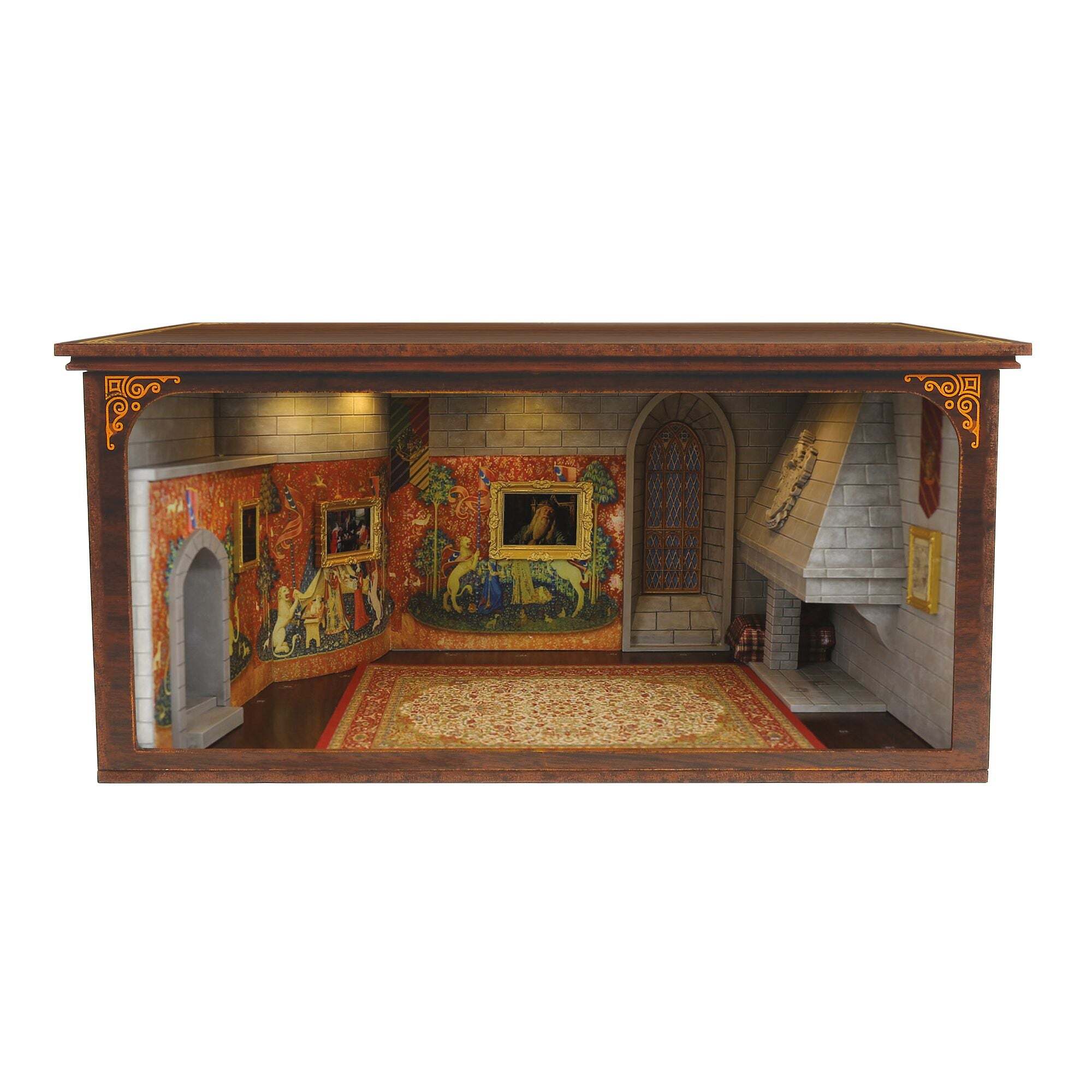 Dieses detailgetreue Modell bildet den legendären Gryffindor Gemeinschaftsraum originalgetreu nach, mit Steinwänden, einem majestätischen Kronleuchter, Kandelabern, Buntglasfenstern und nicht weniger als 24 magischen Artefakten, inspiriert vom Harry Potter-Universum.