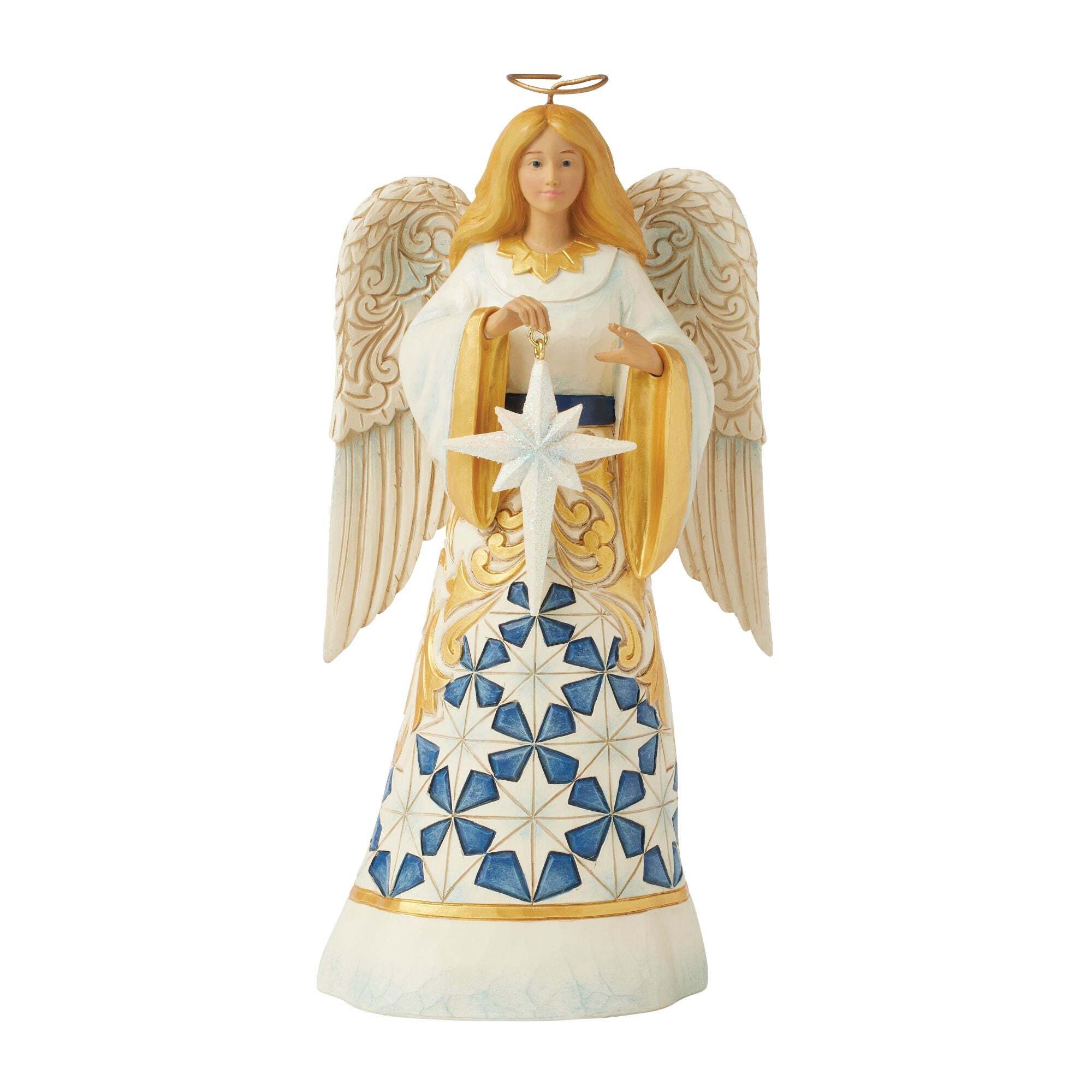 Dieser prächtige engel von Jim Shore verkörpert Schönheit in seinem gold-blauen, sternenbesetzten Kleid und hält einen funkelnden Weihnachten . Ihre verzierten Flügel verleihen ihm einen Hauch von Anmut und machen ihn zu einem himmlischen Symbol der Majestät und des Friedens für die Feiertage.