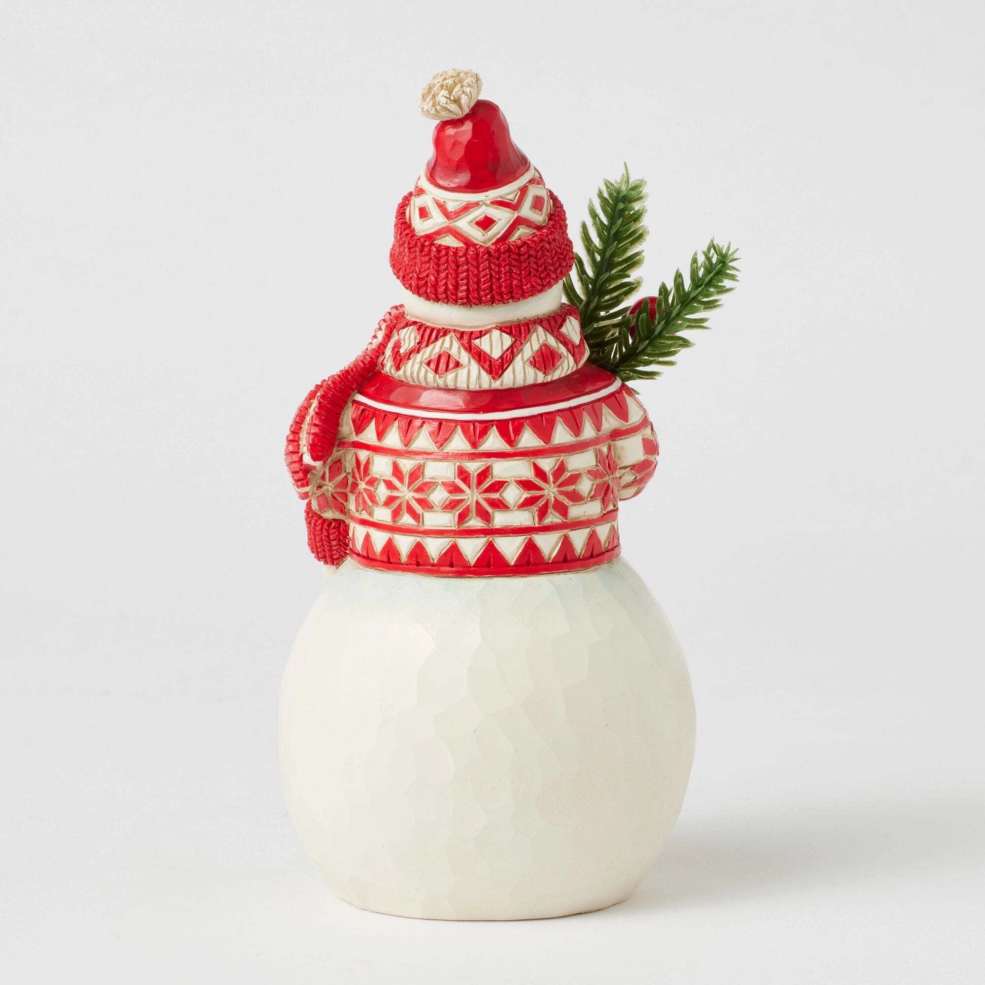 Dieser froh nordische Schneemann ist mit Pullover, Schal und Mütze bekleidet und verströmt festliche Weihnachten . Mit einem breiten Lächeln hält er einen frischen Tannenzweig und einen Tannenzapfen in den Händen.