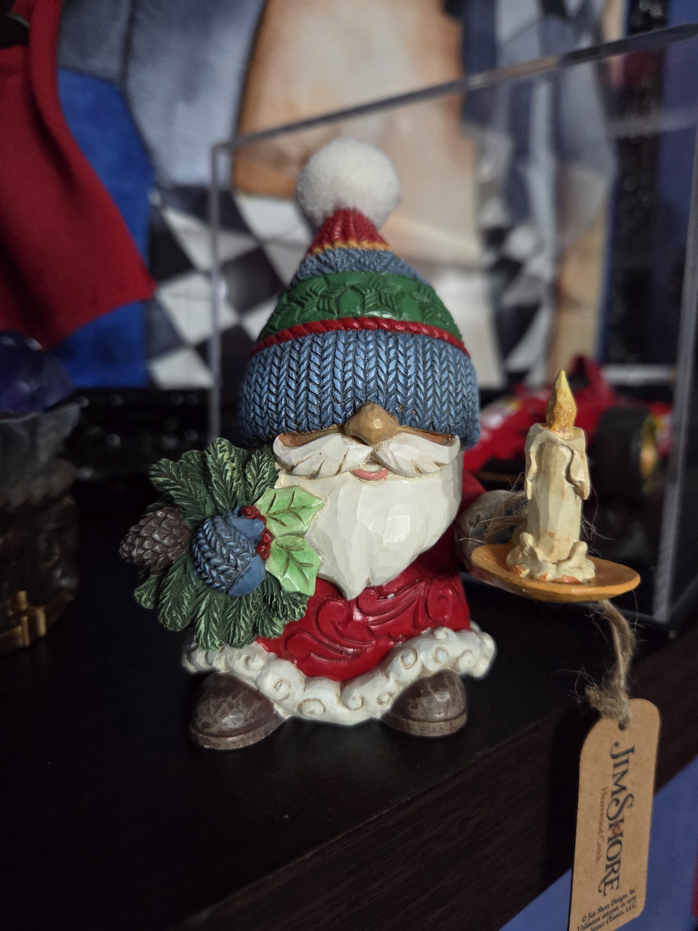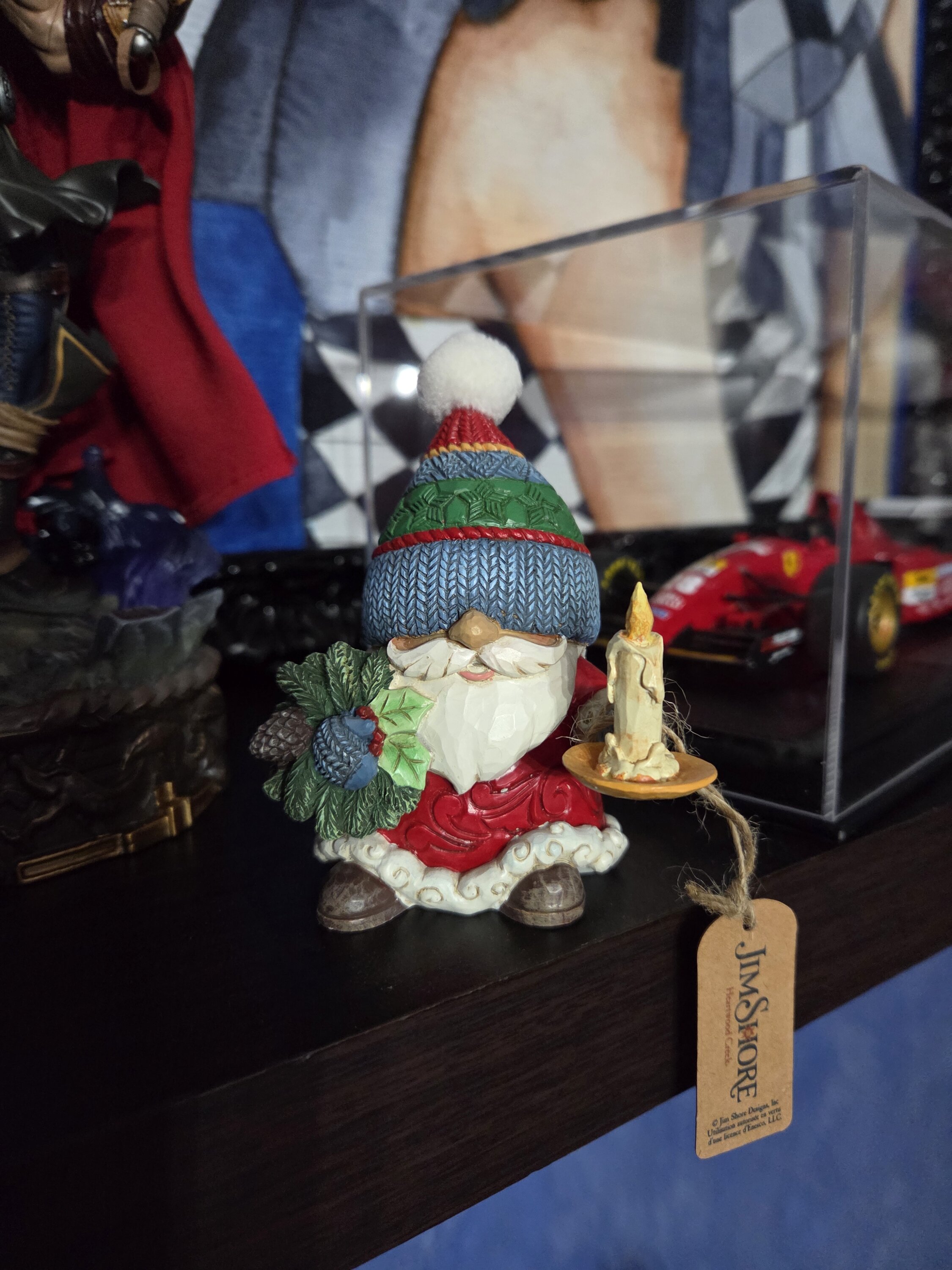 Dieser festliche Zwerg von Jim Shore bringt mit einer brennenden Kerze in der Hand und dem Hut über den Augen die Wärme der Feiertage. Bekleidet mit einem Mantel mit Blumenmuster und einem strukturierten Hut hält er einen Kranz in der Hand und ist bereit, den Ort fröhlich zu schmücken.