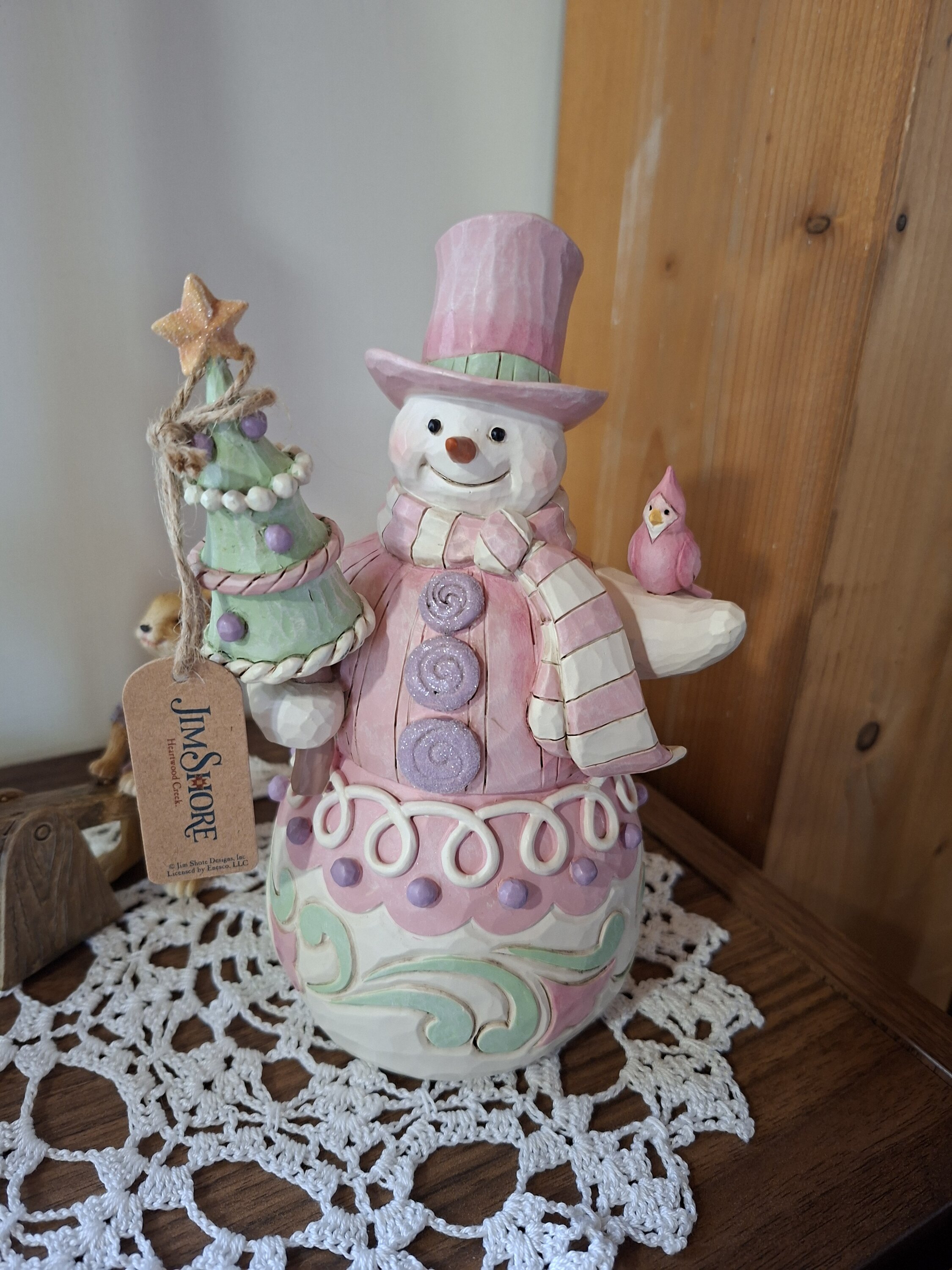 Dieser pastellrosa Schneemann aus der Heartwood Sweets Kollektion, entworfen von Jim Shore, ist mit seinen zarten Mustern, dem Glitzer und den Details voller Charme und spiegelt den Geist der Feiertage wider. Er hält liebevoll einen geschmückten Baum und einen Kardinal.