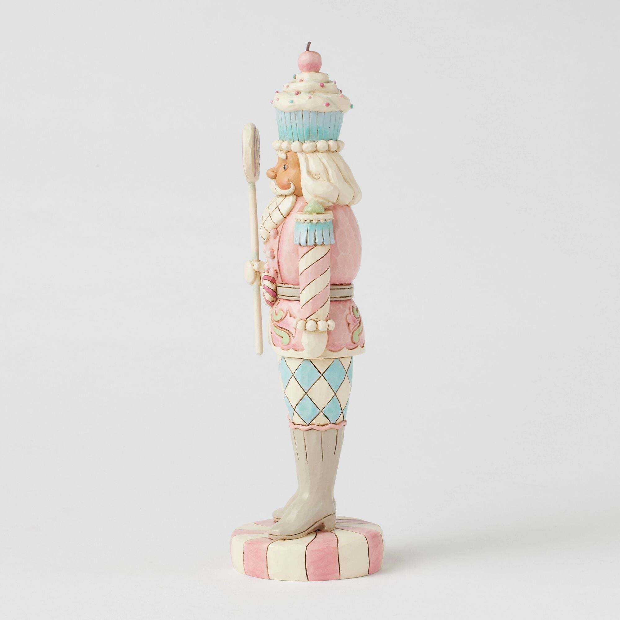 Diese Spielzeugsoldatenfigur aus der Heartwood Sweets Kollektion, entworfen von Jim Shore, steht stolz auf einem Pfefferminzsockel und hält einen Lutscherstab in der Hand. Mit seiner mit Zuckerguss und Süßigkeiten verzierten Uniform, der Pfefferminzgürtelschnalle und dem bezaubernden Cupcake-Hut bringt er einen Hauch von festlicher Stimmung.