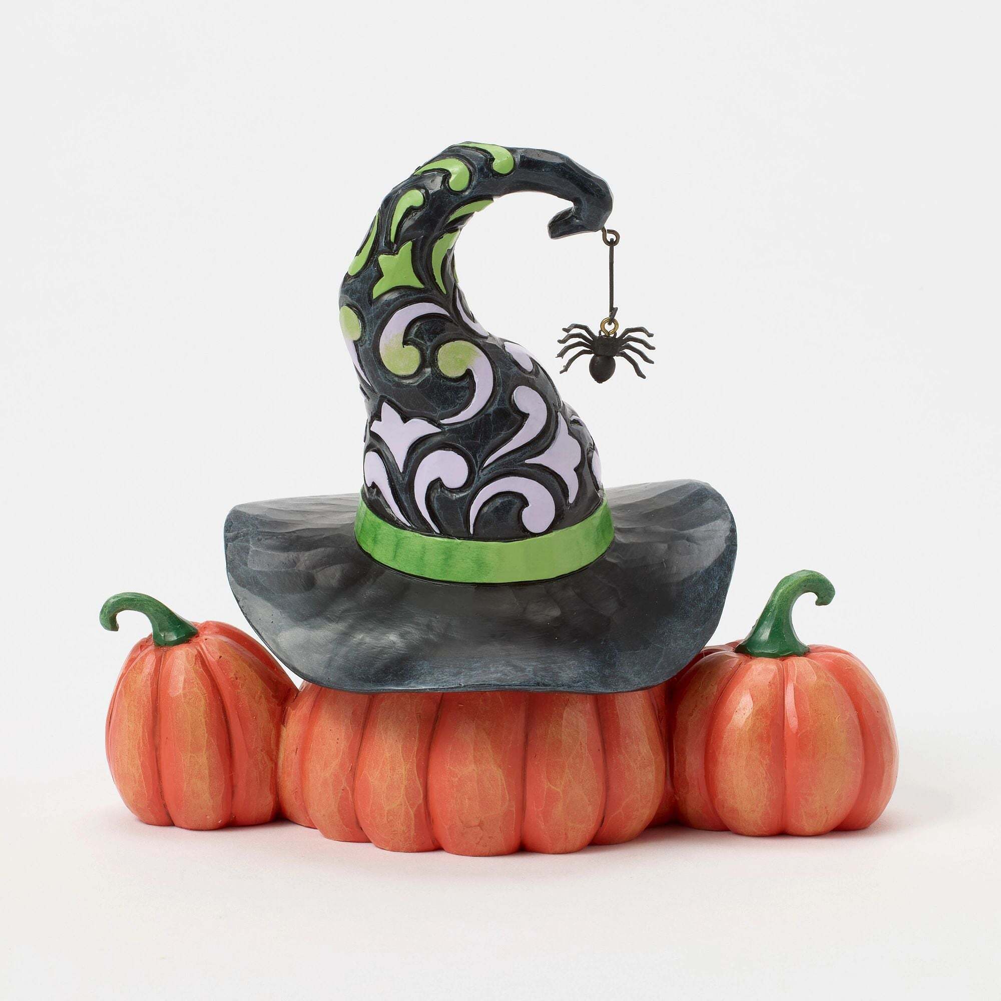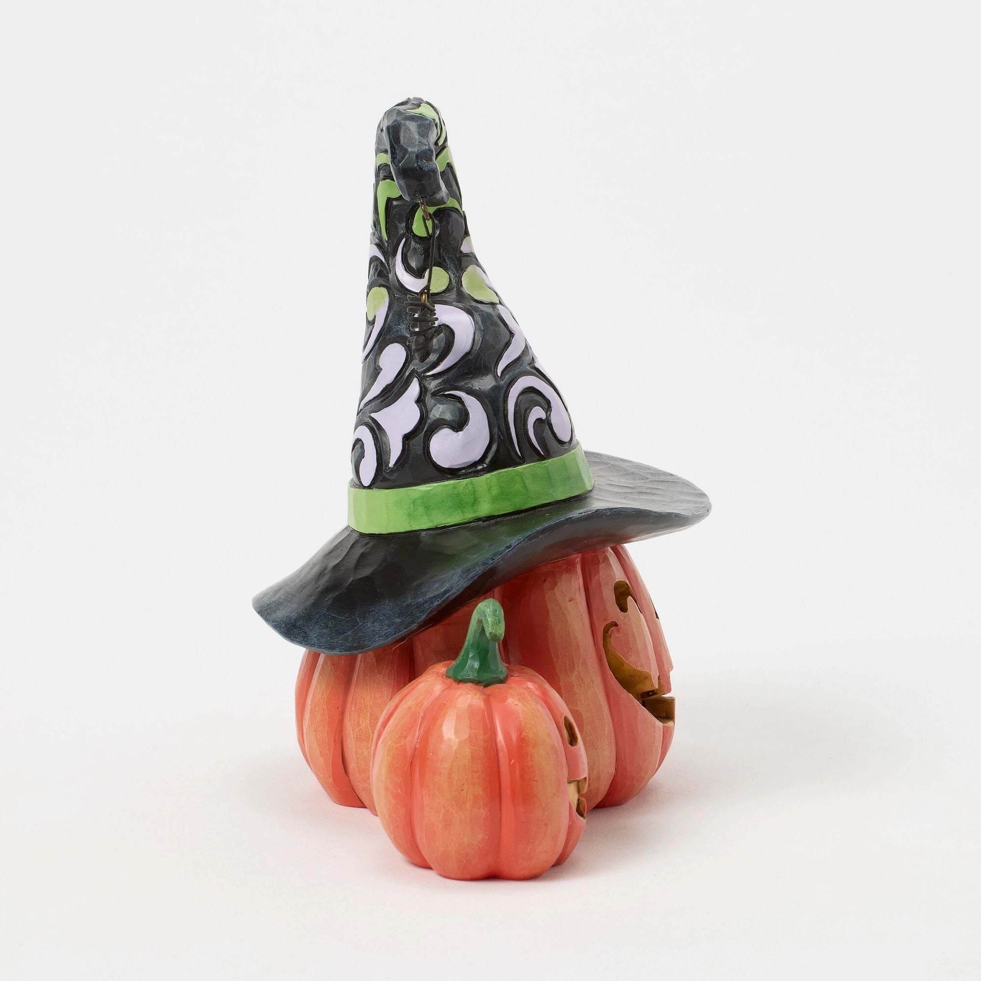 Kommen Sie mit diesen bezaubernden Figuren von Jim Shore in Halloween . Drei lächelnde Kürbisse sind abgebildet. Der größte in der Mitte trägt einen leuchtenden Hexenhut! Dieses Trio sorgt für eine festliche und zugleich geheimnisvolle Atmosphäre.