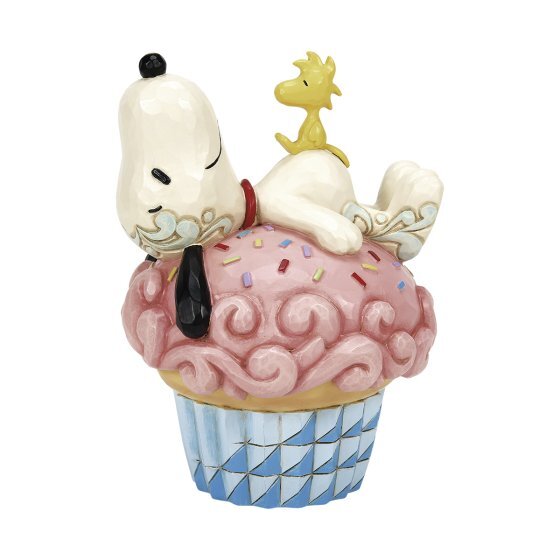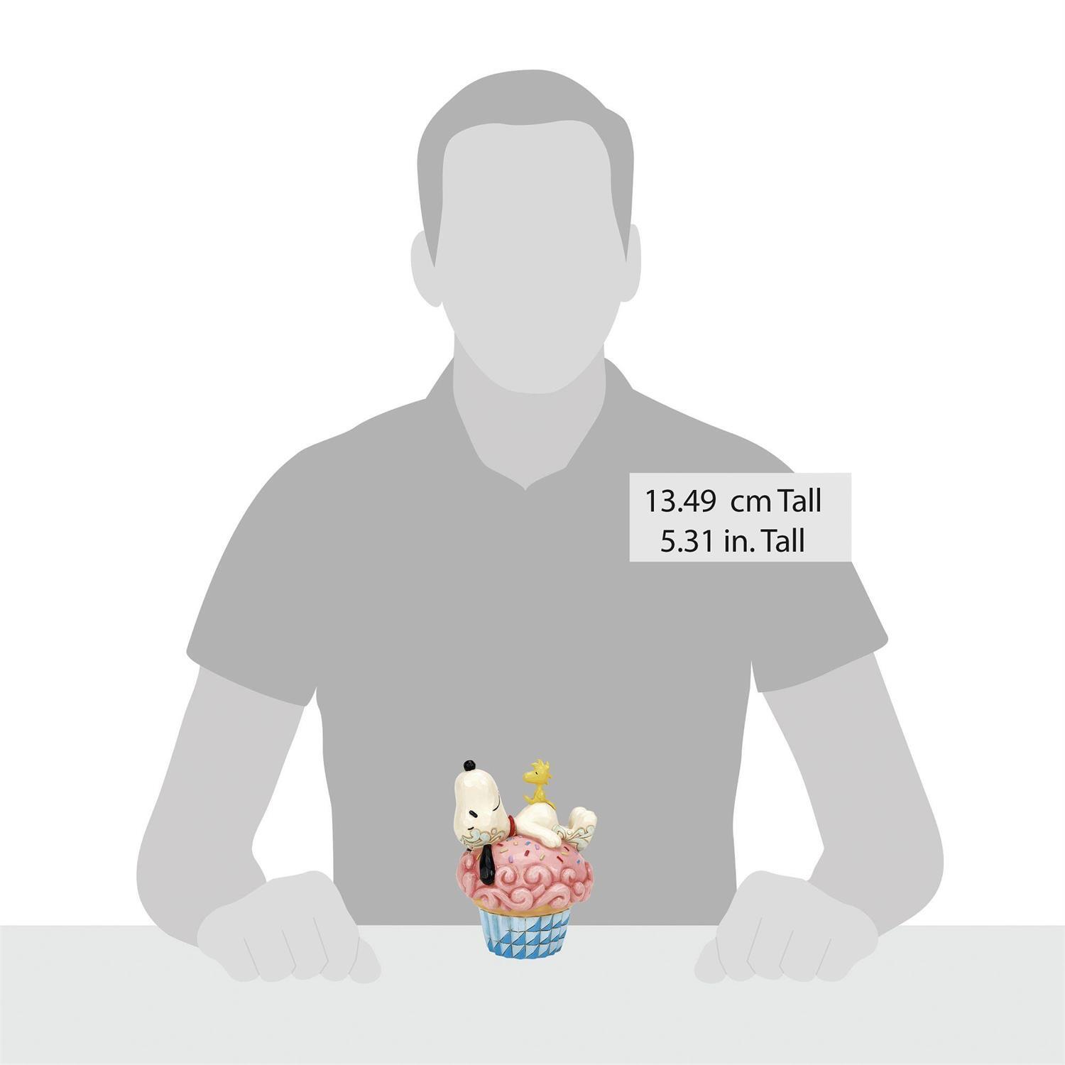 In Jim Shores bezauberndem Design macht Snoopy ein gemütliches Nickerchen auf einem großen, mit Streuseln bestreuten rosa Cupcake, komplett mit komplizierten Rosemaling-Details und verführerischem Zuckerguss. Um die Süße noch zu verstärken, gesellt sich Woodstock auf Snoopy zur Pyjamaparty.