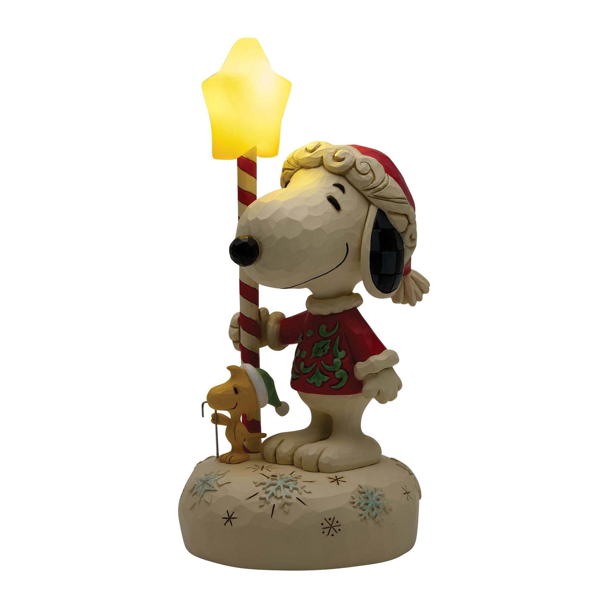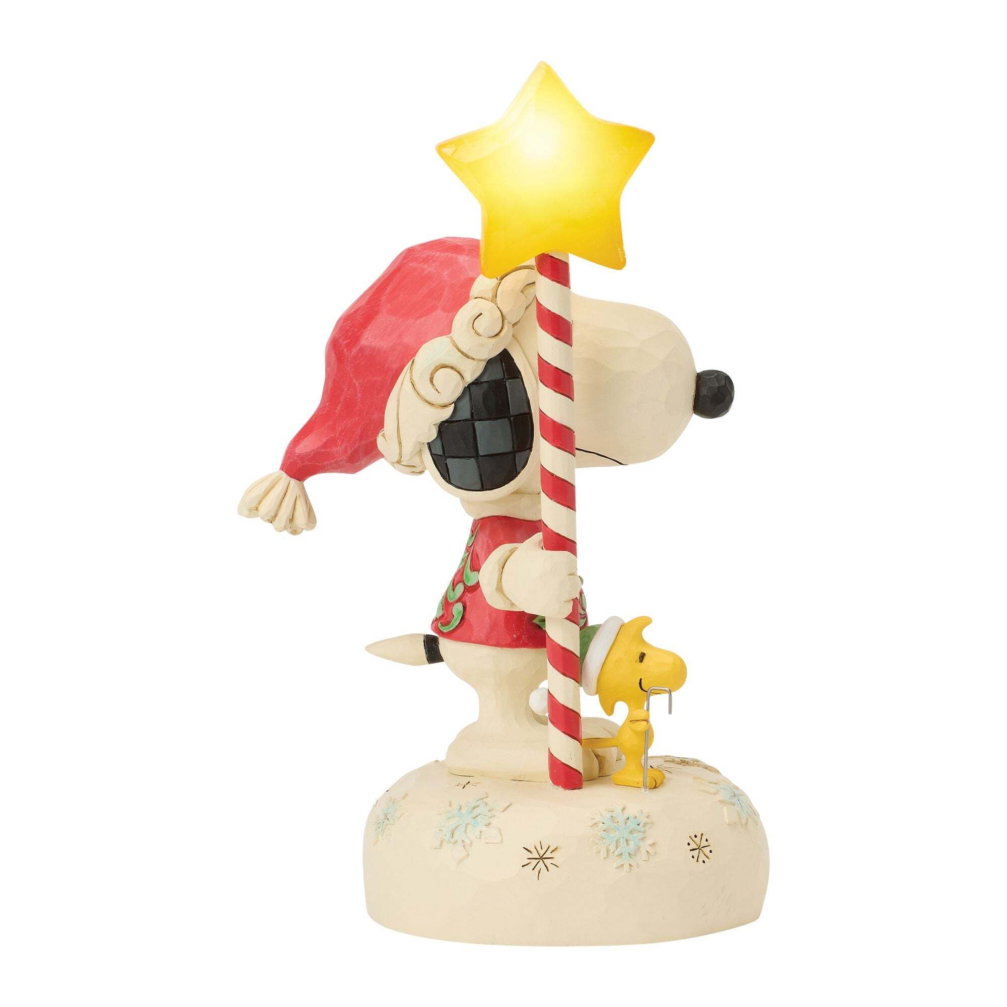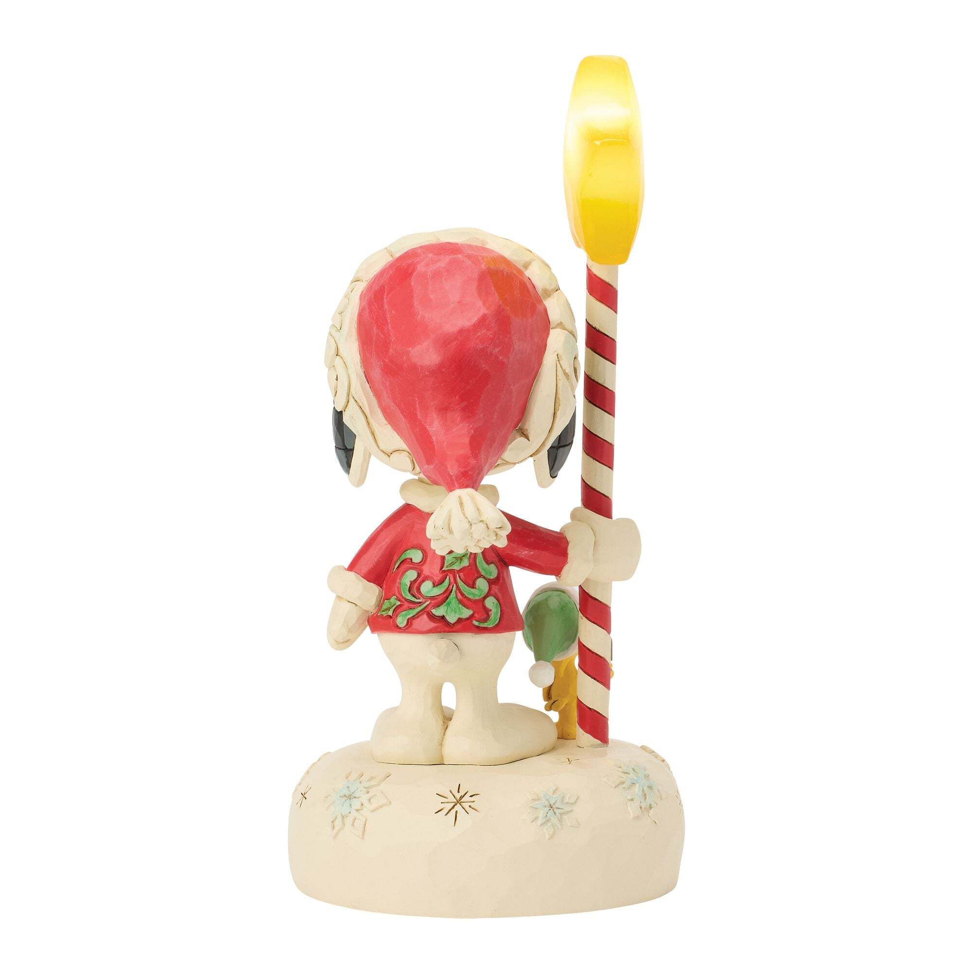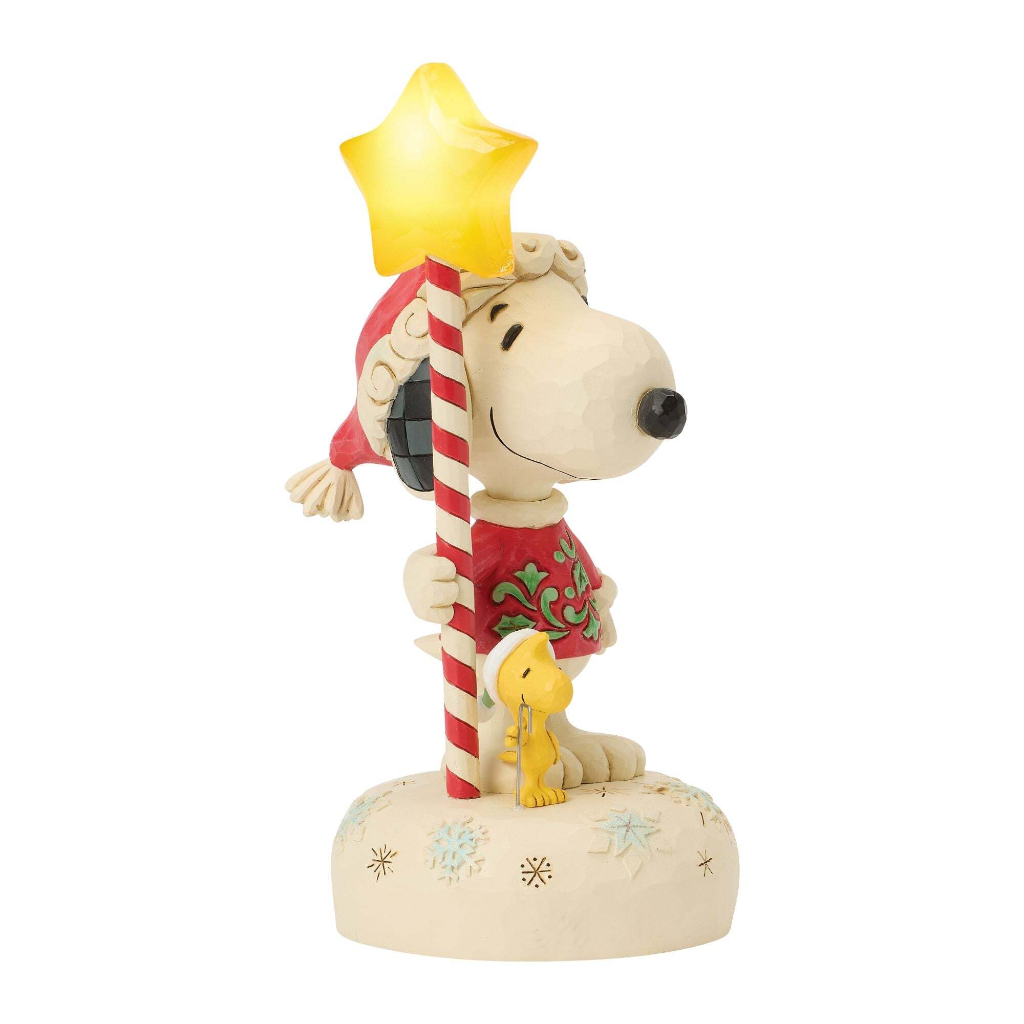 In diesem festlichen Design von Jim Shore hält Snoopy einen leuchtenden Zuckerstangenstab in Sternform. Mit LED-Lichtern und einem kuscheligen Rosenmuster-Pullover versprüht diese festliche Szene Weihnachtszauber und Peanuts-Nostalgie.