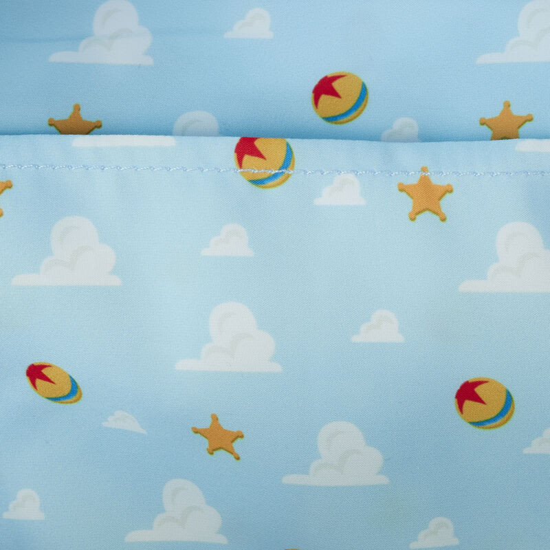 Der Loungefly Toy Story Movie Collab AOP-Nylon-Mini-Rucksack verfügt über glänzende silberne Beschläge und aufgedruckte Details. Beachten Sie das Innenfutter mit Loungefly-Logo.