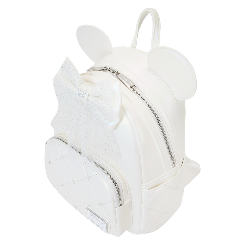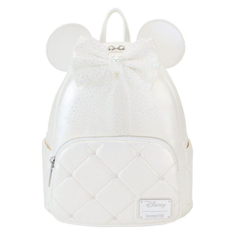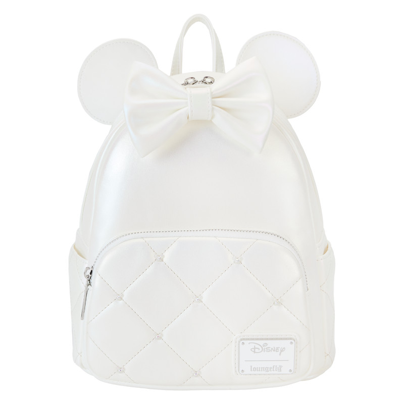 Juhuu! Sagen Sie „Ja!“ Unser Loungefly Disney Iridescent Wedding Mini-Rucksack ist bereit für einen besonderen Tag. Dieses perlweiße Accessoire mit schillernden Details ist eine elegante und lustige Ergänzung für einen festlichen Anlass.
