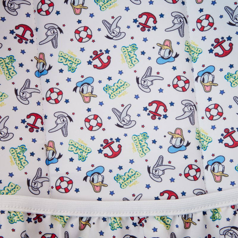 Steigen Sie mit Ihrer liebsten Begleitung durch den Spaß! Dieser große Rucksack ist perfekt, um Ihren Tag in Ihrer Rolle zu verbringen. Disneys Donald Duck erscheint als Motiv in Schwarzweiß – und in Farbe. Sie können ihn aus dem Kreis innerhalb eines Rettungsrings hervorlugen sehen – oder aus der Mitte des Steuerrads eines Schiffes. Andere nautische Motive begleiten ihn auf diesem blauen Rucksack mit rotem Rand. Und wenn Sie sich entscheiden, das Boot zum Schaukeln zu bringen, ist die Vordertasche perfekt, um kleinere Gegenstände während Ihrer Reisen sicher aufzubewahren. Schlagen Sie Wellen, während Sie Donald Ducks 90. Geburtstag mit Stil feiern.