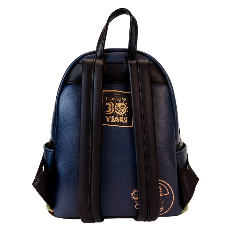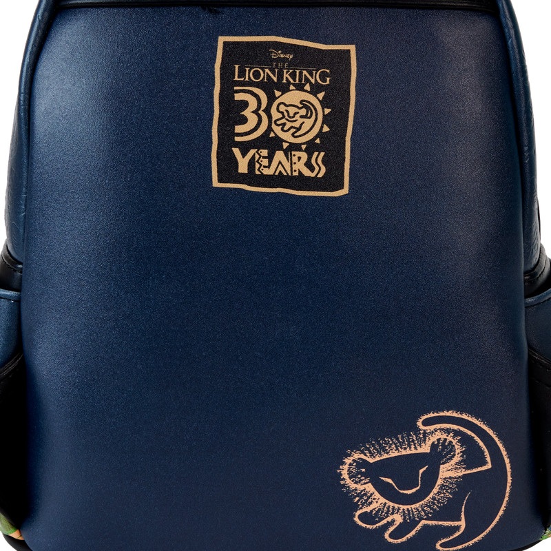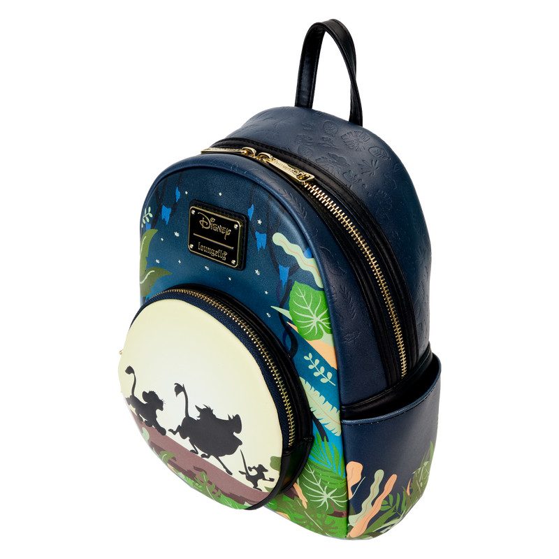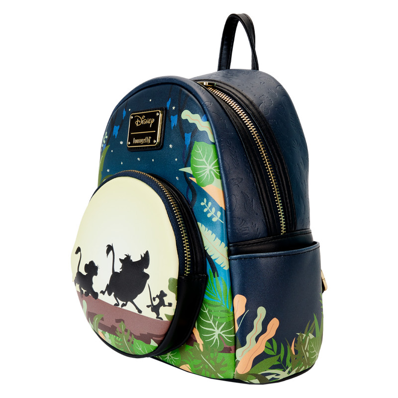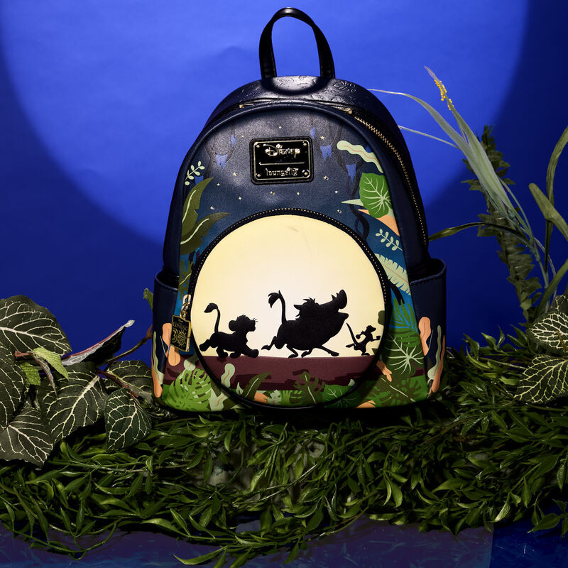 Der Loungefly Lion King 30th Anniversary Hakuna Matata Silhouette Mini-Rucksack ist aus veganem Leder (Polyurethan) gefertigt. Die Tasche hat verstellbare Schultergurte und glänzende Goldbeschläge. Zu den weiteren Merkmalen gehören geprägte, im Dunkeln leuchtende, LED-Lichter und gedruckte Details. Beachten Sie das passende Innenfutter.