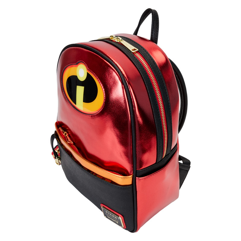 Der Loungefly Pixar The Incredible Mini-Rucksack mit Münzbeutel besteht aus veganem Metallic-Leder (Polyurethan), hat verstellbare Schultergurte, einen abnehmbaren Münzbeutel, glänzende Goldbeschläge, eine Reißverschlusstasche vorne, eine versteckte Vordertasche und seitliche Einschubtaschen, Applikationen, Prägungen, LED-Licht und aufgedruckte Details sowie eine passende Beleuchtung zum 20. Jubiläum.