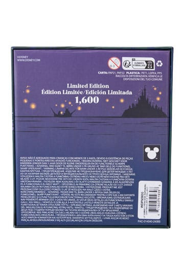 Die Loungefly Disney Rapunzel-Anstecknadel verfügt über eine goldfarbene Metallrückseite, die typische Funko-Kronenprägung mit der geprägten Krone auf der Rückseite, die die Stückzahl der limitierten Auflage angibt, Emaille, lentikulär und gedruckte Details