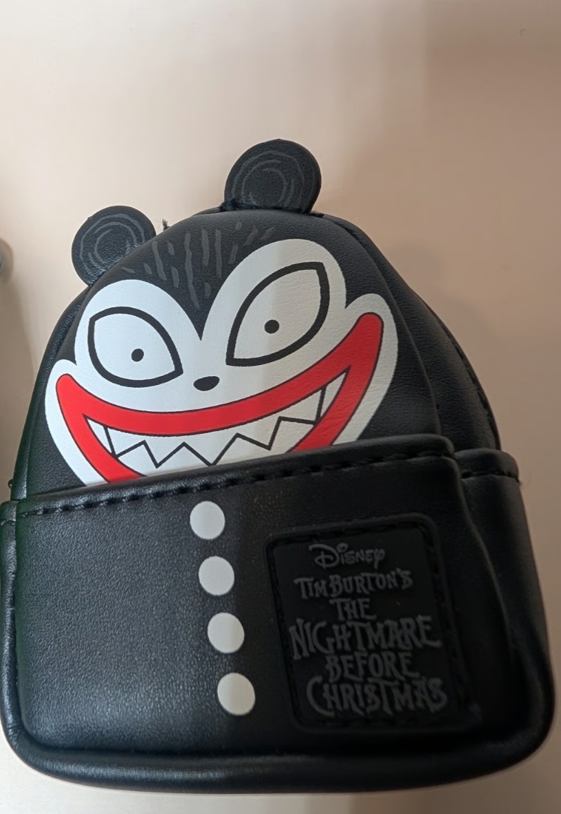 Eigenschaften: Veganes Leder (Polyurethan), Reißverschluss zum Sichern von Gegenständen, metallfarbene Beschläge, Applikationen und aufgedruckte Details mit im Dunkeln leuchtenden Funktionen für den Oogie Boogie -Anhänger, passendes Innenfutter