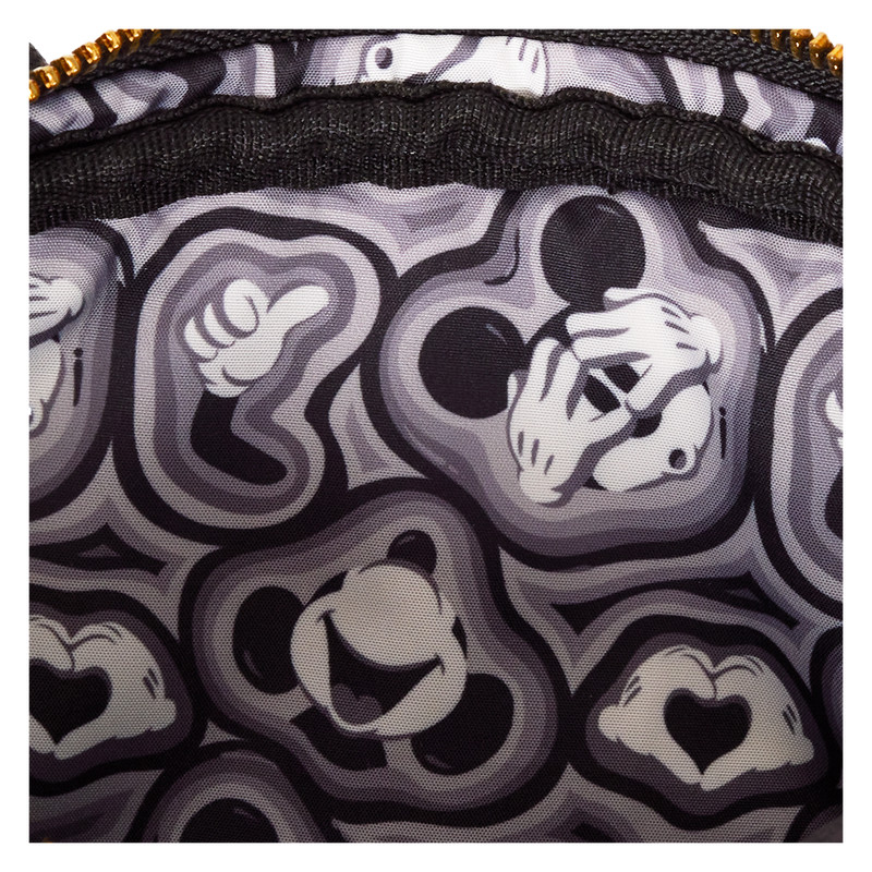 Eigenschaften: verstellbarer und abnehmbarer Riemen mit einem Aufdruck von Mickey Maus' Ohren, abnehmbares, wendbares Münzfach, goldfarbene Metallbeschläge, bedruckte, gestickte und applizierte Details, passendes Innenfutter