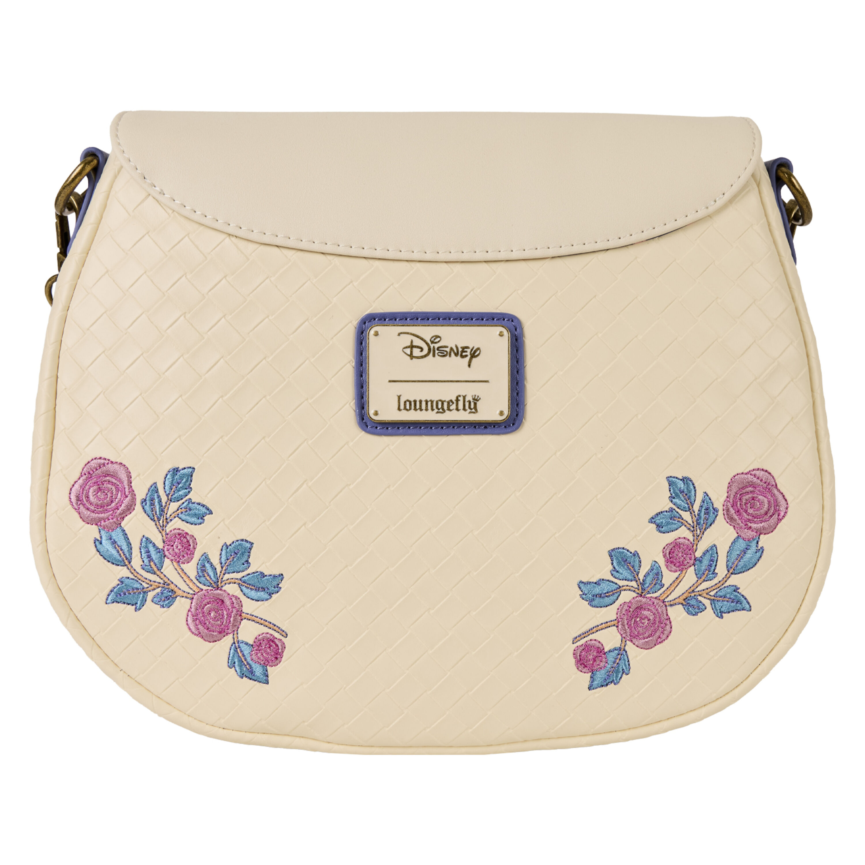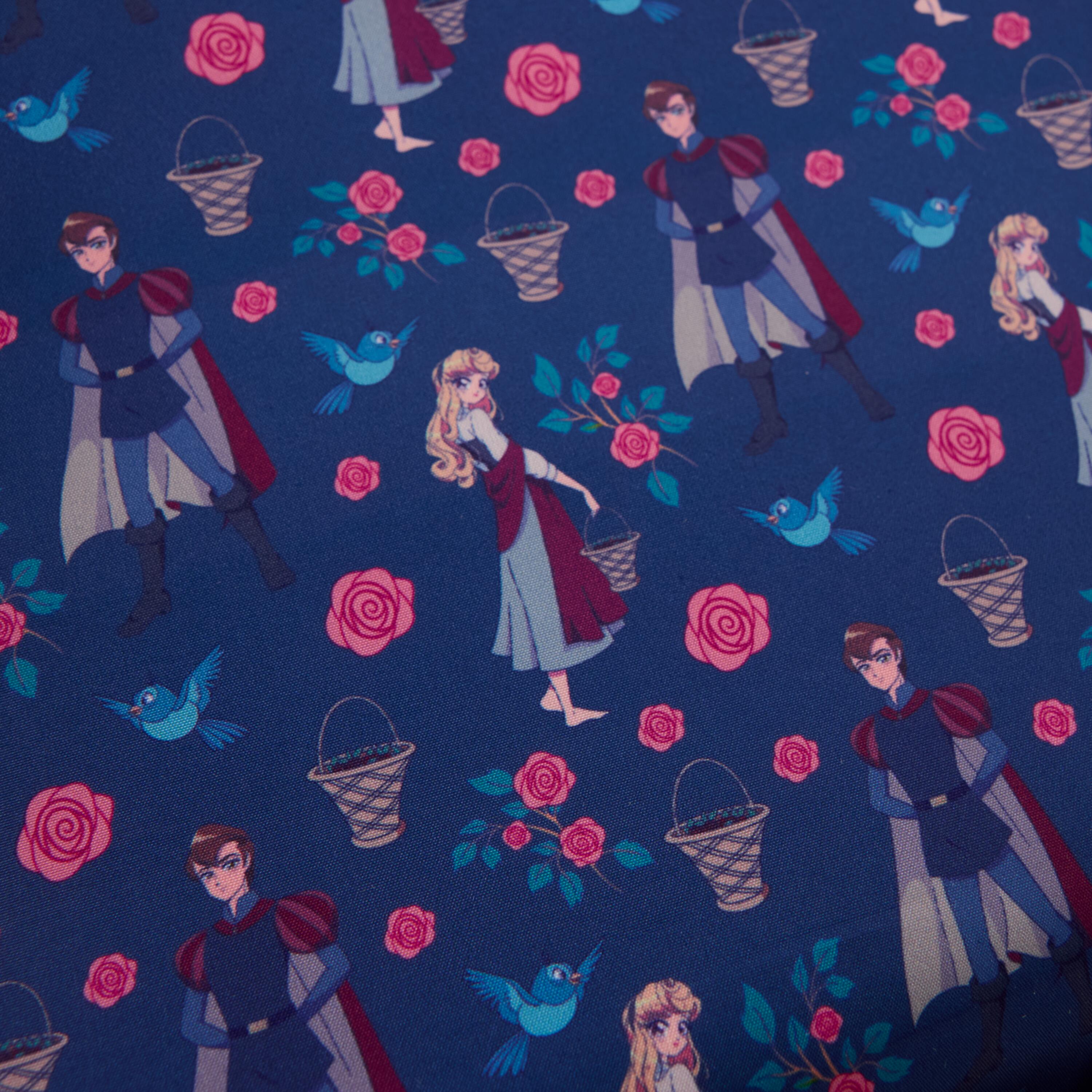 Ahhhh, wir lieben verträumte Blumenmomente! Disneys Prinz Phillip und Prinzessin Aurora lächeln von der Vorderseite dieser Tasche. Sie sind von gestickten Rosen umgeben. Auf der Frontklappe befindet sich außerdem ein Emaille-Anhänger in Form einer Rose.