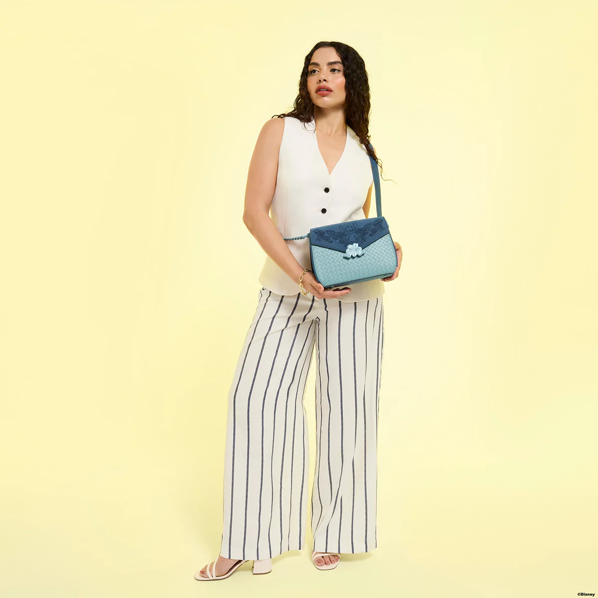 Die vordere Klappe dieser umhängetasche ist mit einem geformten Metallanhänger in Form einer Hibiskusblüte versehen. Darüber finden Sie gestickte Blumendetails – Stitch steht in der Mitte und sieht so süß aus!